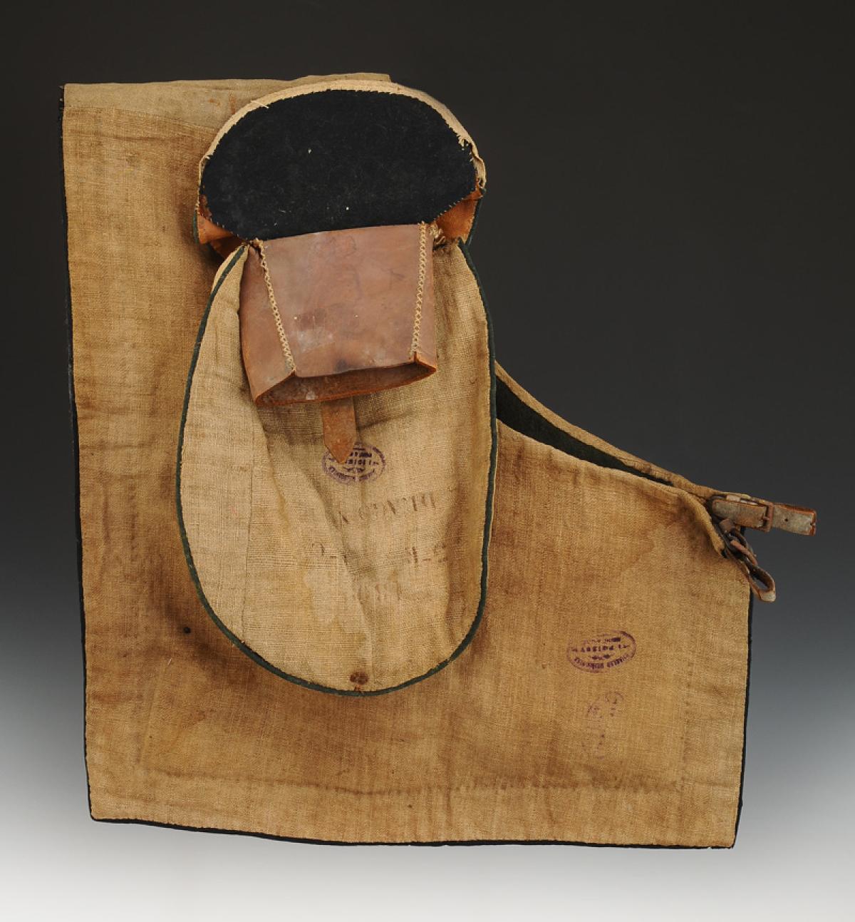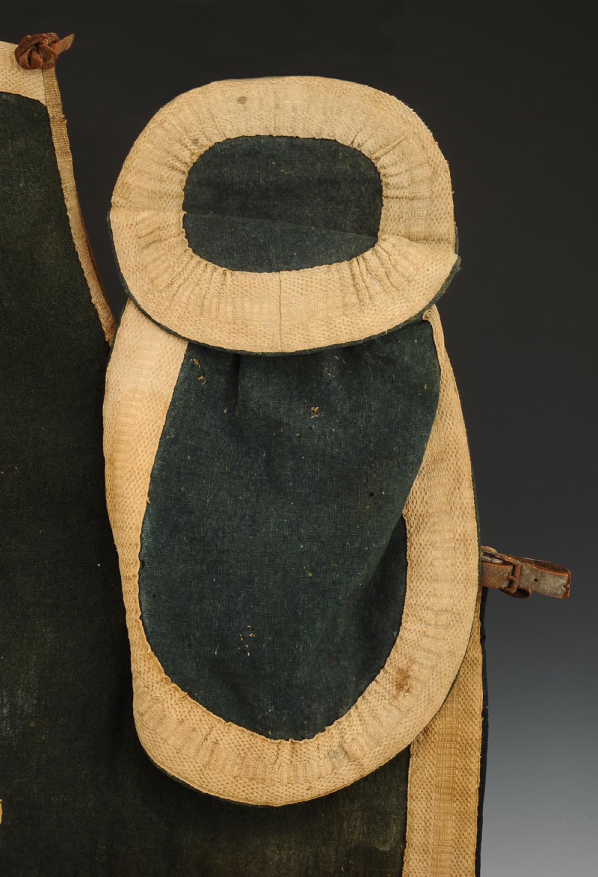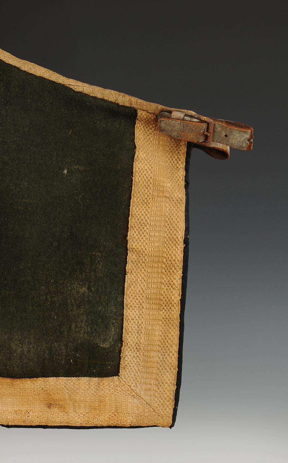 HOUSSE-CROUPELIN en drap vert bordé d'un galon tissé de fils blancs (largeur 4 cm), bords inférieurs en pointes. Numéro « 23 » découpé en drap blanc, H du chiffre 2 : 9 cm, largeur du chiffre 2 : 7 cm, H du chiffre 3 : 9 cm, largeur du chiffre 3 : 6 cm.