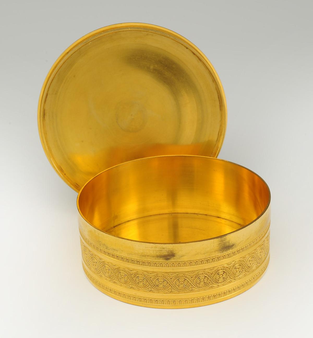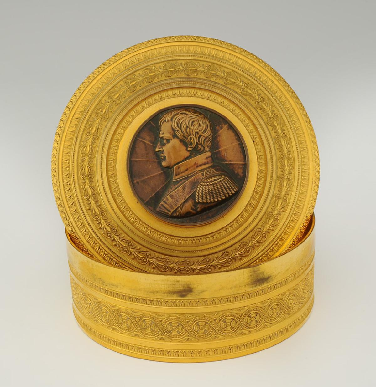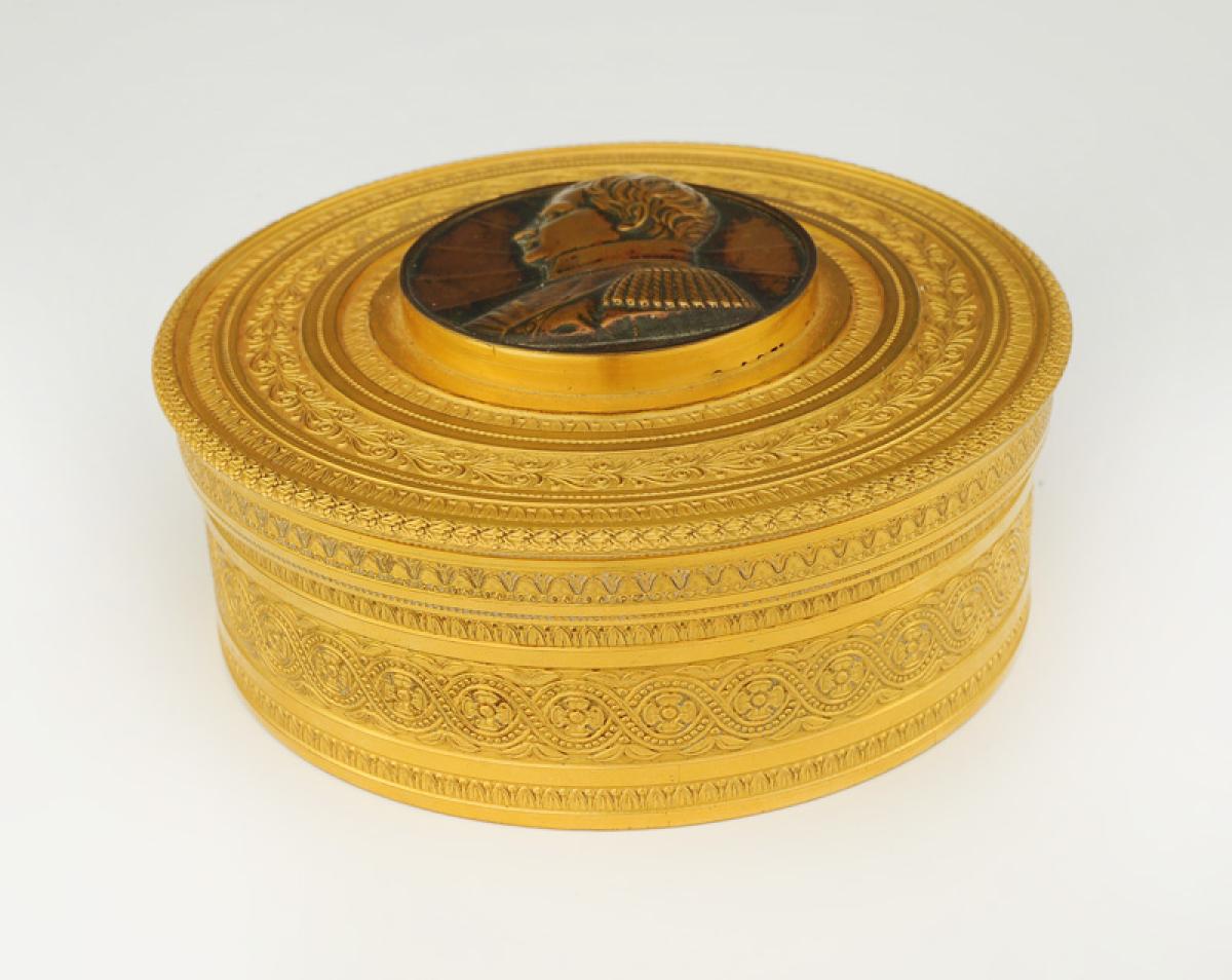 De forme ronde, en bronze doré, avec couvercle décoré d'une médaille en bronze patiné au profil de l'Empereur Napoléon 1er.