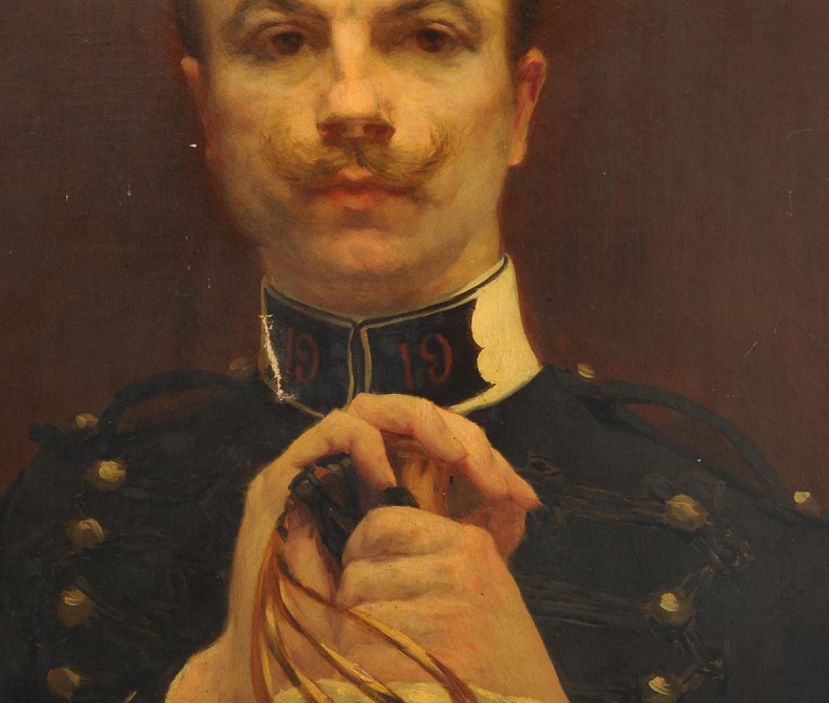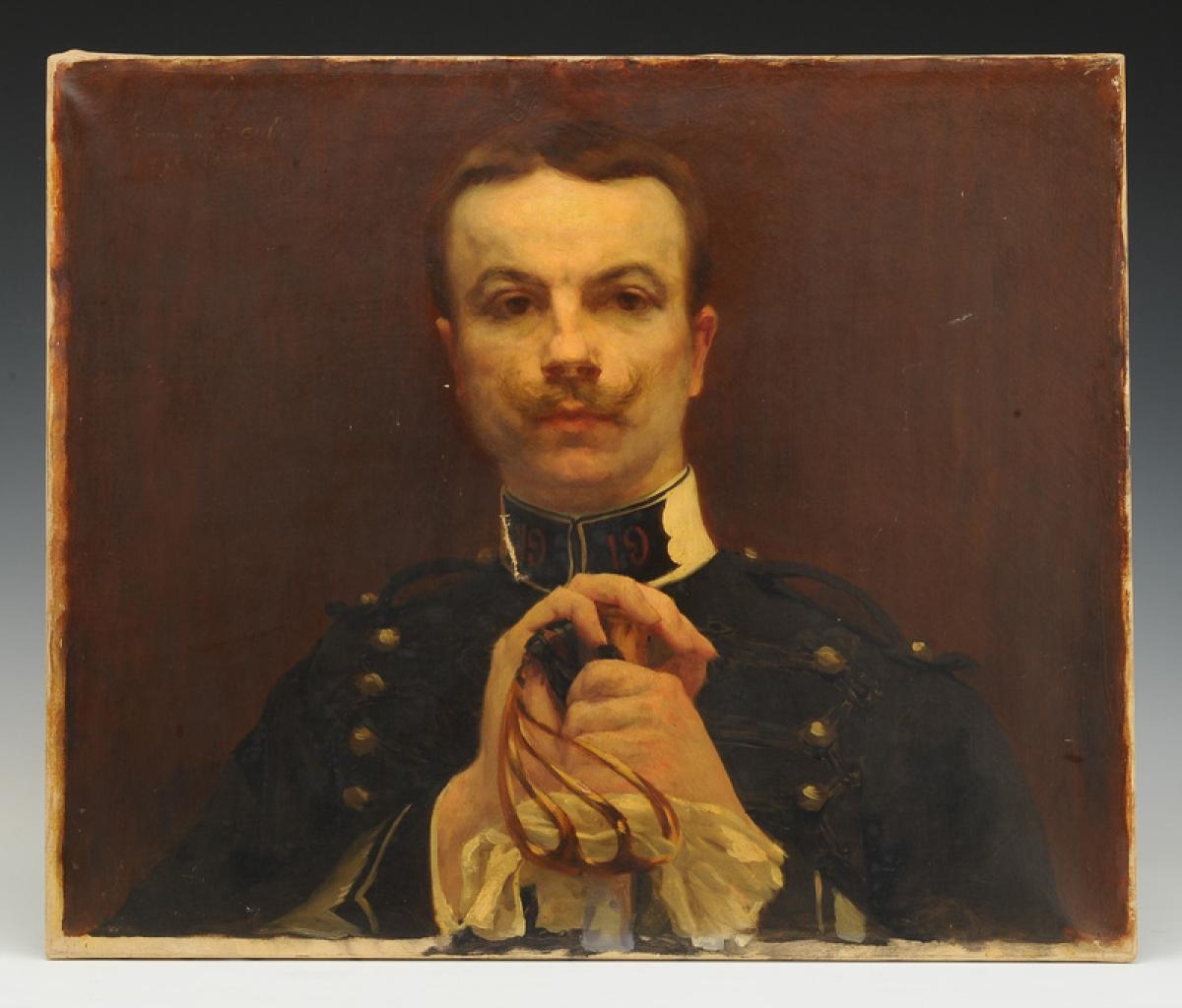 Huile sur toile. Portrait en buste d'un dragon du 19ème régiment, les mains posées sur la garde de son sabre. H 564 cm x 65 cm.