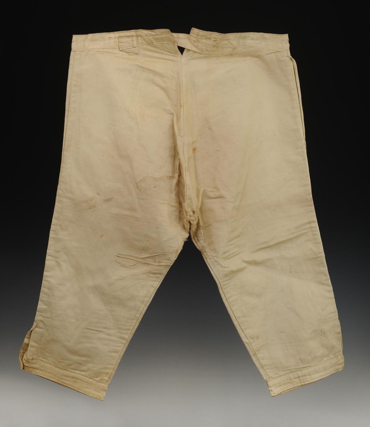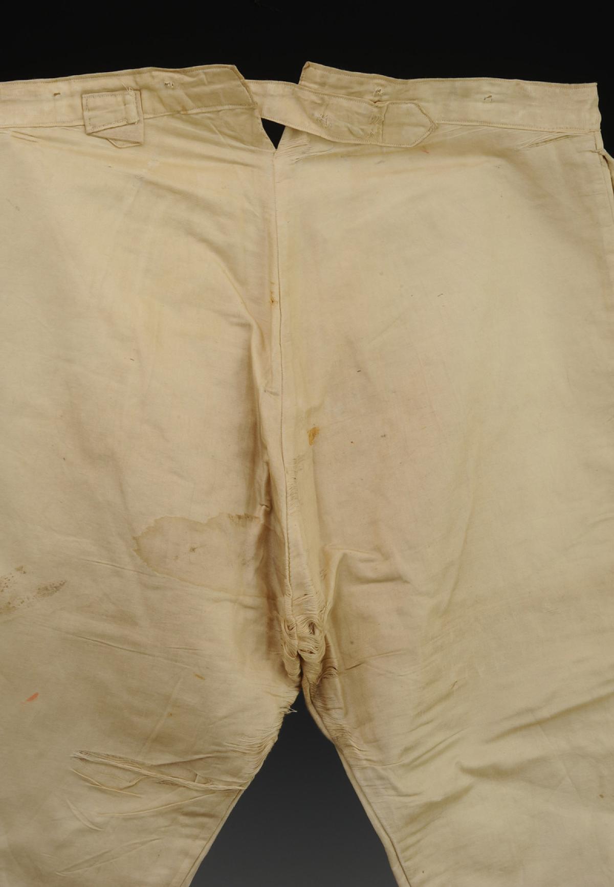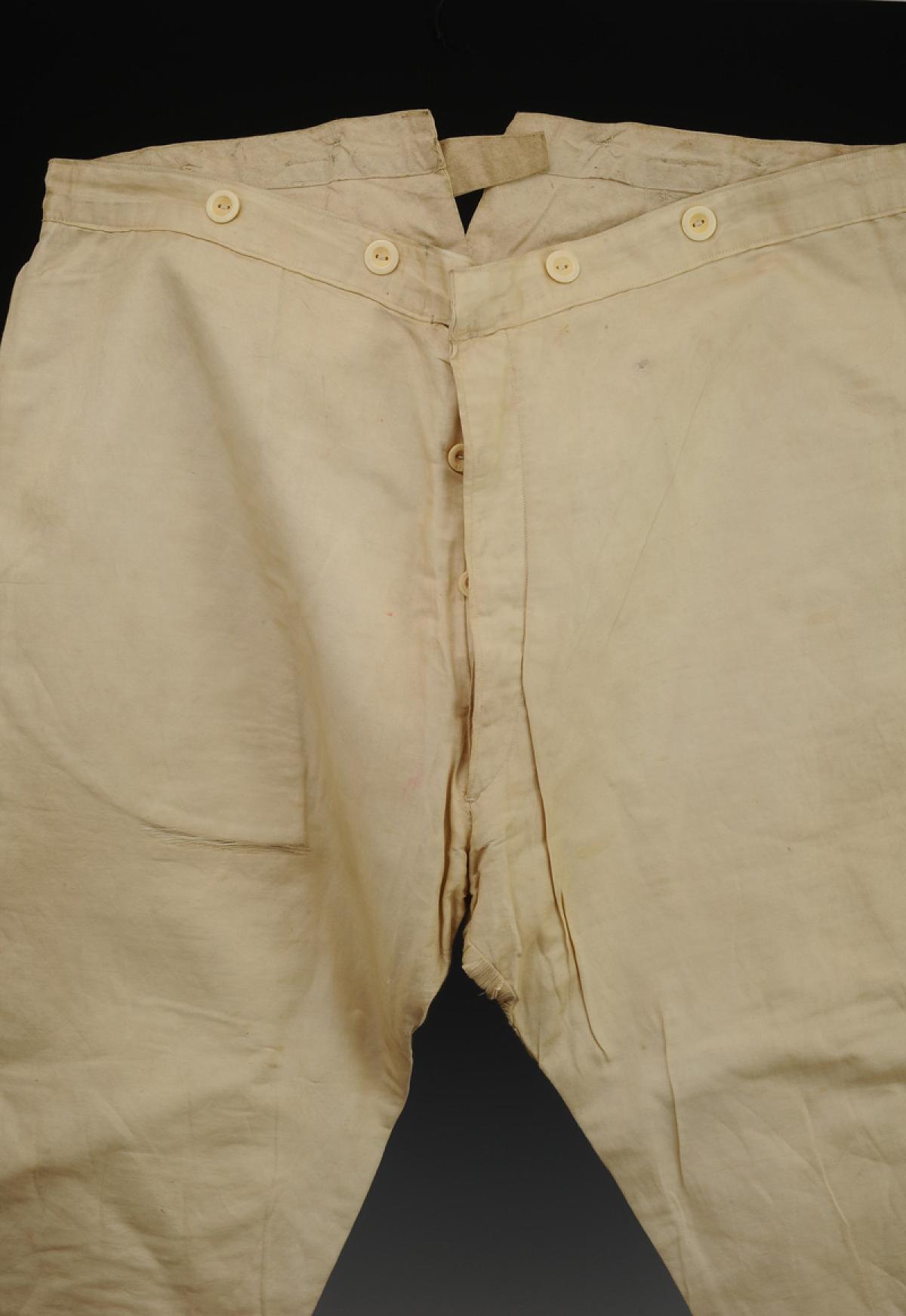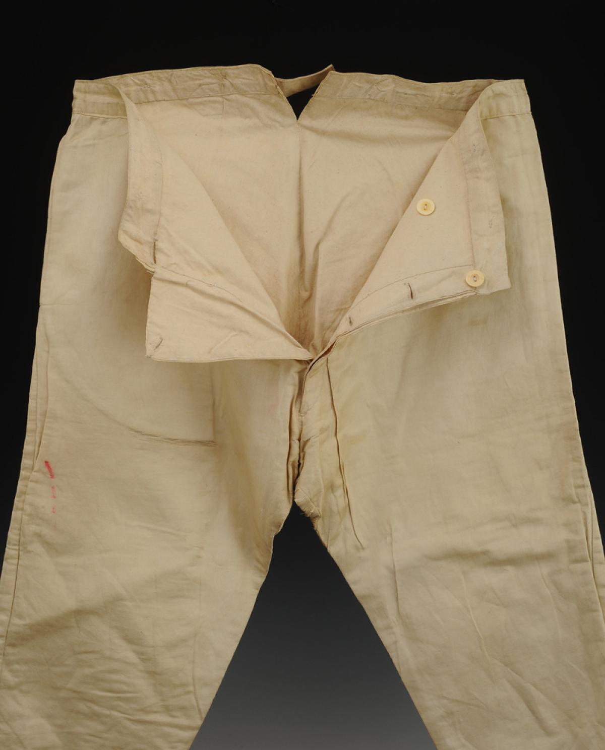 En coton d'aspect soyeux, fermant à l'avant par une braguette à quatre boutons en os.