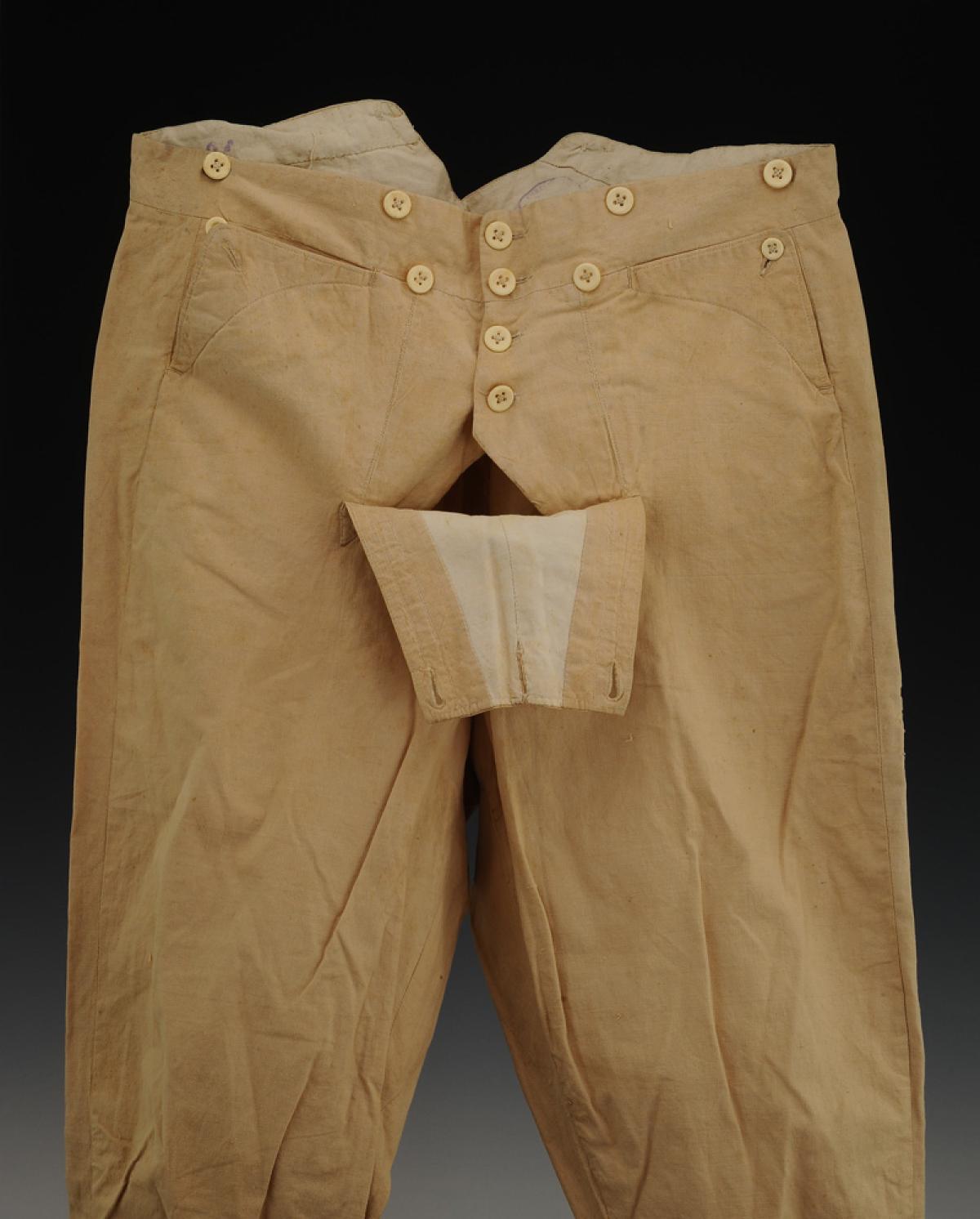 En toile beige clair, complète de ses boutons en os. Bas des jambes garni de boutons en bois recouvert de toile beige.