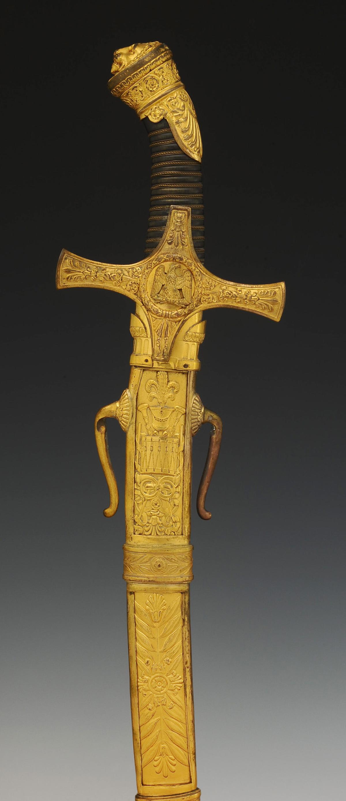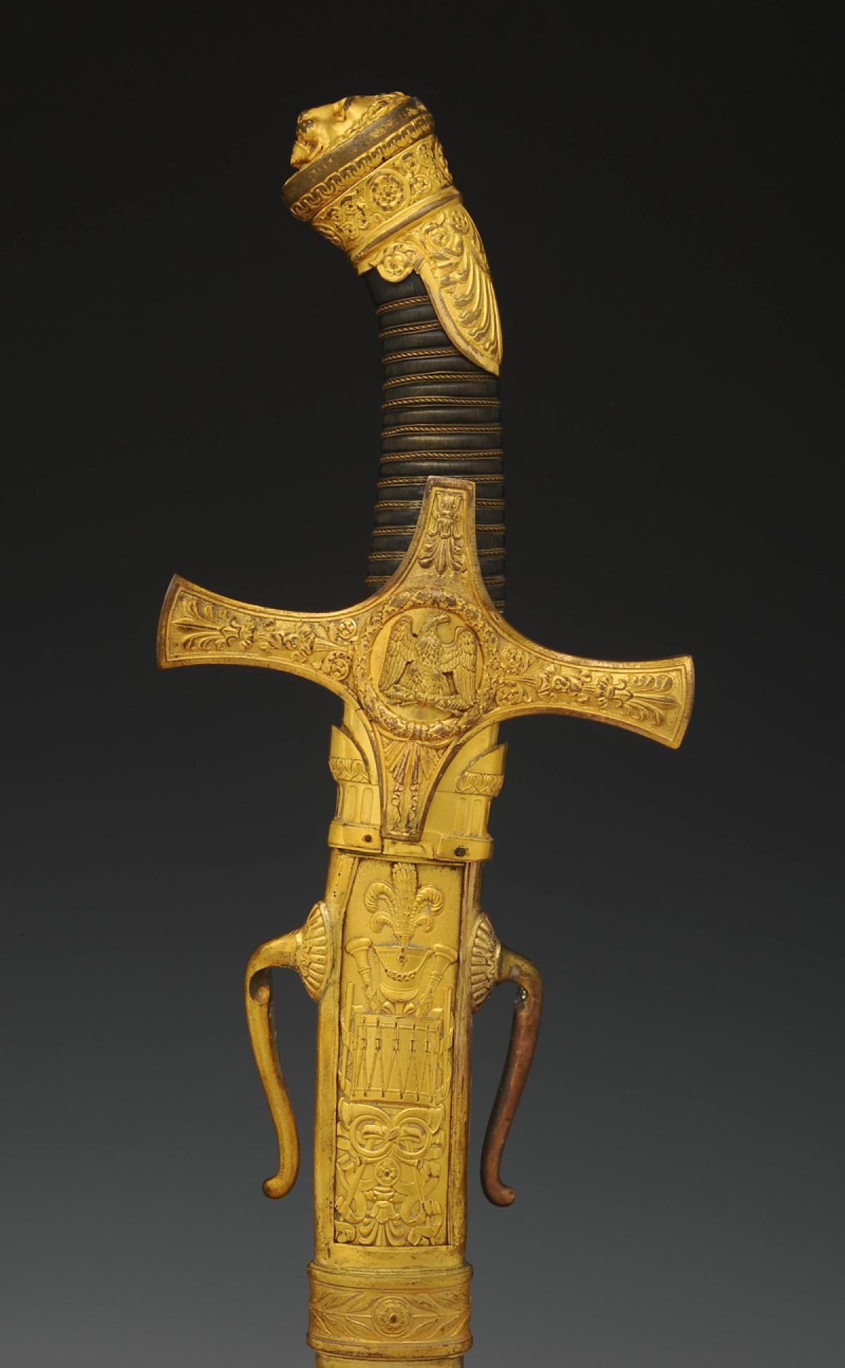 Monture « à la Turque ». Calotte à courte queue, moulée de fleurs et rosaces et feuilles d'acanthe, à couvercle en tête de lion. Poignée de bois gainé de cuir filigrané de cuivre argenté. Croisière symétrique moulée au centre d'une couronne de feuilles de chêne sur laquelle est rapportée une aigle impériale non couronnée aux ailes déployées, unie au revers. Lame de cavalerie légère unie à pans creux et gouttières, longueur 81,2 cm. Fourreau à fût de bois gainé de laiton ouvragé, à plaques estampées ajustées dans des fenêtres, la plaque supérieure flanquée des deux crochets de suspension est fondue et ciselée d'attributs : shako à plumet, tambour, hautbois, parmi des feuillages et autres arabesques ; fourreau signé à l'arrière de la chape « Manceaux / à Paris ». Trois bracelets de renfort présentent une course de lauriers. Le bout de laiton fondu est ciselé des deux côtés avec une tête de lion à l'extérieur.