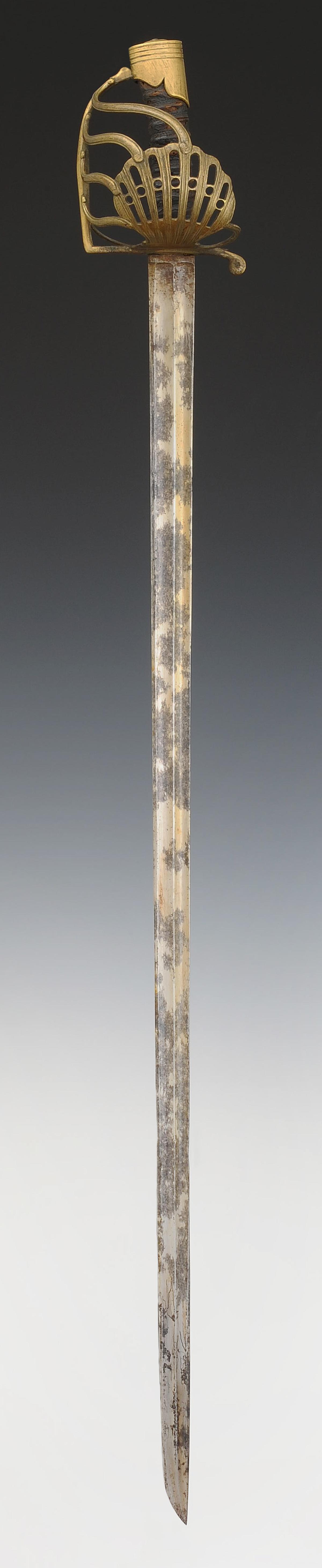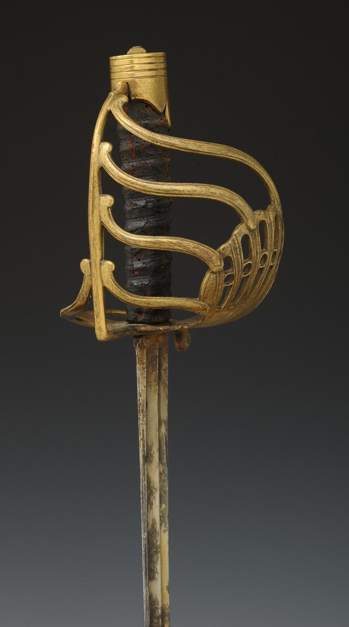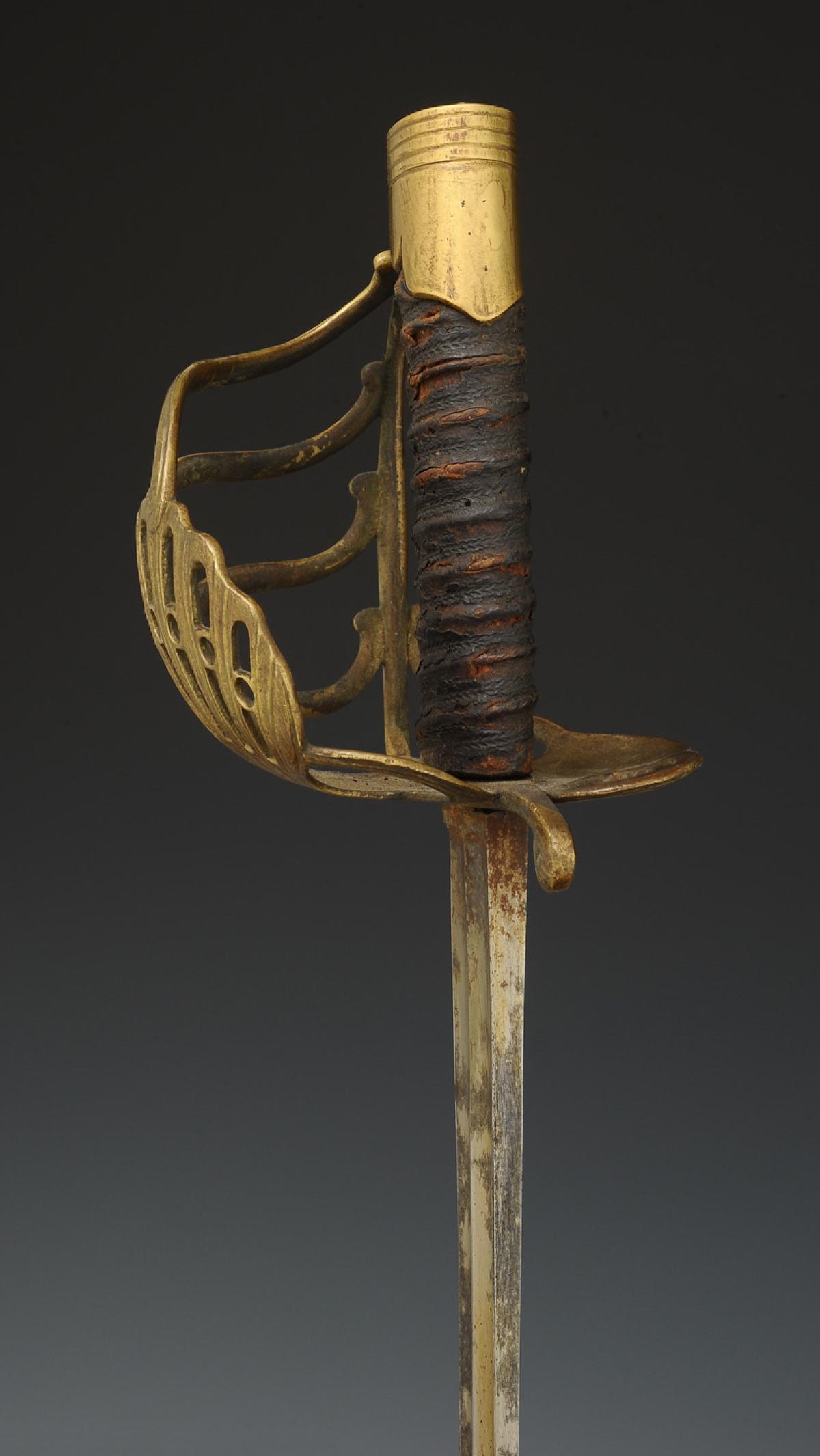 Monture en laiton. Garde à six branches (une branche principale, quatre branches secondaires à l'avant, une branche secondaire à l'arrière) formant coquille en forme de palmette ajourée dite « à garde de bataille ». Calotte à courte queue décorée aux traits. Poignée en bois de hêtre gainé de veau ciré noir. Lame droite à double gouttière, de 89,2 cm de longueur. Fourreau en cuir verni noir à trois garnitures de laiton aux bords festonnés, chape avec entrée de cuvette saillante, pitons de bélière et anneaux en laiton, bout du fourreau avec bouterolle en laiton.