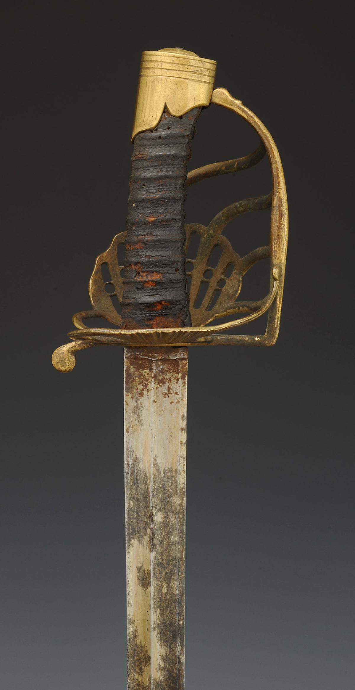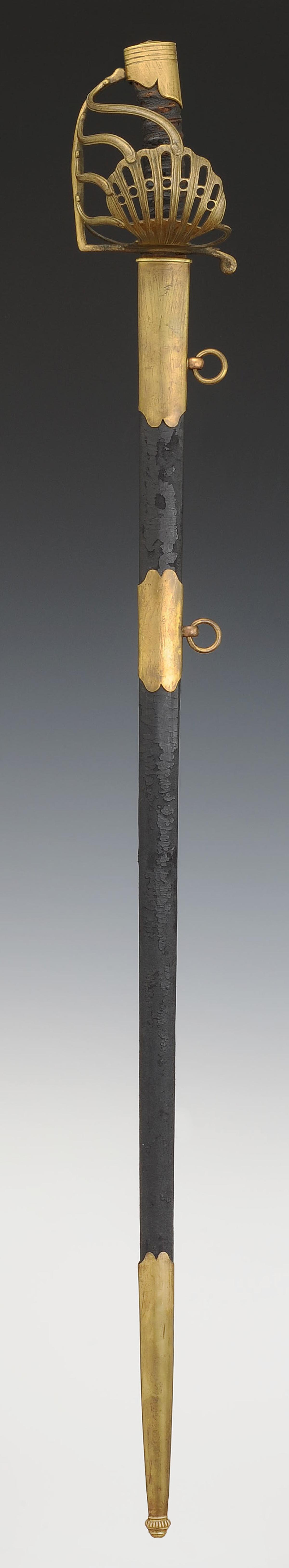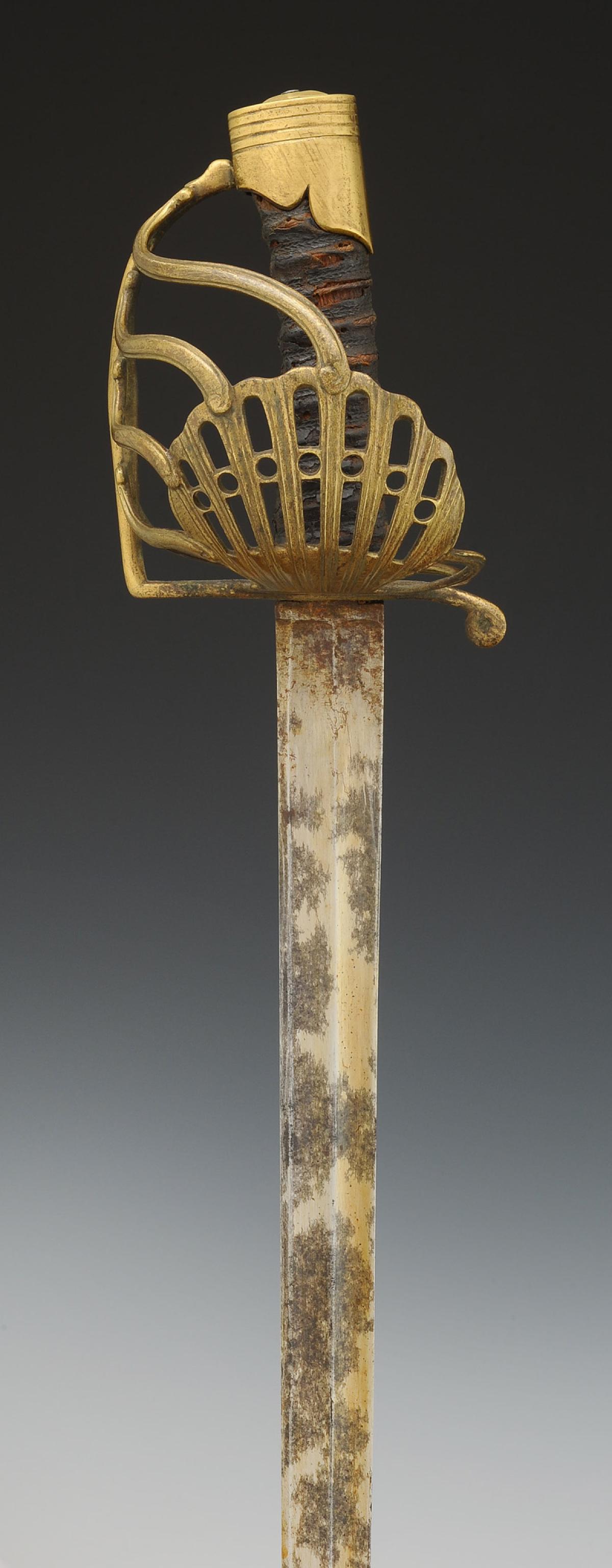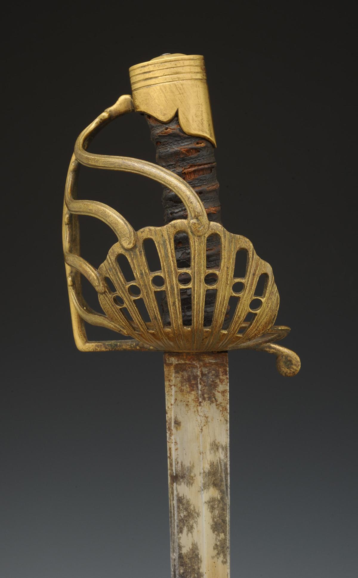 Monture en laiton. Garde à six branches (une branche principale, quatre branches secondaires à l'avant, une branche secondaire à l'arrière) formant coquille en forme de palmette ajourée dite « à garde de bataille ». Calotte à courte queue décorée aux traits. Poignée en bois de hêtre gainé de veau ciré noir. Lame droite à double gouttière, de 89,2 cm de longueur. Fourreau en cuir verni noir à trois garnitures de laiton aux bords festonnés, chape avec entrée de cuvette saillante, pitons de bélière et anneaux en laiton, bout du fourreau avec bouterolle en laiton.
