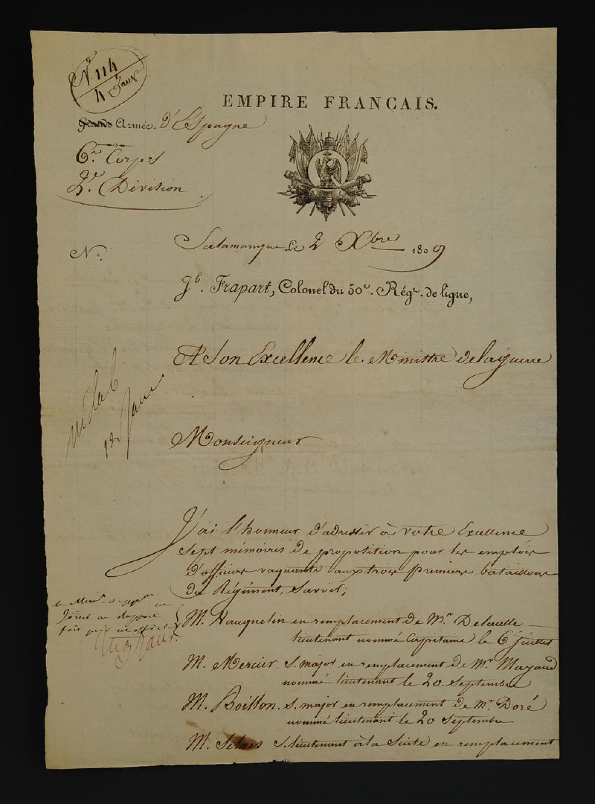 Armée d'Espagne. 50ème Régiment de ligne. LETTRE AUTOGRAPHE SIGNÉE Jh FRAPART, colonel dudit Régiment, ADRESSÉE AU MINISTRE DE LA GUERRE, proposant sept noms pour des emplois d'officiers vacants. Salamanque, le 2 Xbre 1809. 18911-23