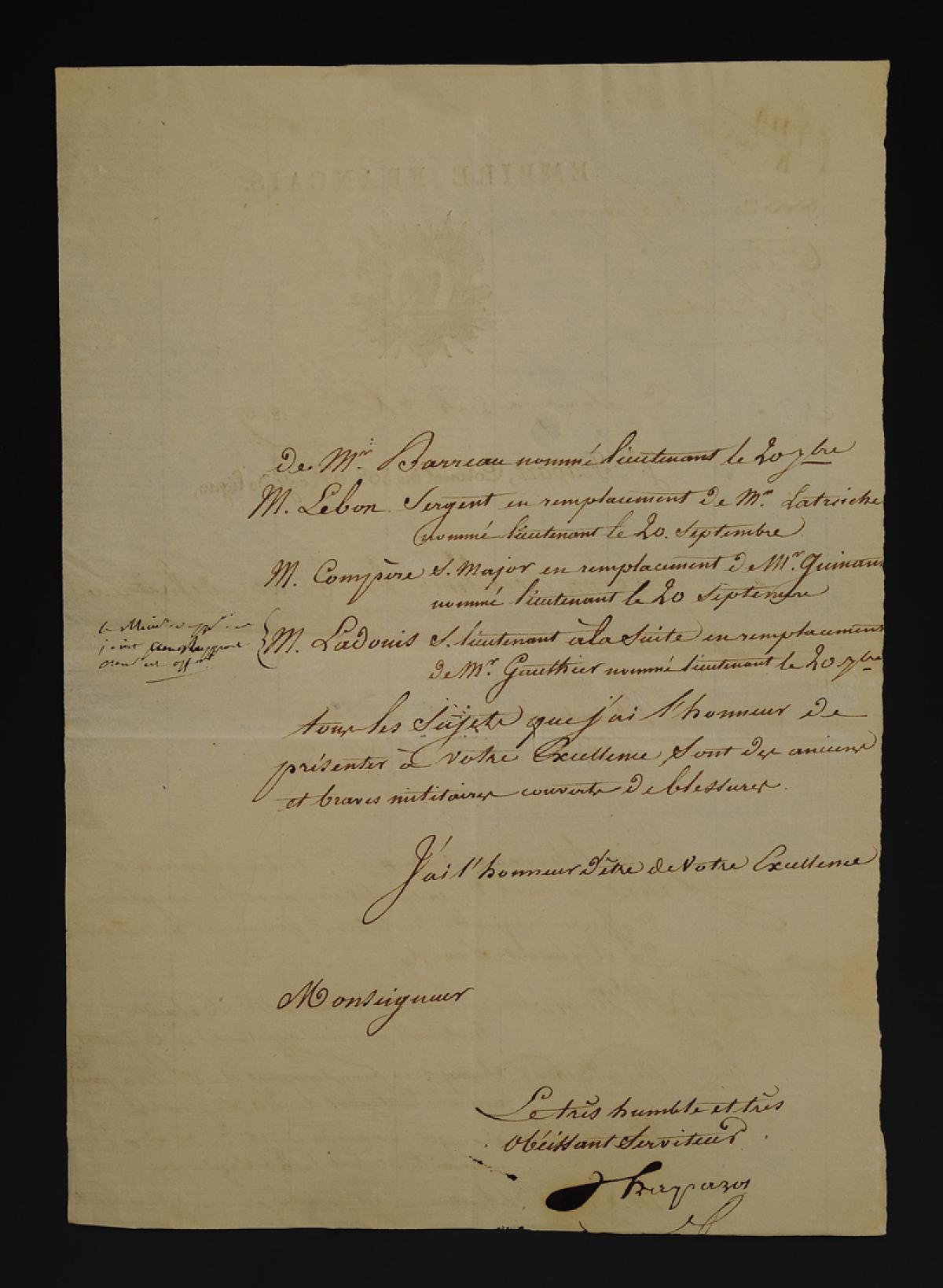 Le Colonel FRAPART écrit au Ministre de la Guerre, il fait sept mémoires de proposition pour les emplois d'officiers vacants aux trois premiers bataillons du Régiment, à savoir :