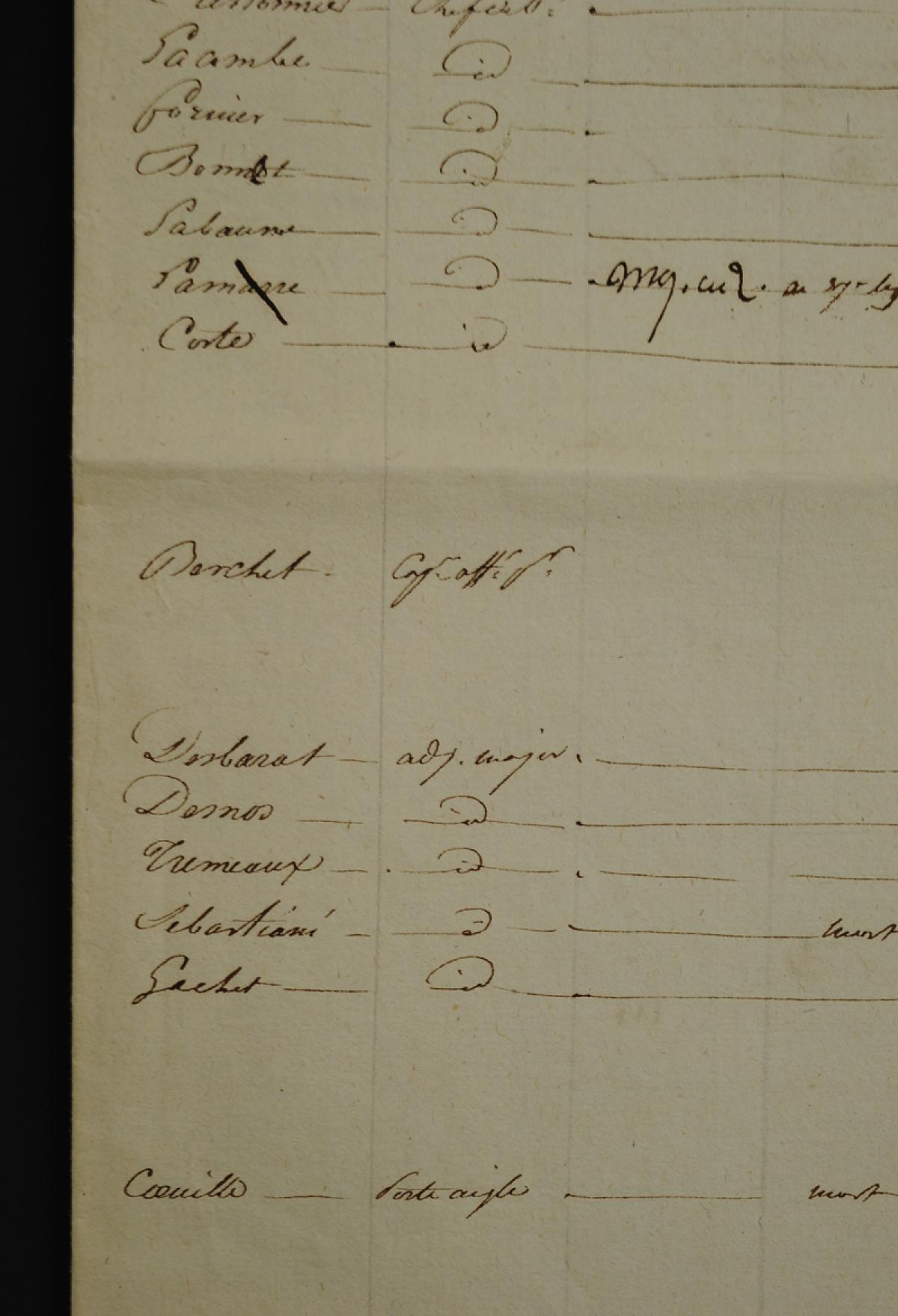 Feuillet double. Tableau manuscrit sur quatre pages, donnant la composition complète du régiment sous le commandement du colonel Pierre de Pelleport.