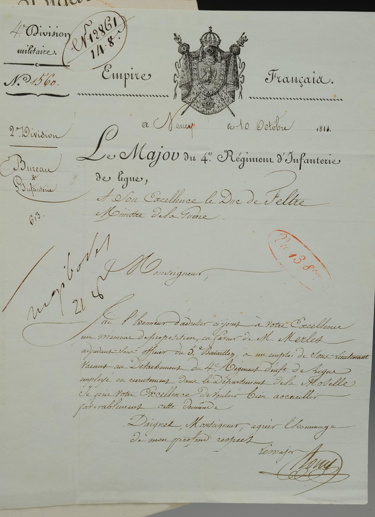 Le major en place écrit un mémoire de proposition au Duc de Feltre, ministre de la Guerre, en faveur de M. MERLET, adjudant sous-officier du 5e Bataillon, à un emploi de sous-lieutenant vacant au Détachement du 4è Régiment d'Infanterie de ligne dans le Département de la Moselle.
