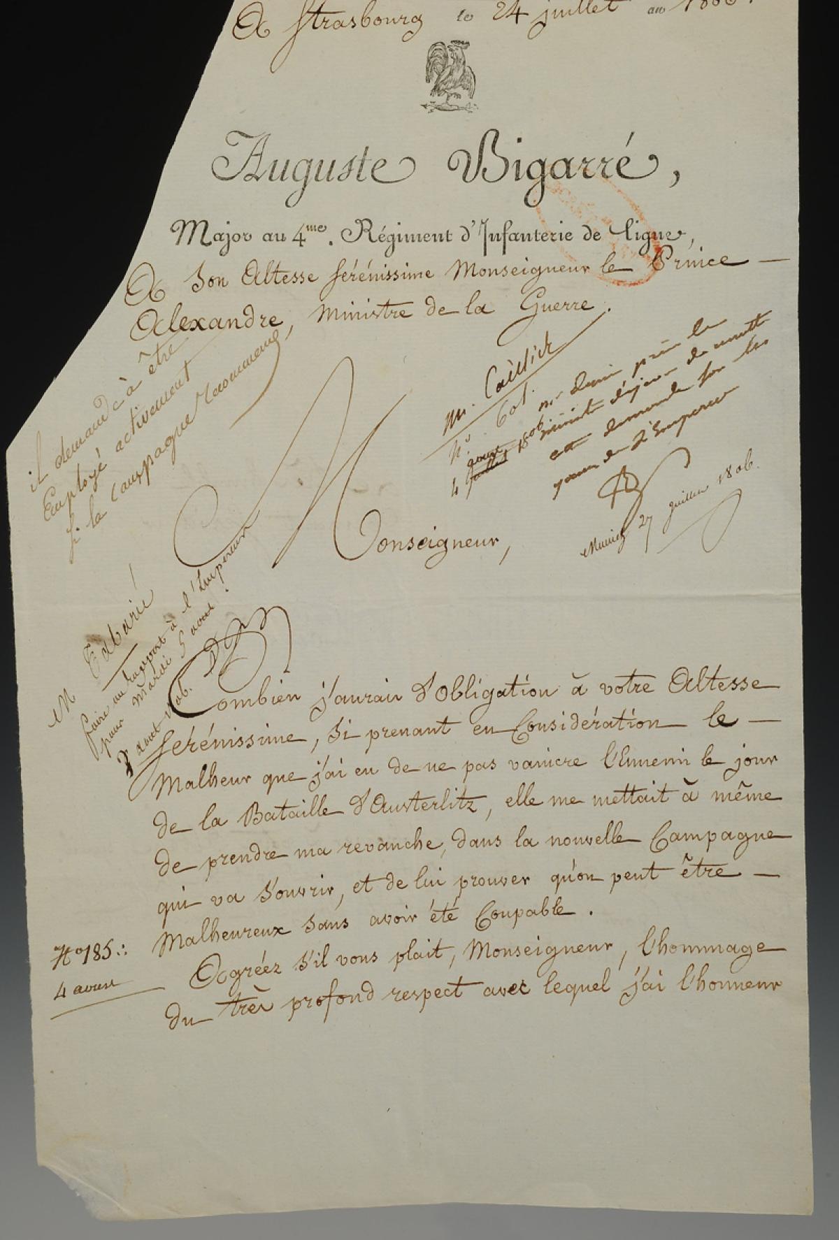 1 - Lettre autographe adressée par Auguste Bigarré au Prince Alexandre, Ministre de la Guerre, suite à son échec à la bataille d'Austerlitz. Il sollicite de pouvoir prendre sa revanche dans la nouvelle campagne qui va s'ouvrir.