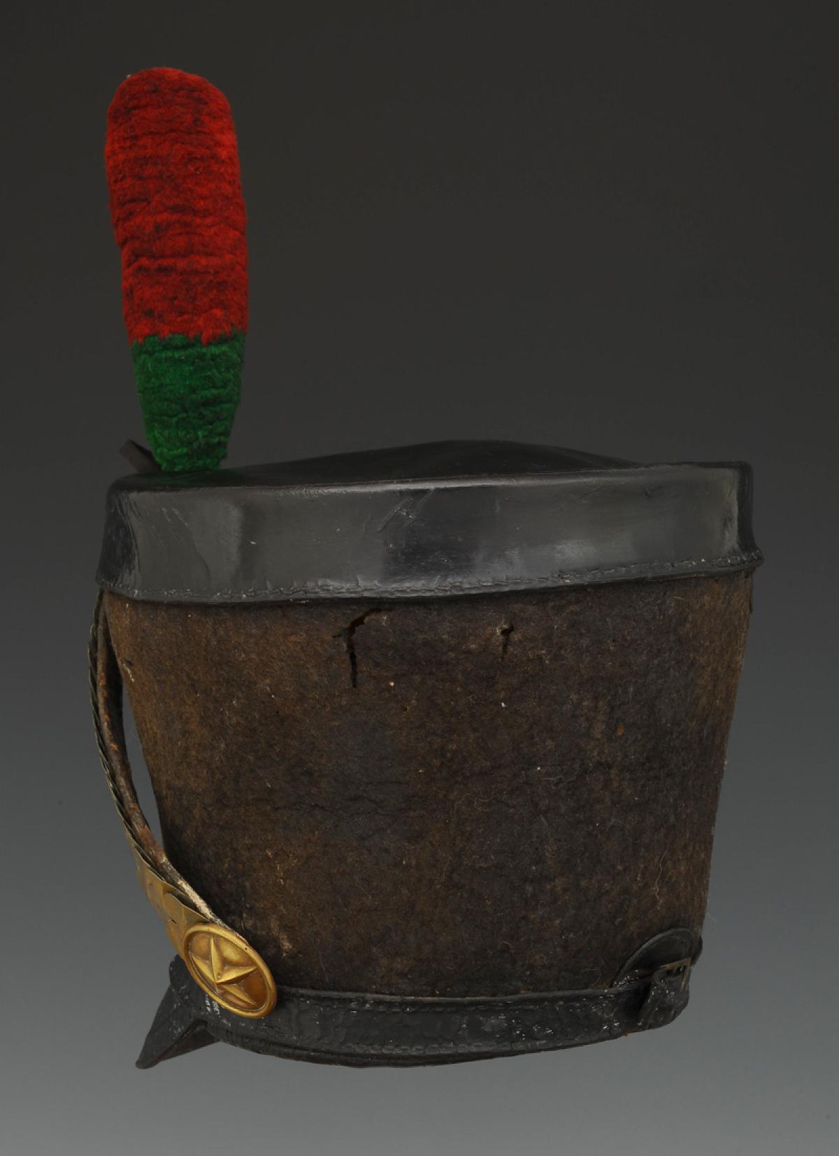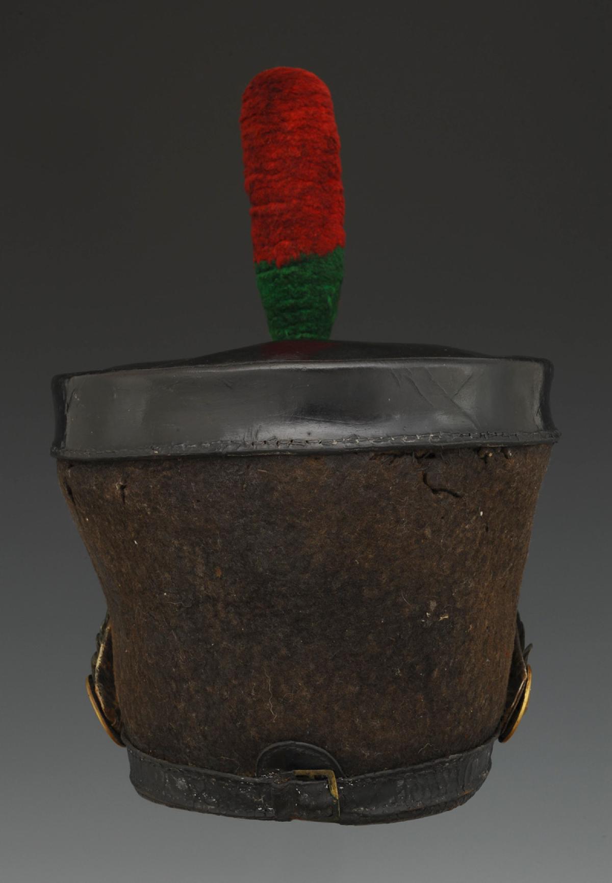 Corps en feutre noir de 20 cm de hauteur. Calotte en cuir de vache ciré très fort, Ø 23,5 cm rabattu sur le feutre à une hauteur de 3,7 cm. Au bas du feutre, est cousu un bourdalou en cuir de vache uni, de 2,3 cm de largeur, avec à l'arrière une boucle en laiton et son ardillon, H de la boucle 2,6 cm, largeur 2,2 cm. Sous cette boucle, un gousset en veau simple, pour faciliter le jeu du bourdalou. Une visière arrondie en cuir fort de vache verni est cousue au devant du shako, largeur 5 cm.