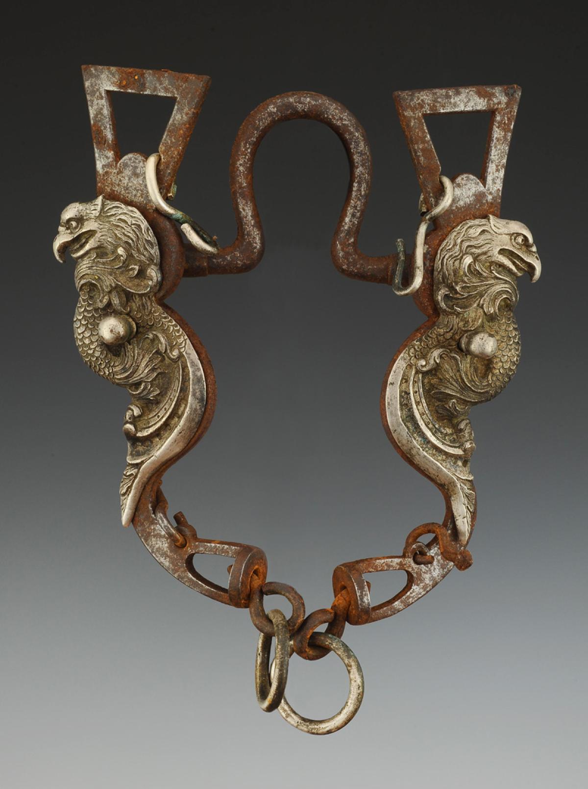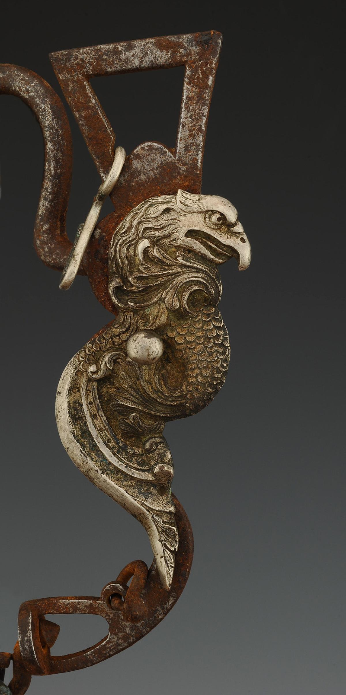 Mors de bride en acier avec branches en S décorées de deux grandes appliques représentant un animal fantastique avec tête de rapace et corps de poisson en métal argenté. Complet des anneaux pour les courroies de bride et des crochets pour la gourmette.