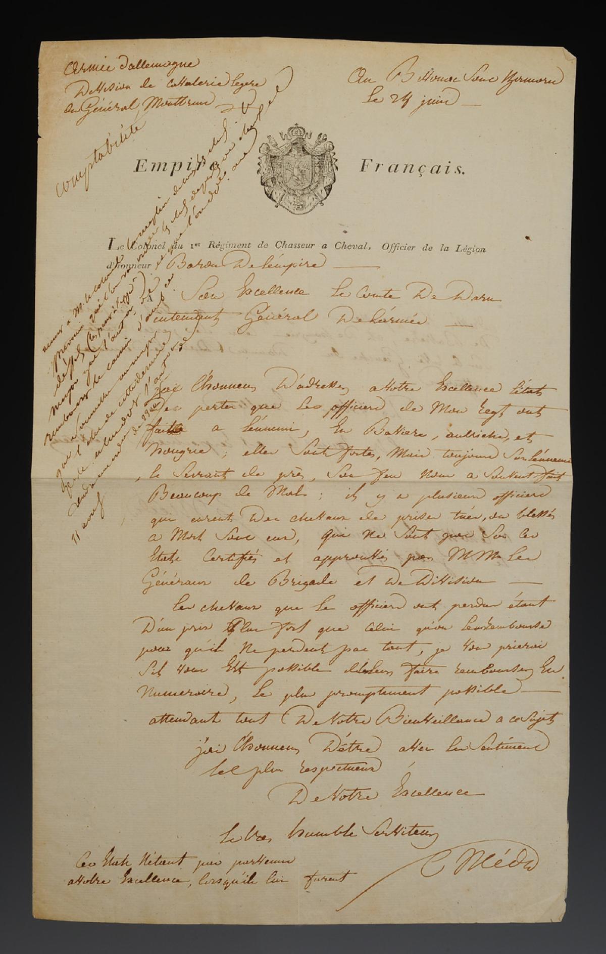 Lettre à entête Armée d'Allemagne / Division de Cavalerie légère / au Général Montbrun » « EMPIRE FRANÇAIS » avec vignette aux armes impériales.
