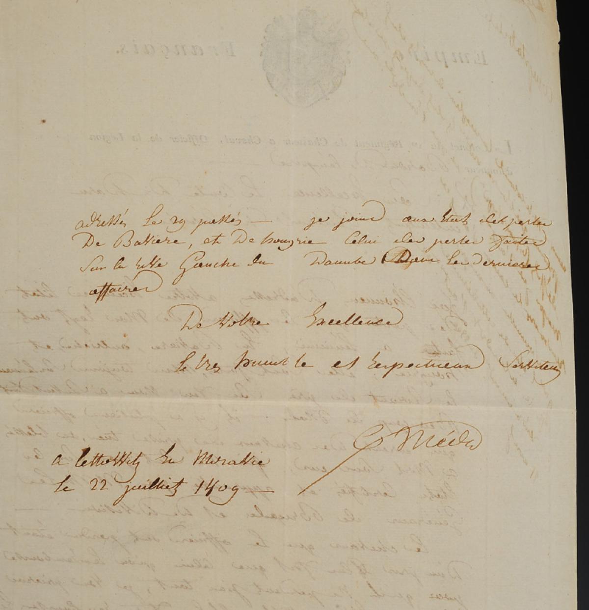 Après Wagram sur la même lettre, Meda ajoute : «... Je joins aux états des pertes de Bavière et de Hongrie, celui des pertes faites sur la rive gauche du Danube dans les dernières affaires.. »