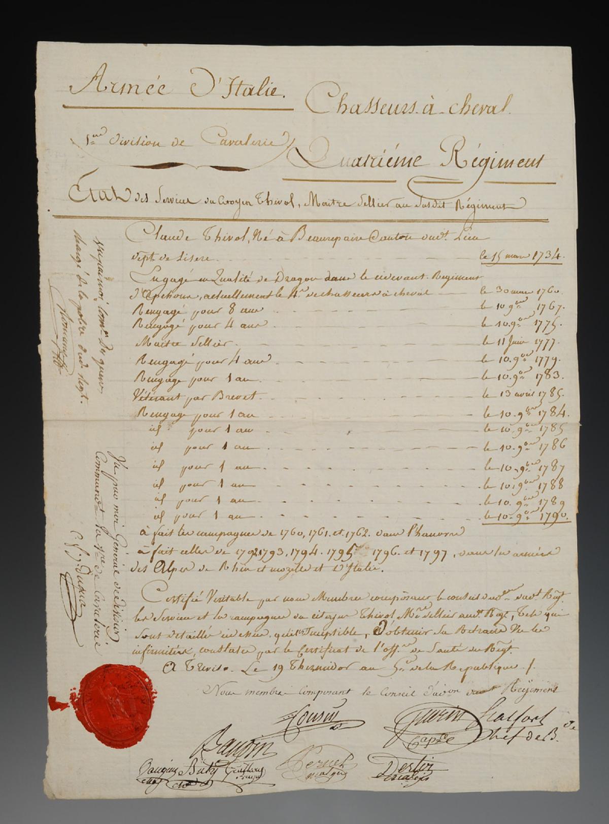 Armée d’Italie. 4ème Régiment de Chasseurs à cheval . ÉTAT DES SERVICES DU CITOYEN THIVAL, maître sellier au dit Régiment, Trévise 19 thermidor an 5 (6 août 1797). 32719