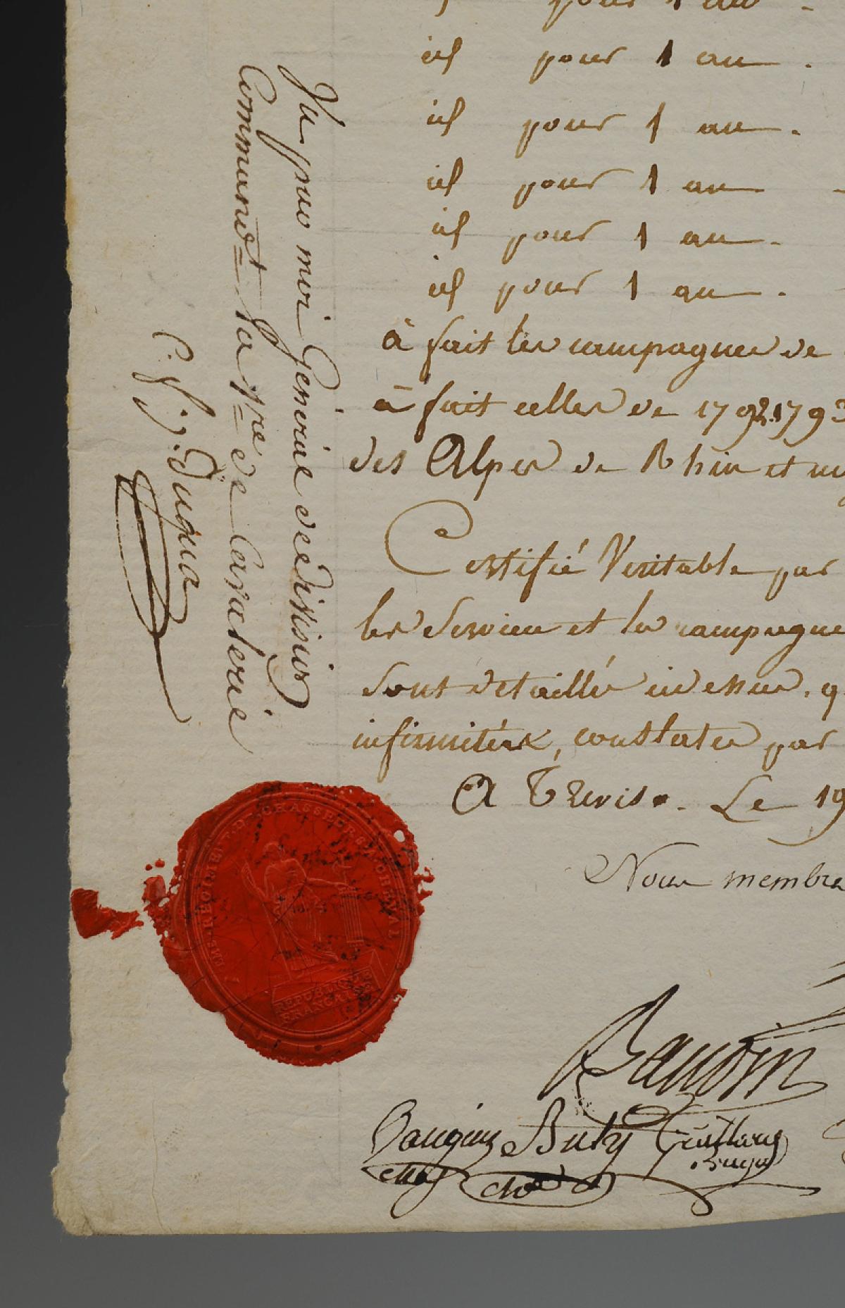 l'une signée par le général de division Charles-François Joseph (1744-1802) : « Vu par moi Général de division Commandt la 1re de Cavalerie ».