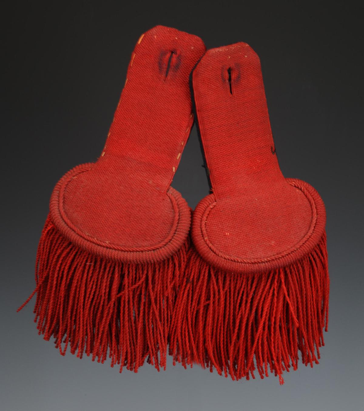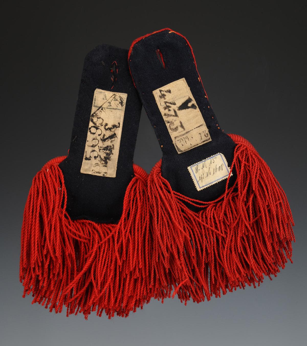 Entièrement en passementerie et franges garance. Doublure en drap bleu foncé presque noire.