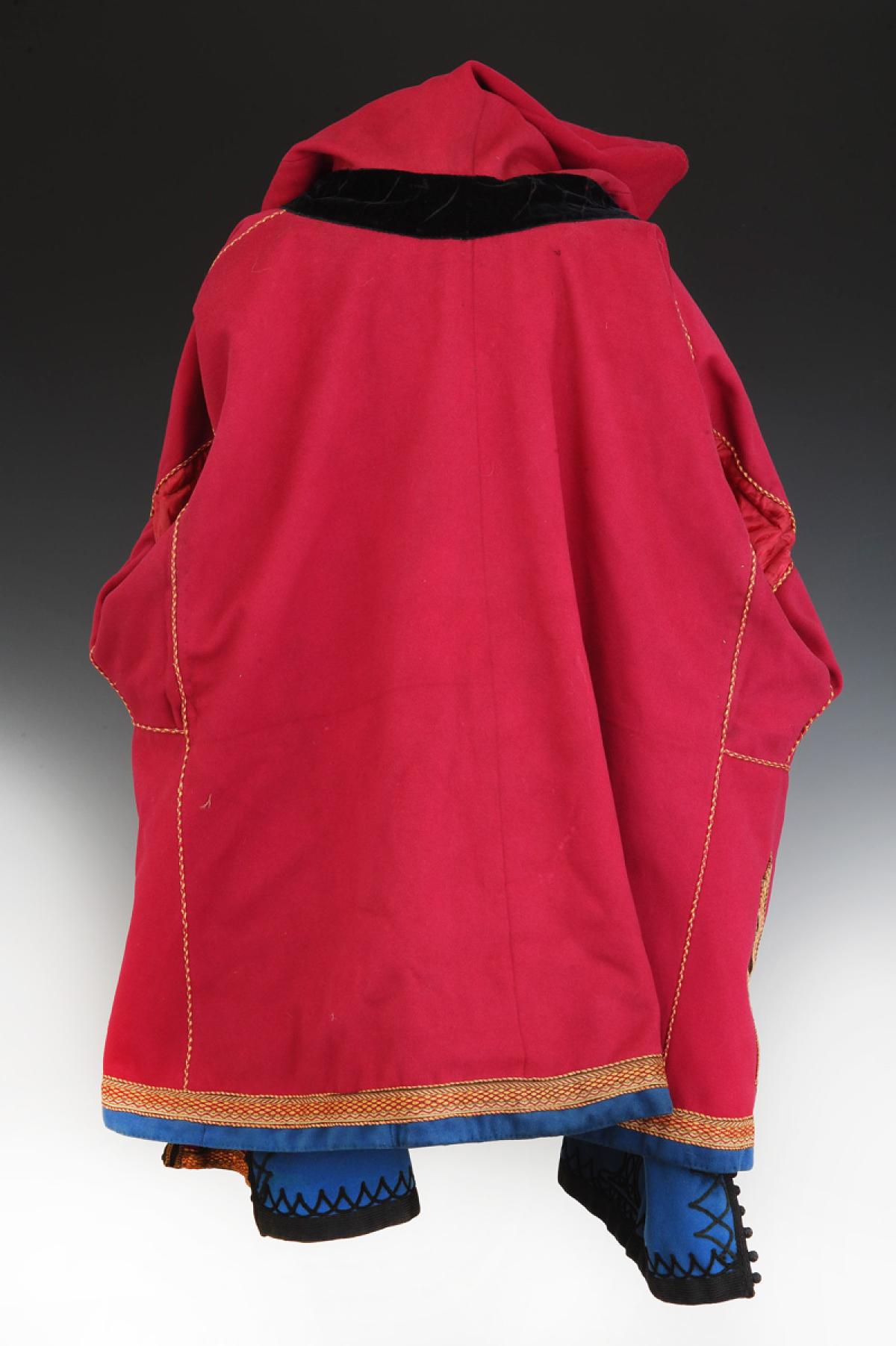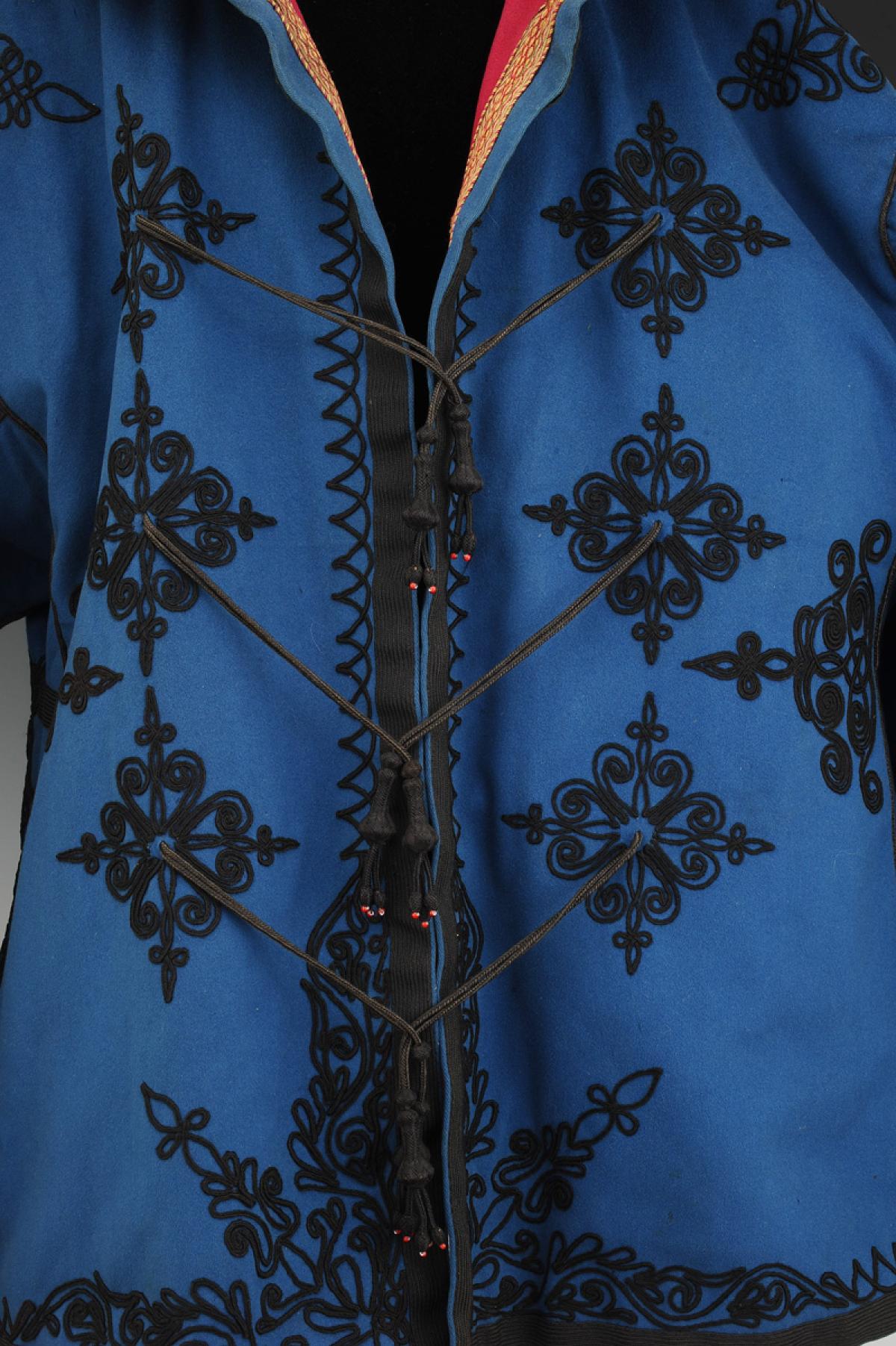 Veste à capuchon, entièrement en drap bleu de ciel foncé, richement décorée de galons et passepoils de laine noire bordant l'ensemble de l'habit et le décorant sur tous ses côtés de noeuds hongrois et de décors géométriques. Elle ferme à l'avant au moyen de lacets (trois de chaque côté) en cordonnet tressé en laine noire. Chaque lacet se termine par un coulant puis un pompon noir et trois floches noires chacune arrêtée par une petite perle écarlate.
