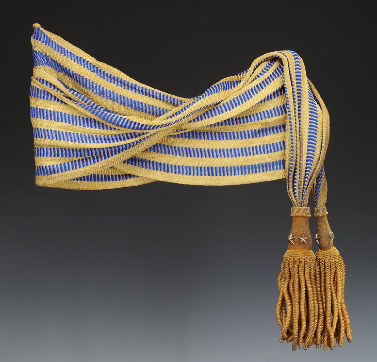 En mailles de filé or et soie bleue (présentant six bandes d'or sans mélange et cinq bandes de soie et d'or, toutes égales en largeur et disposées alternativement dans le sens de la longueur). Aux extrémités sont cousus deux glands trapézoïdaux : les têtes recouvertes de cannetille or appliquée en damier, au point mat, dit « point suivi » légèrement bombé des deux côtés, portant deux étoiles en métal argenté agrafées. Les gorges et les jupes à longues franges sont à grosses torsades mates.