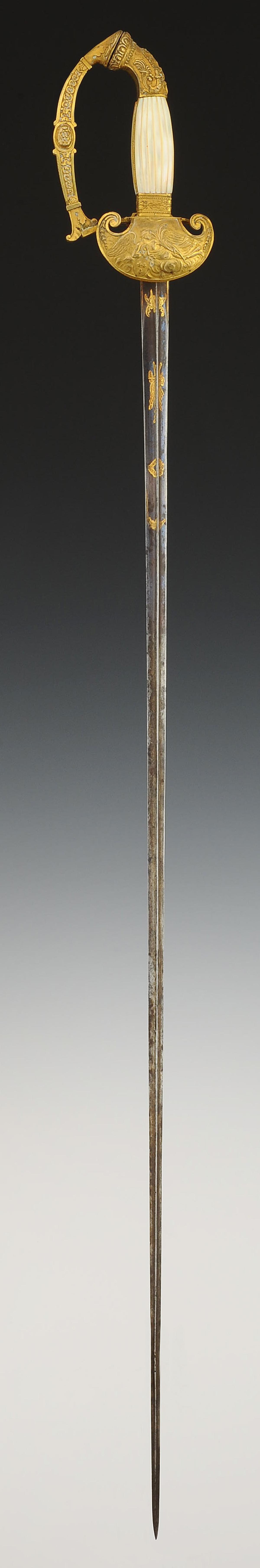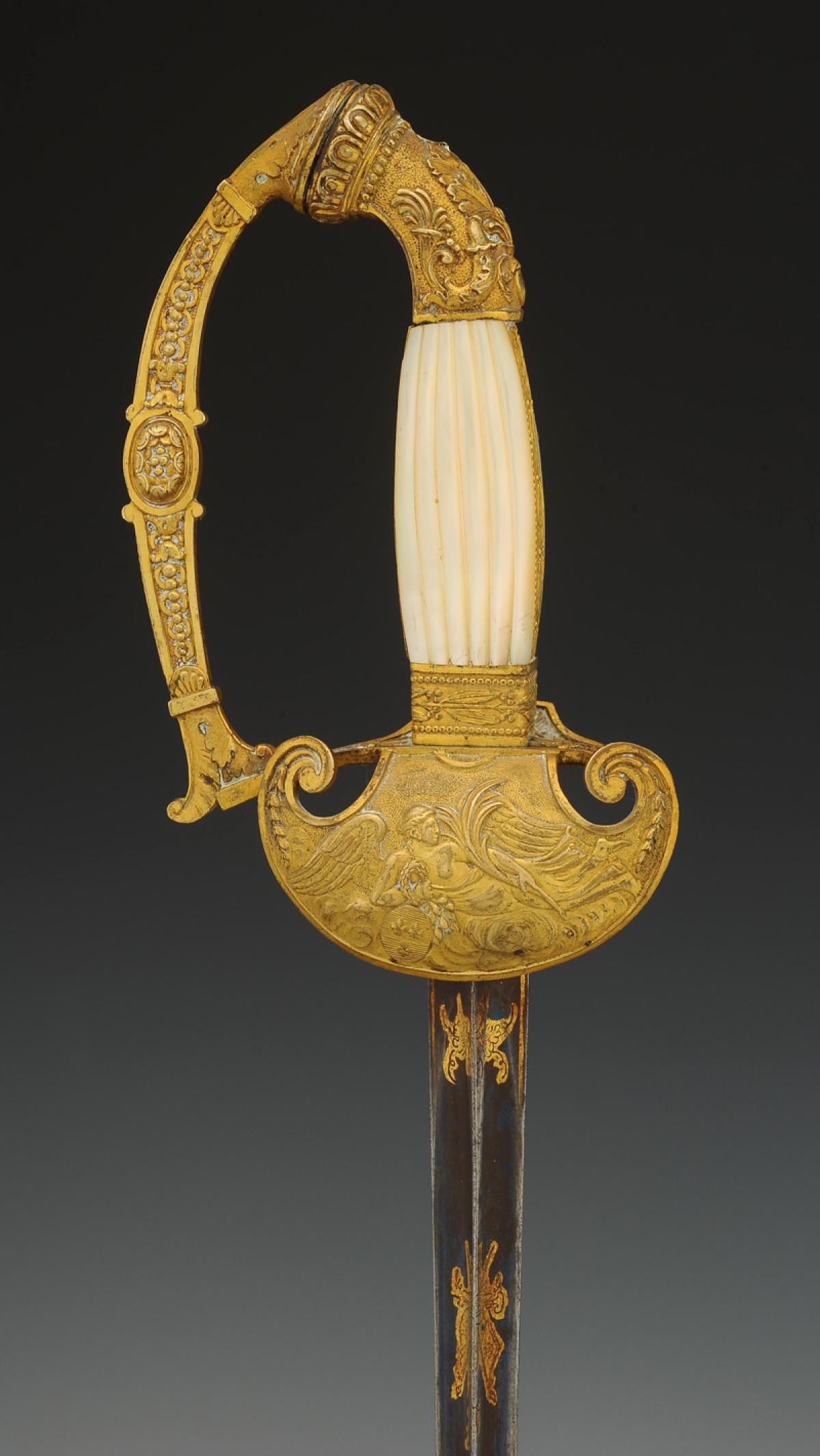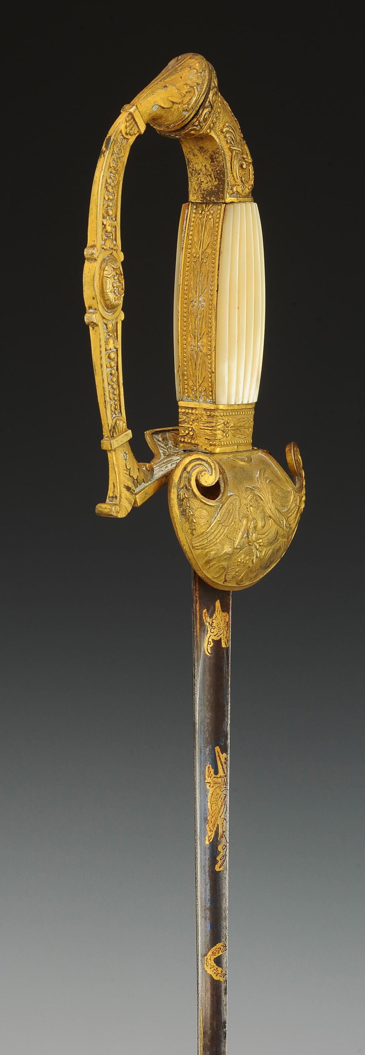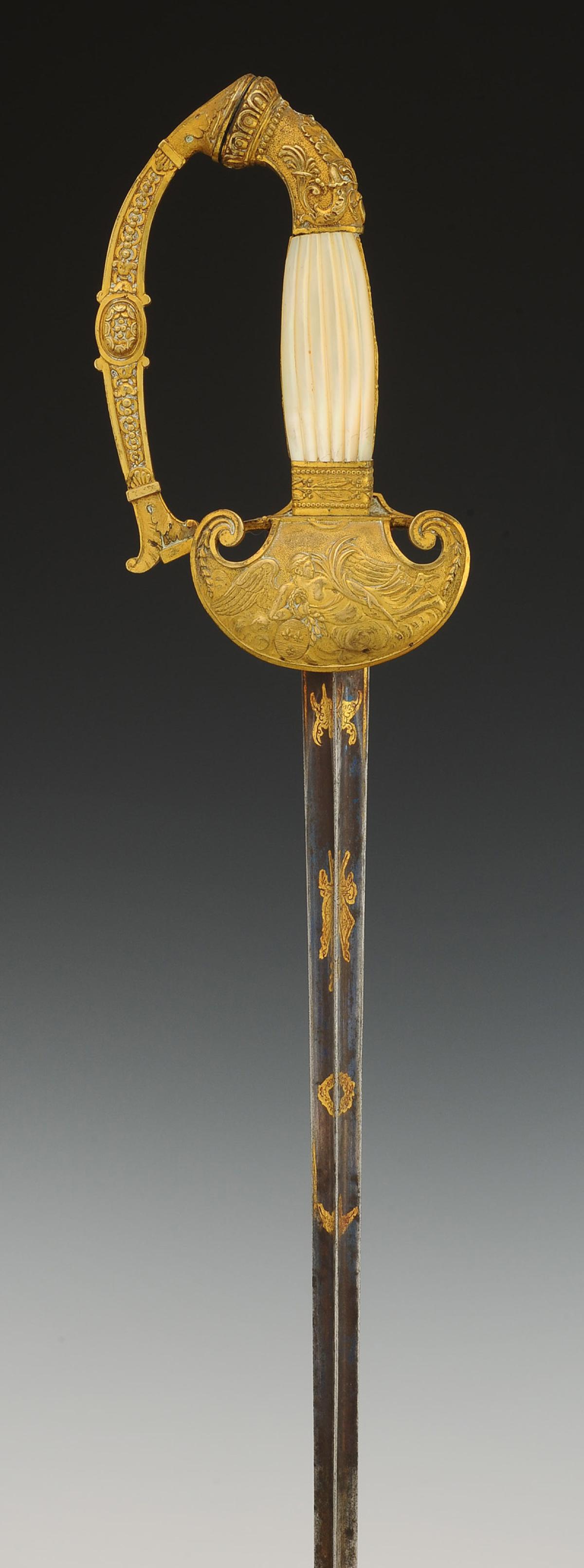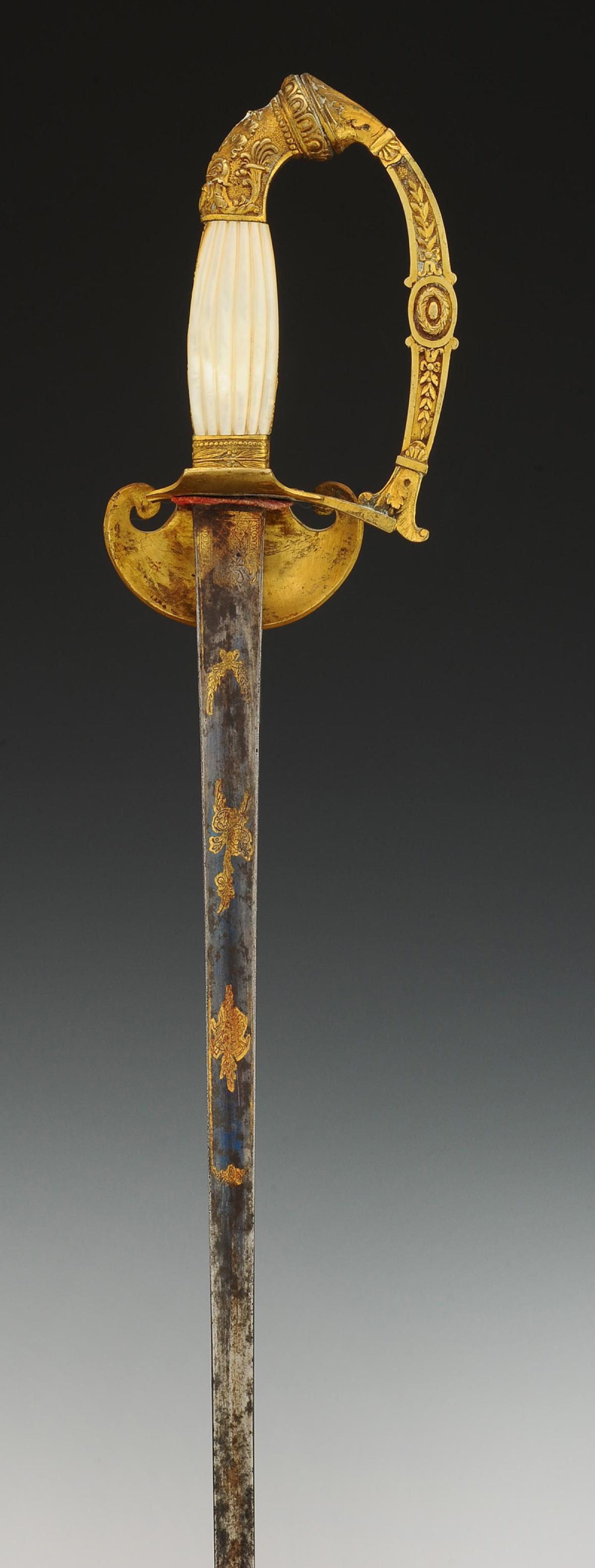 Monture en bronze doré. Clavier en forme de bouclier décoré en relief d'un dieu ailé allongé sur des nuages, avec un médaillon fleurdelysé. Calotte à courte queue à décor de cornes d'abondance et d'une feuille d'acanthe. Poignée en bois à plaquettes de nacre moulées en relief, avec baguettes latérales en laiton doré décorées de branches de laurier, tout comme la virole. Lame triangulaire de 82 cm de longueur, premier tiers gravé et doré d'un trophée militaire et de feuillages sur fond bleui. Cravate en drap écarlate.