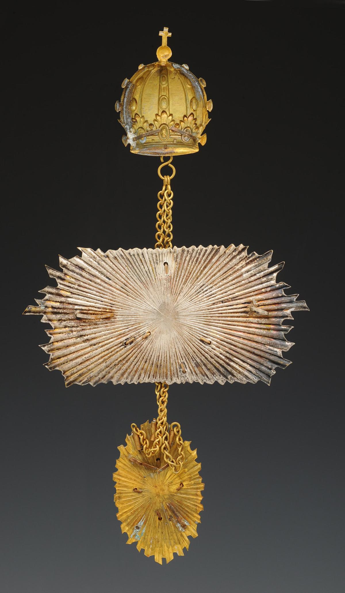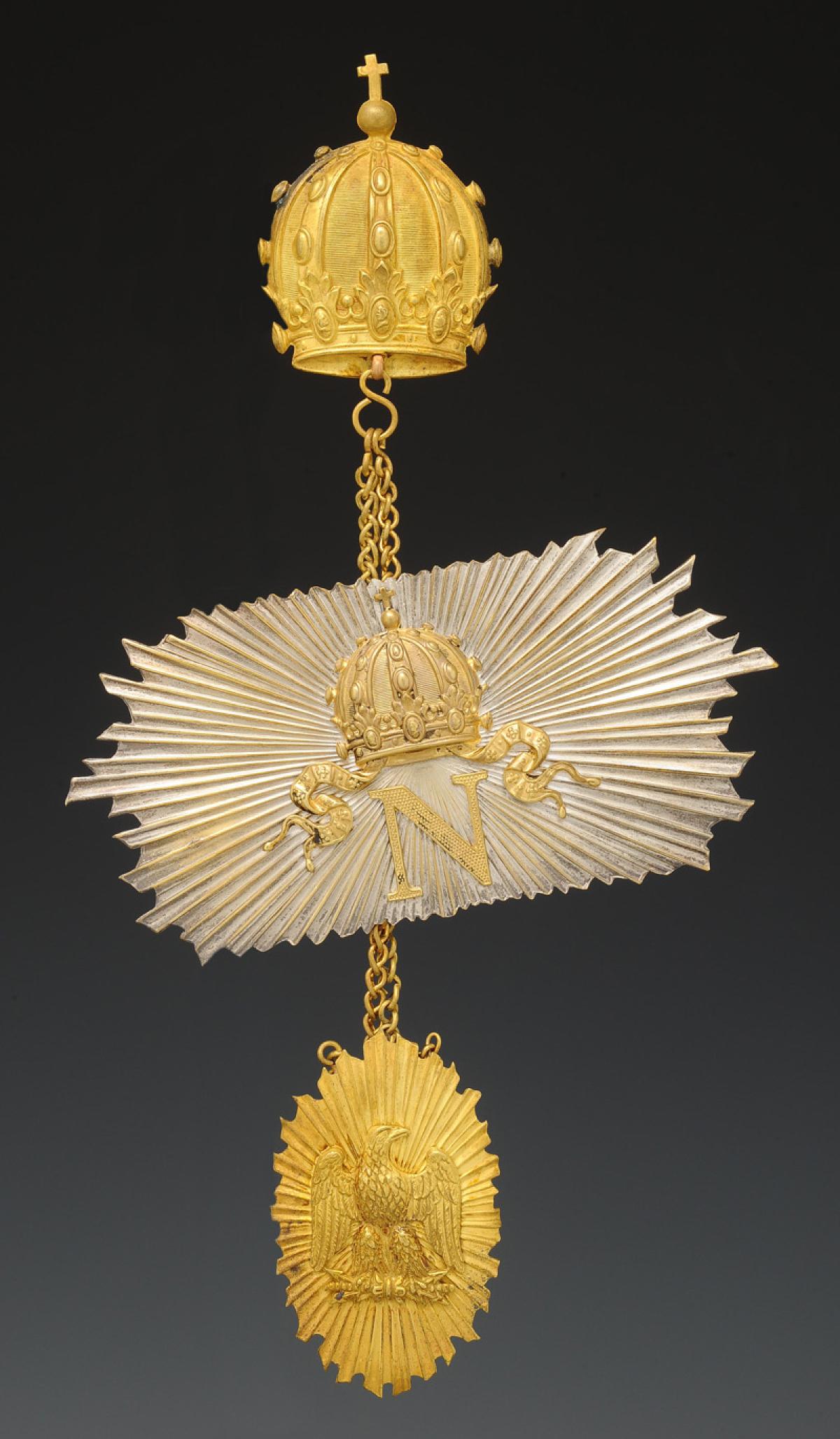 Ornements de banderole composés de deux éléments en laiton doré estampé : la couronne des Guides reliée par trois chaînettes gourmettes et un soleil rayonnant décoré en son centre de l'aigle impériale non couronnée.