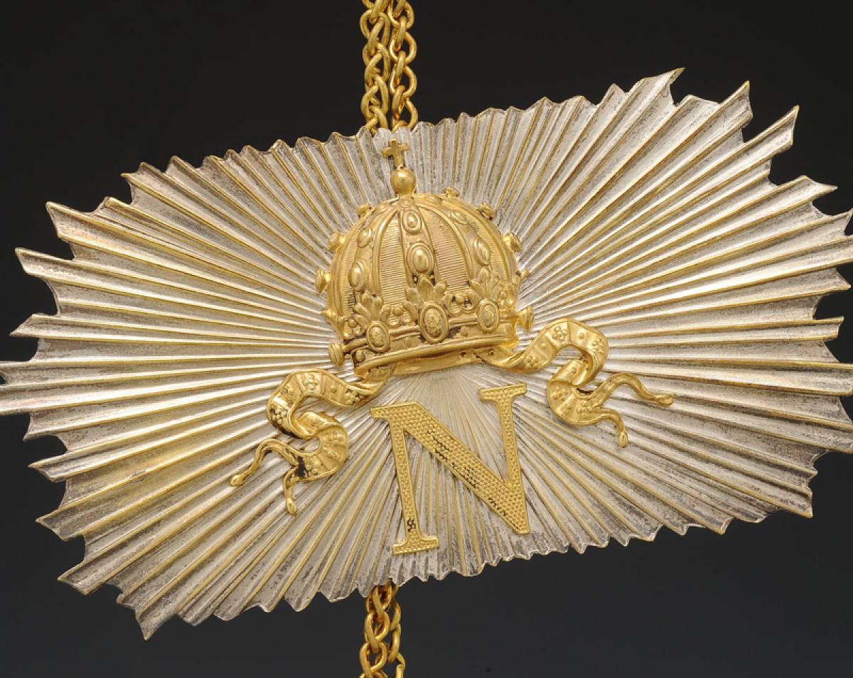Plaque de pattelette de giberne représentant un soleil rayonnant en métal argenté, avec en son centre une « N » surmontée de la couronne impériale.