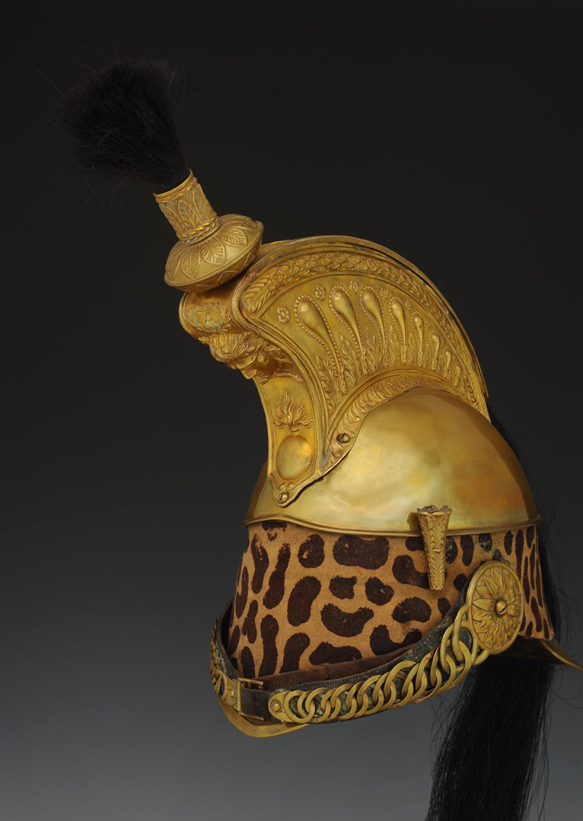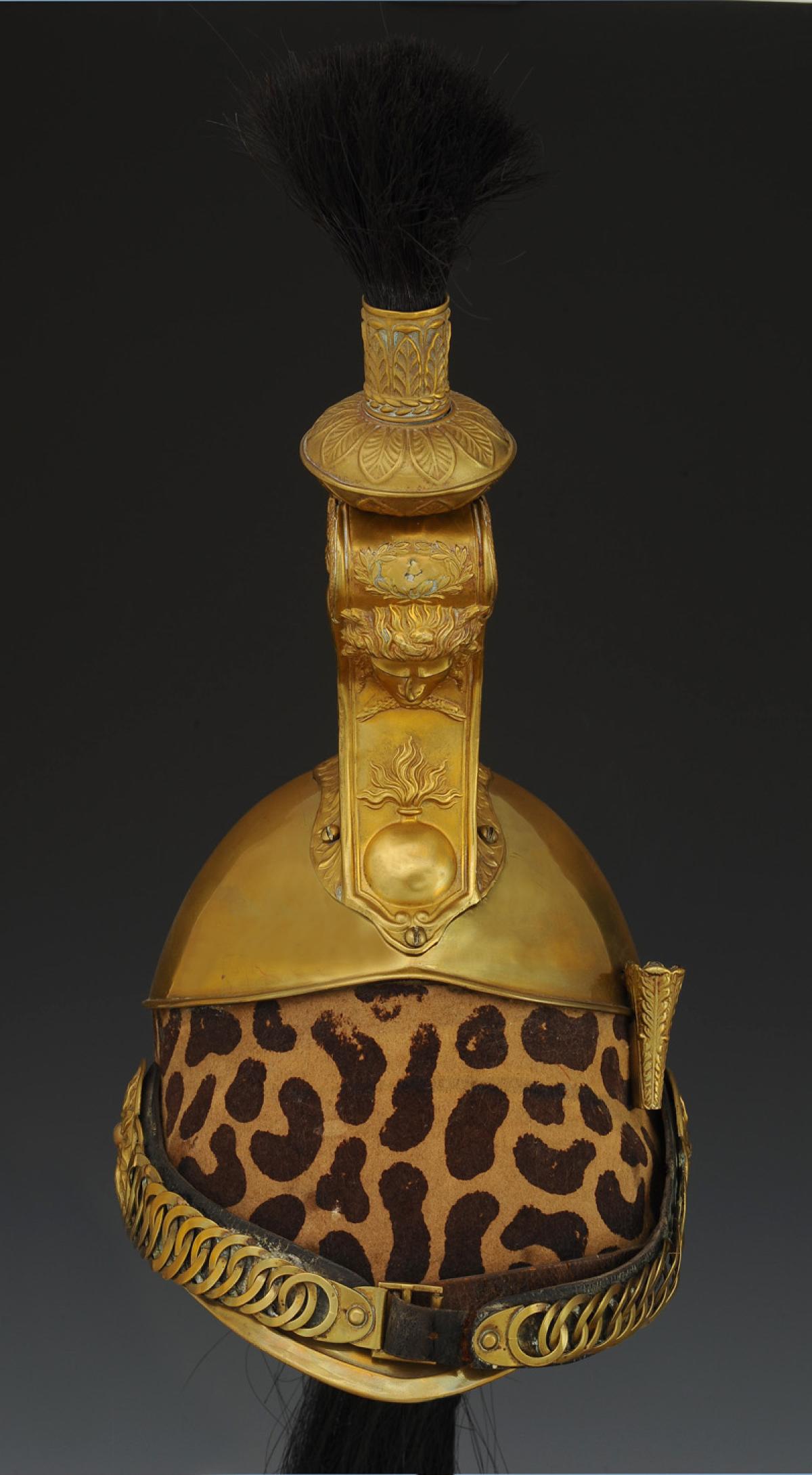 Cimier placé sur la bombe, du devant à l'arrière ; il est en cuivre jaune et composé de deux ailerons, d'un masque et d'un recouvrement. Les ailerons à base concave forment un rebord festonné percé de deux trous pour des vis en cuivre, à tête ronde en goutte de suif, qui sont arrêtées en dedans de la bombe par des écrous. Ils sont ornés de palmettes et d'une guirlande à leur bord supérieur. Le rebord est orné de feuilles d'eau, le tout estampé en relief. Les ailerons sont estampés d'une suite décroissante de huit godrons. Le masque sert de jonction antérieure aux deux ailerons. Il est estampé d'une tête de Méduse en fort relief, surmontée d'une petite couronne de chêne et au bas, au-dessus du cul-de-lampe du masque, est une grenade en bas-relief. Vis en cuivre au bas du cul-de-lampe. Le recouvrement en cuivre est estampé d'une natte en bas-relief. L'ornement du cimier se compose d'une douille inférieure, d'une lentille ornée de palmettes en relief et d'une douille supérieure, également ornée de palmettes. Houppette en crin noir. Crinière en crins teints noirs, longueur d'environ 64 cm.