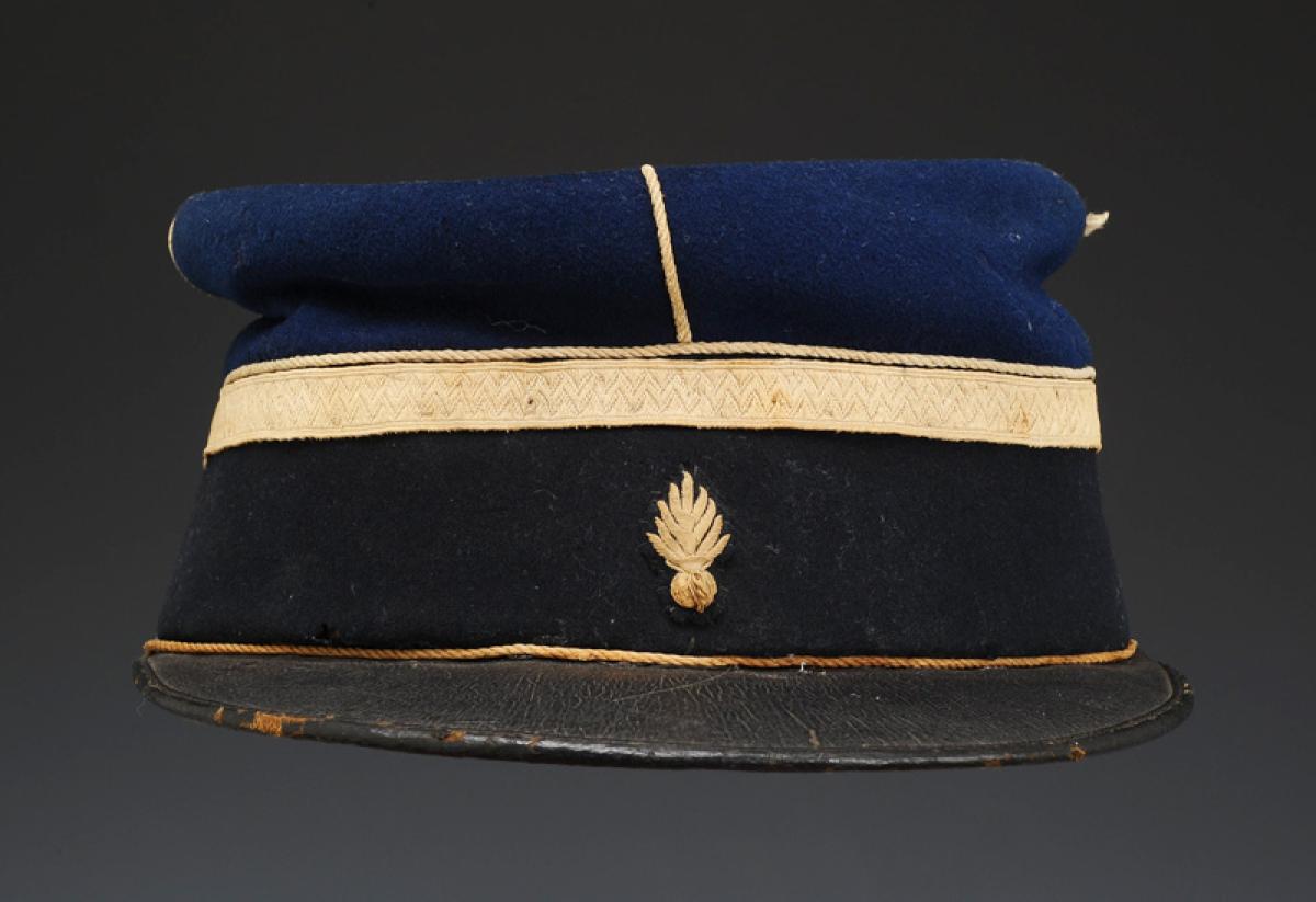 Calot et turban en drap bleu foncé, bandeau en drap noir. Bandeau et turban bordés d'un galon d'élite à point de Hongrie, dit « à lézardes » en fils de coton blanc et d'un cordonnet de même teinte. Dessus du calot orné en son centre d'une ventouse d'aération grillagée. Sur le devant du bandeau, grenade à neuf flammes brodée en fils de coton blanc sur écusson en drap du fond, dans sa partie basse au niveau de la visière cordonnet blanc. Visière ronde en cuir fort verni noir, dessous en maroquin gaufré vert. Bandeau de sudation en cuir noirci, intérieur de coiffe en satin noir, cachet de la commission d'acceptation de la gendarmerie.