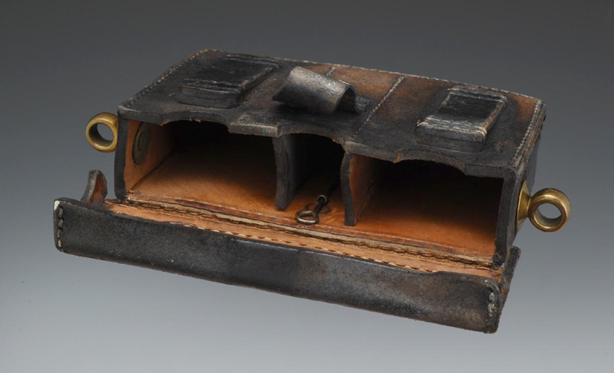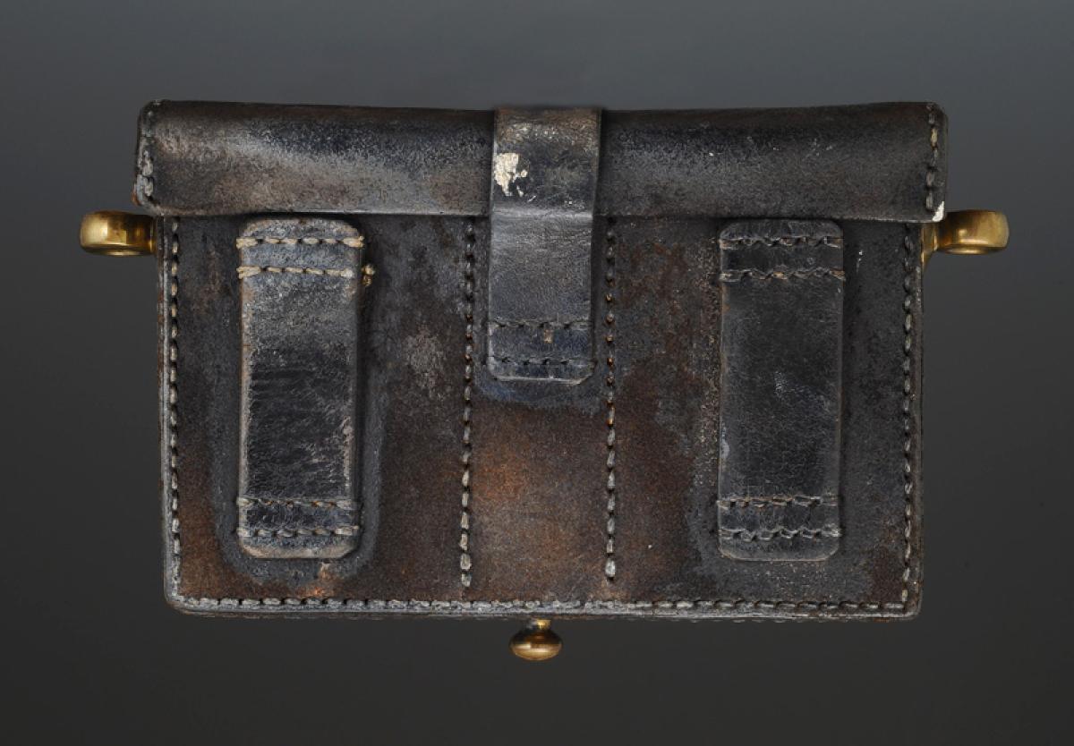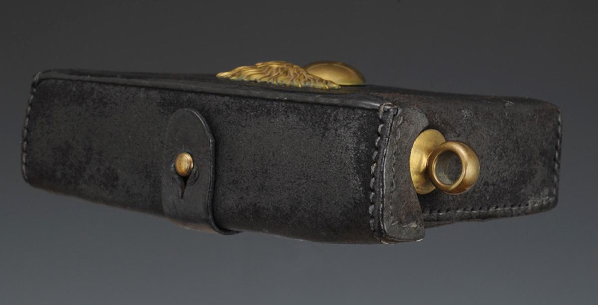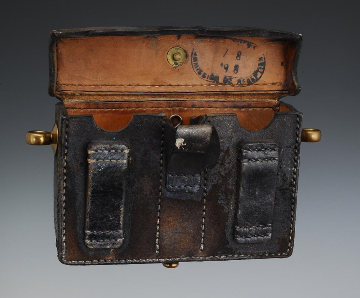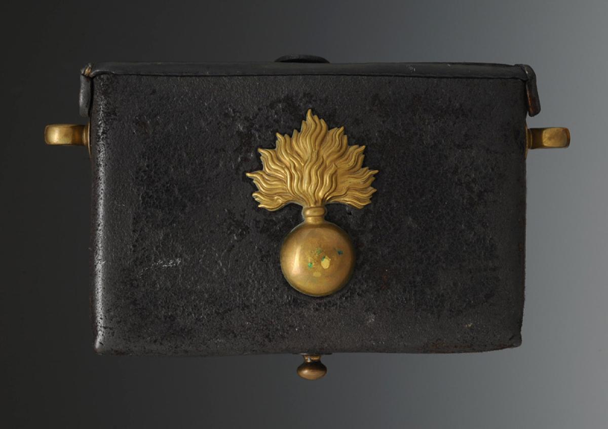 En cuir verni noir à garnitures de laiton. H 10 cm, largeur 14,5 cm, profondeur 3,7 cm, ouvrant sur le dessus par un couvercle refermant par une patte en cuir verni noir. L'intérieur du couvercle porte un cachet de réception à encre. À l'avant, grenade estampée en laiton, H 6,2 cm.