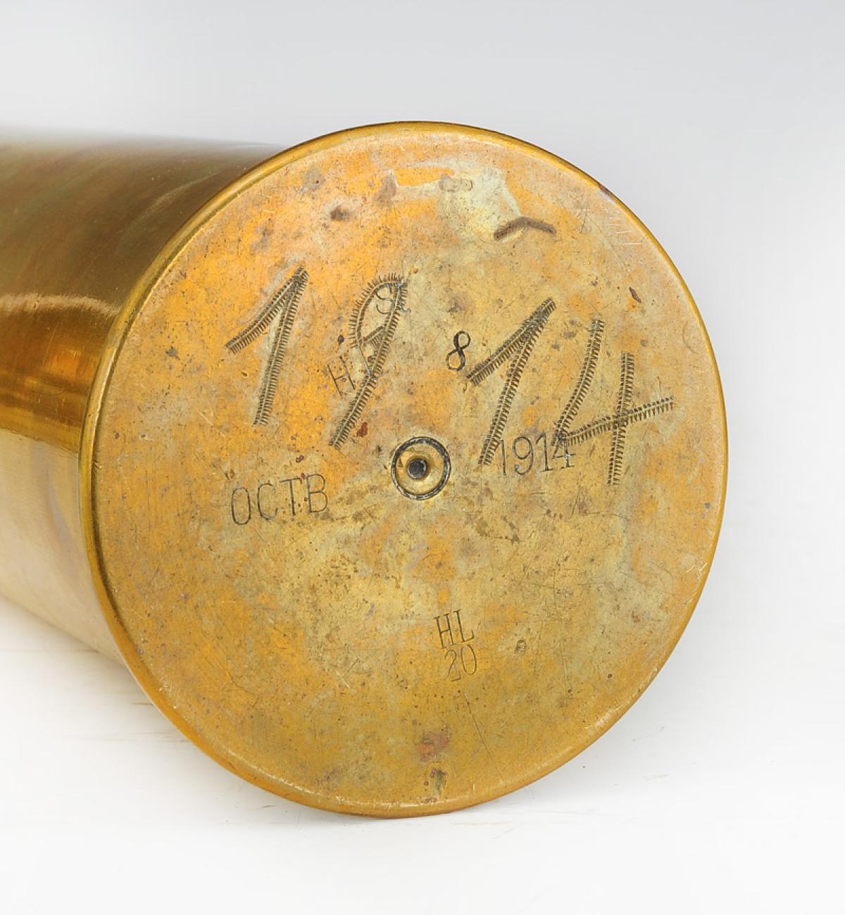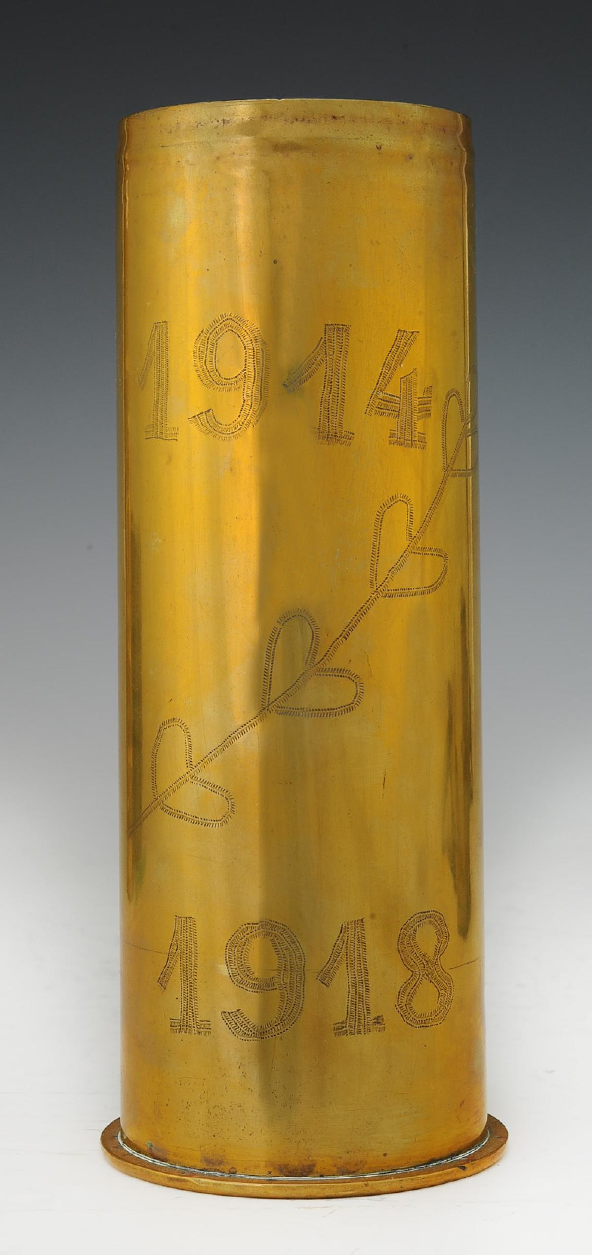 Douille d'obus de 77 mm datée octobre 1914, en laiton gravé « 1914-1918 » et une branche de feuillages.
