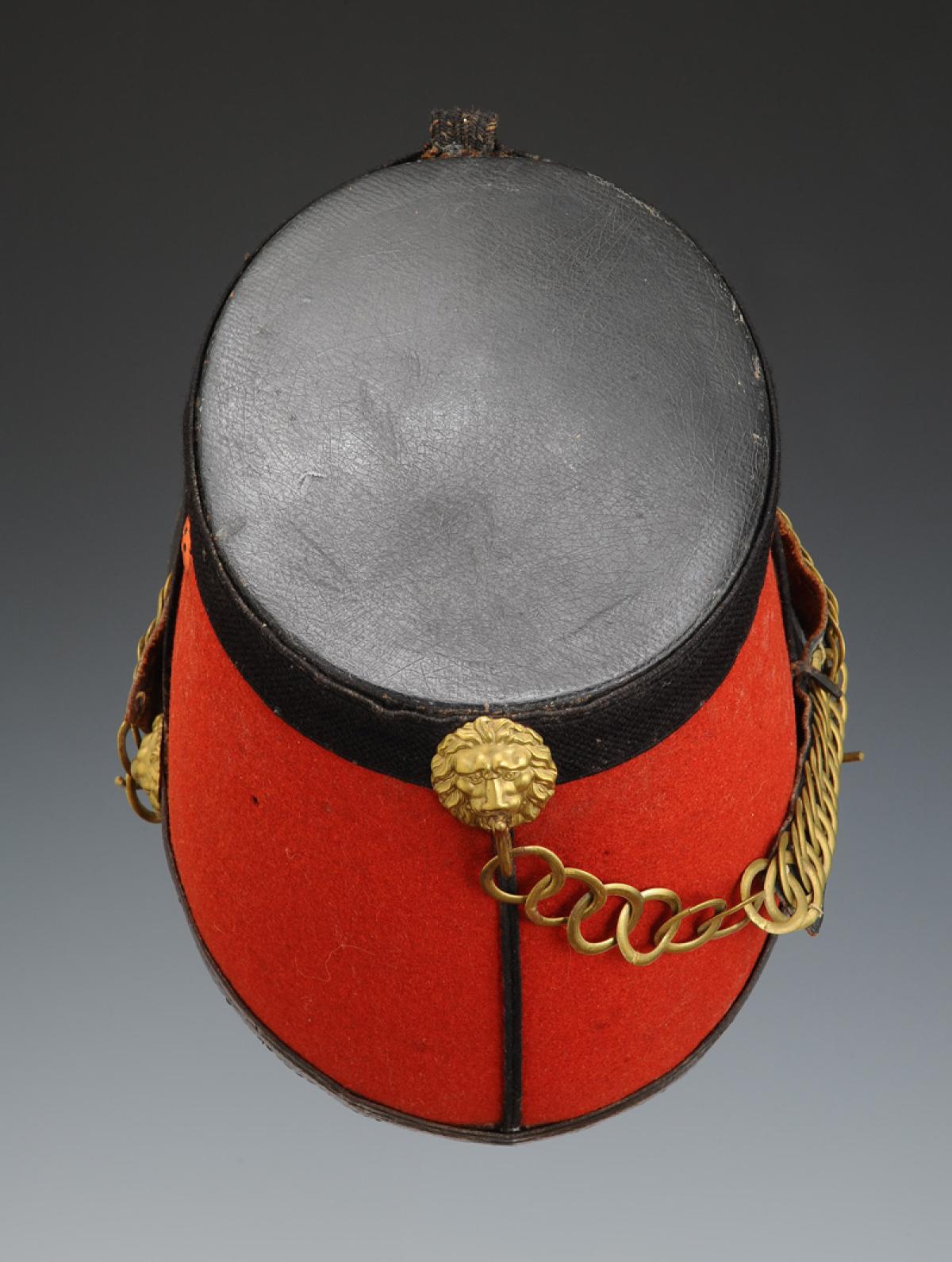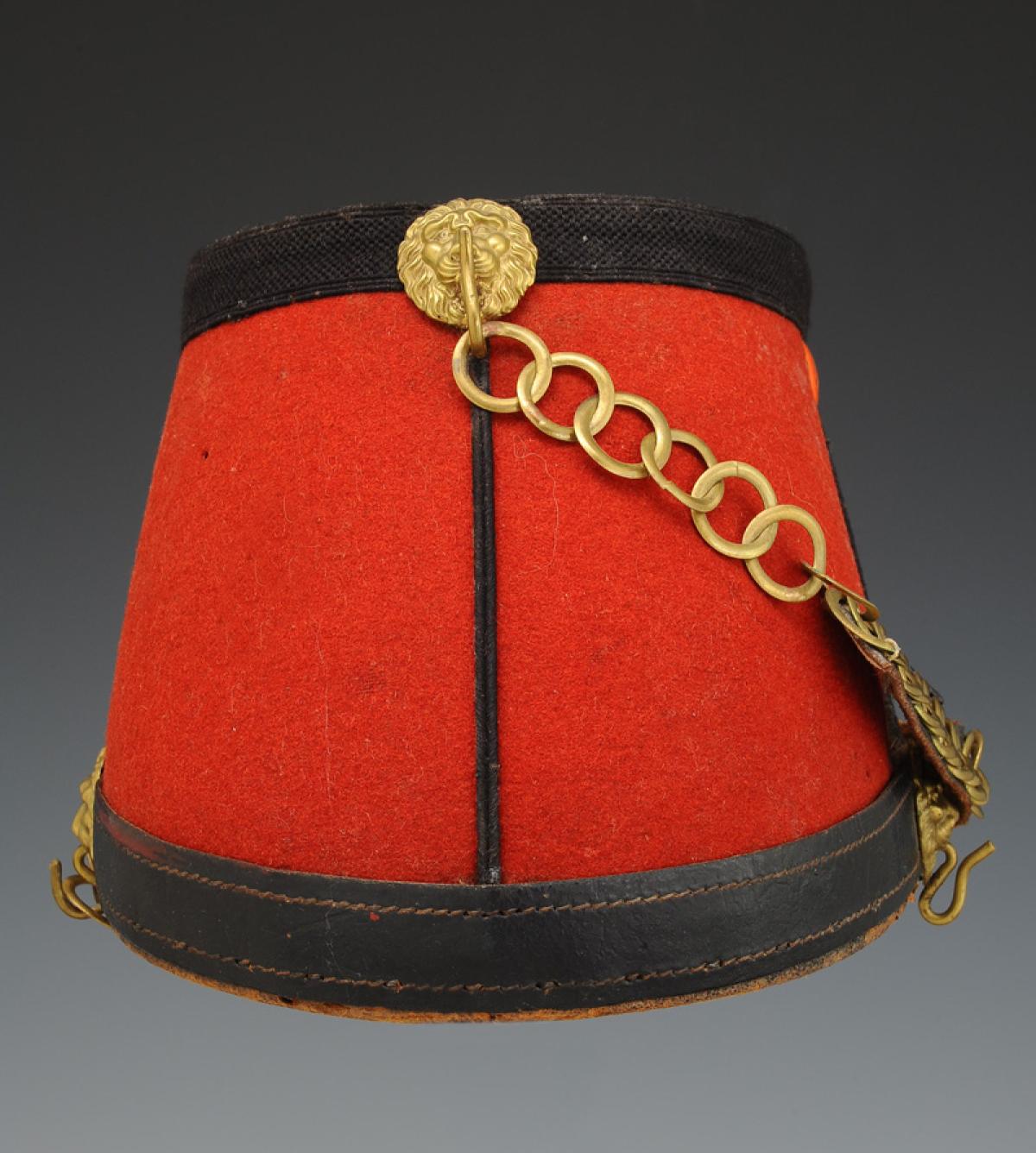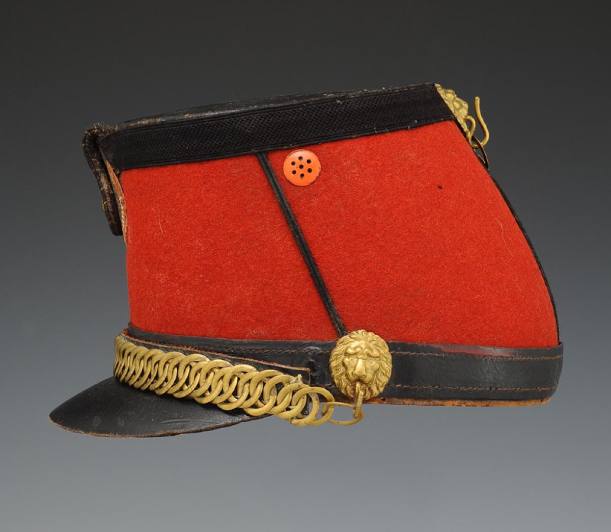 Jugulaire mentonnière à gourmette en laiton doré doublé de cuir verni noir. Sur les côtés et à l'arrière de la coiffe au niveau du galon, trois têtes de lion en métal doré permettent de maintenir la mentonnière.