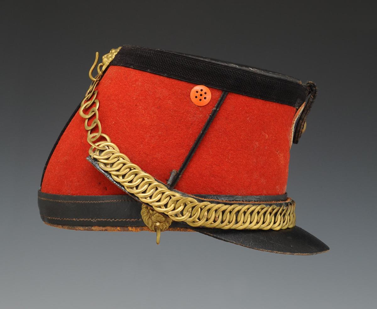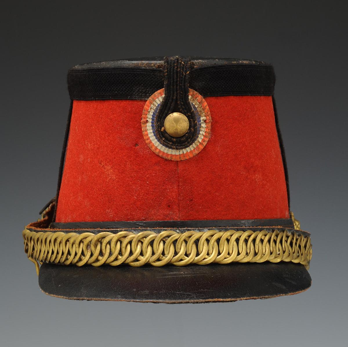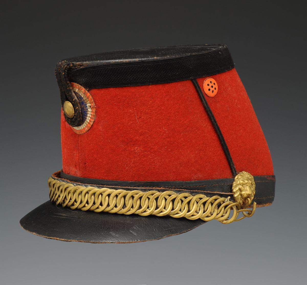 Jugulaire mentonnière à gourmette en laiton doré doublé de cuir verni noir. Sur les côtés et à l'arrière de la coiffe au niveau du galon, trois têtes de lion en métal doré permettent de maintenir la mentonnière.