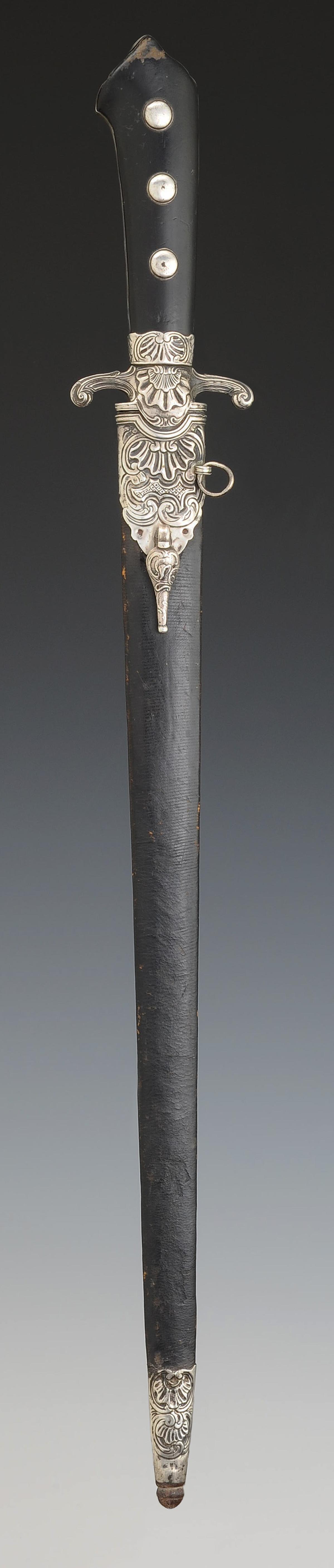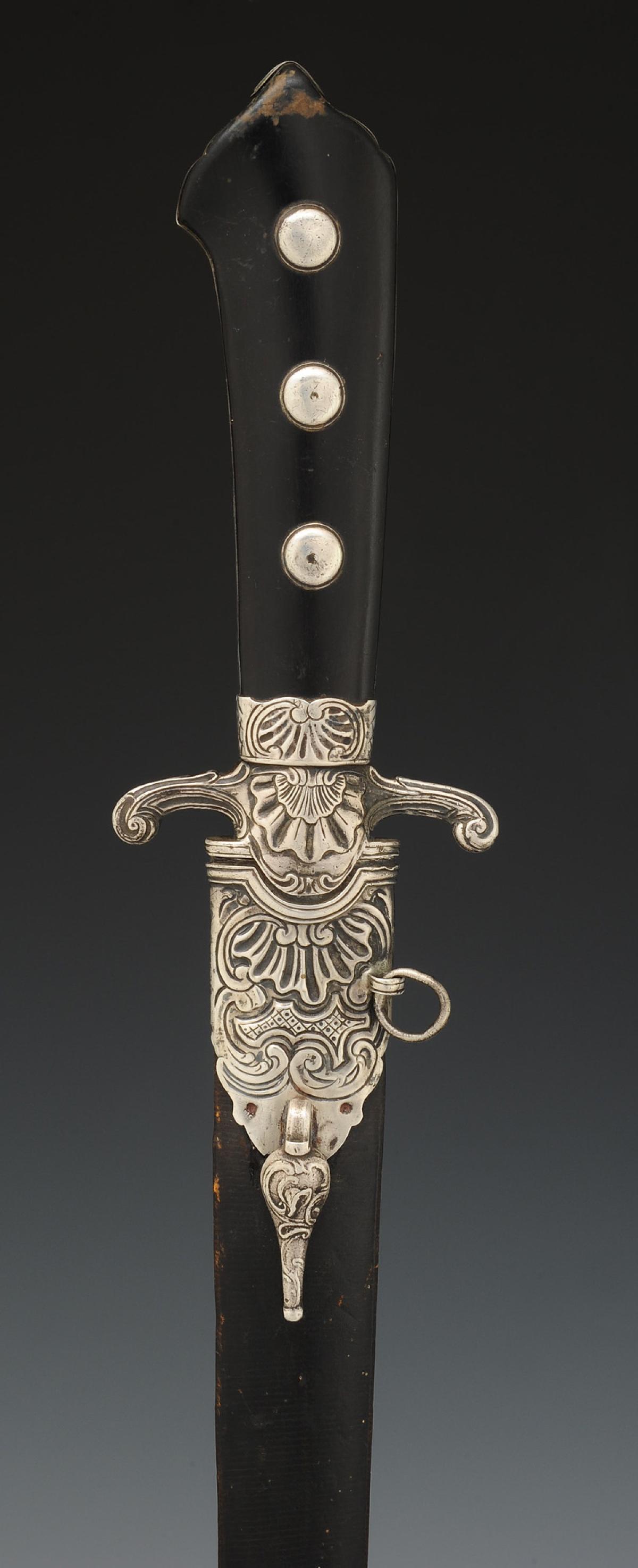 Fourreau en bois gainé de chagrin noir à deux garnitures d'argent poinçonné décorées de coquilles Saint-Jacques et décors de rocaille. Chape à agrafe pour le port au ceinturon avec un anneau de suspension, bout du fourreau décoré en suite avec bouterolle en acier.