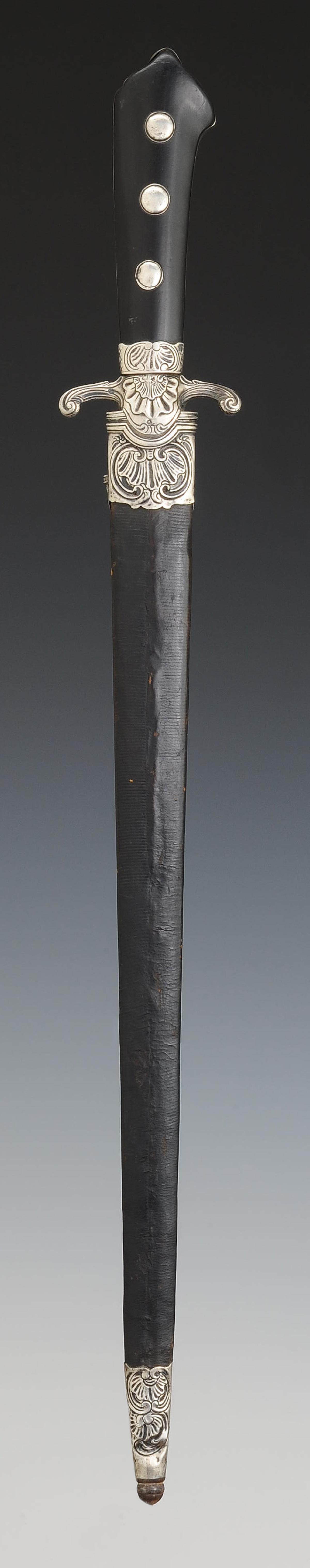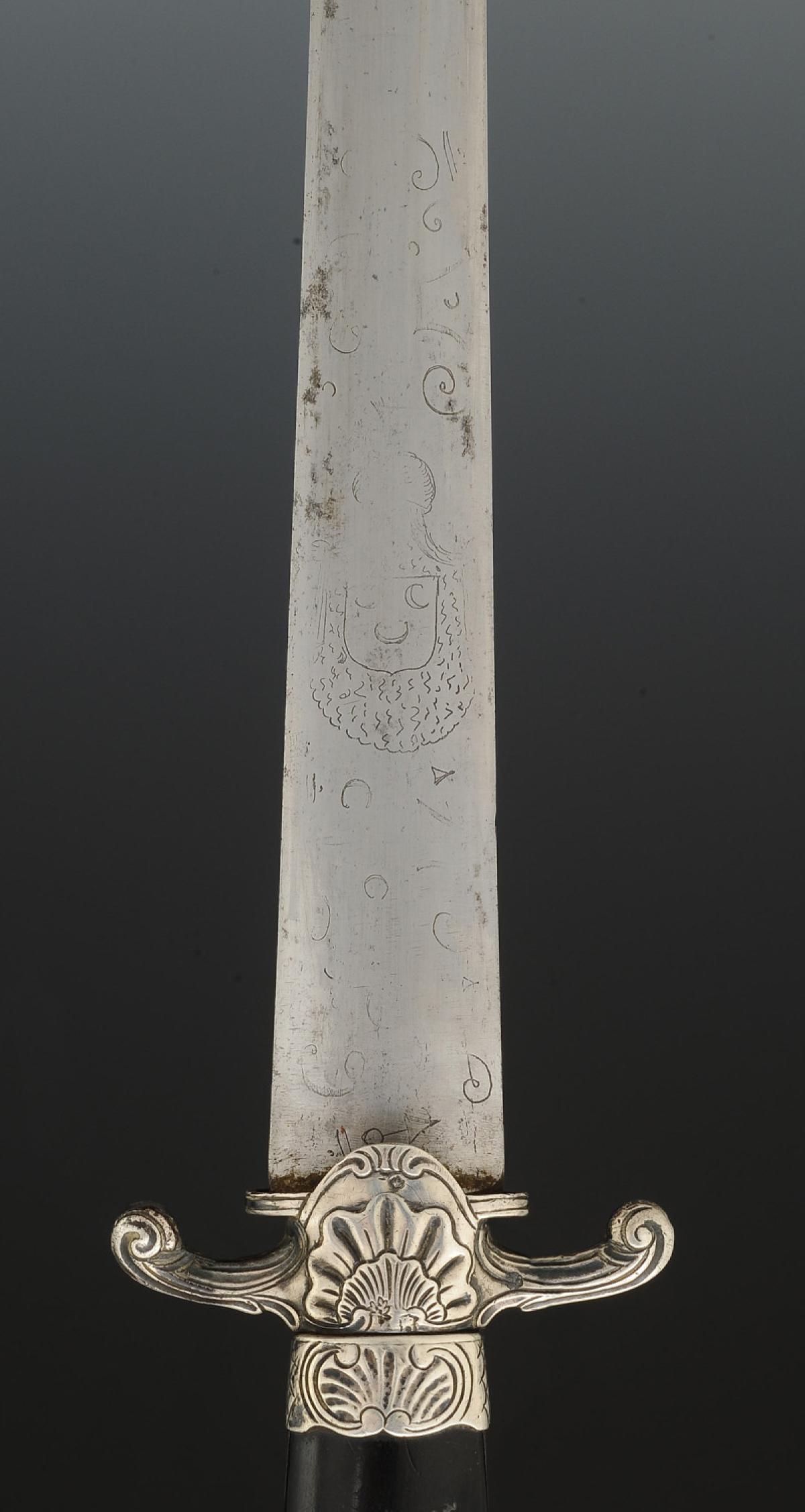 Monture en argent. Croisière en argent à double quillon, poinçonnée de Paris Fermier Général Prevost 1762-1767 lettre date B ou D ( plutôt D ) correspondant à l'année 1767. Poignée d'ébène lisse à trois clous d'argent, baguette d'encadrement en argent uni, couvre-chape décoré aux traits. Virole décorée de coquilles Saint-Jacques. Lame blanche gravée d'arabesques et d'armoiries à la turque, longueur 47 cm.