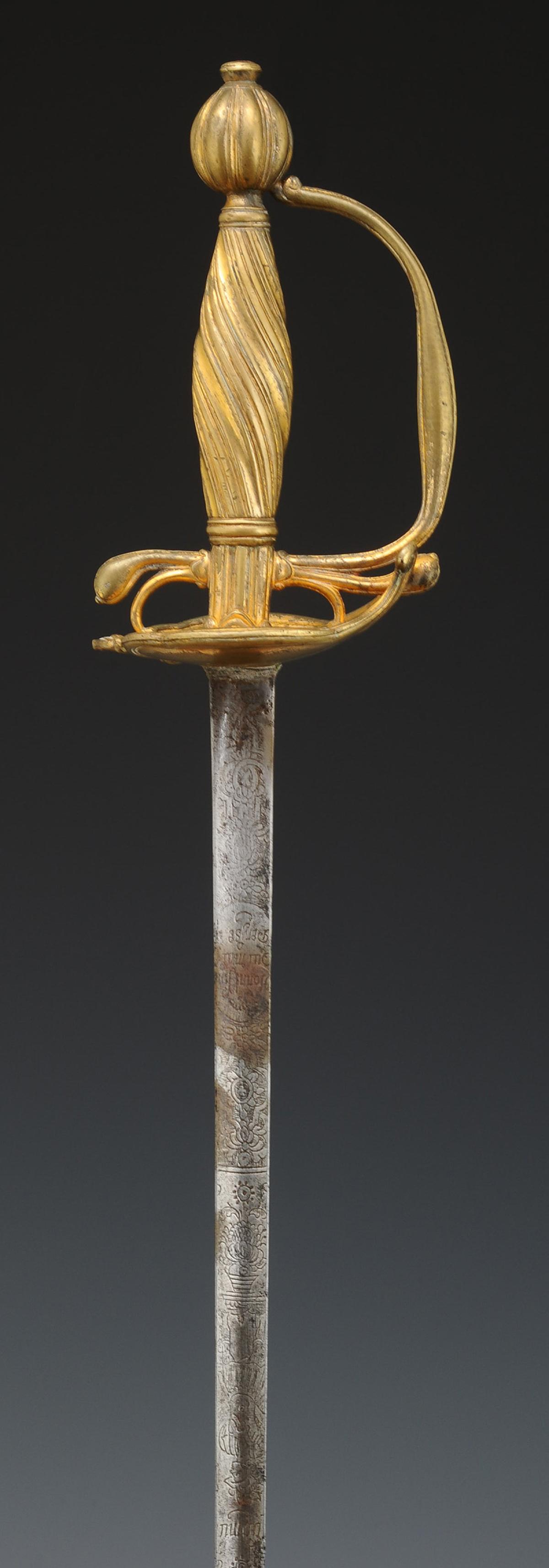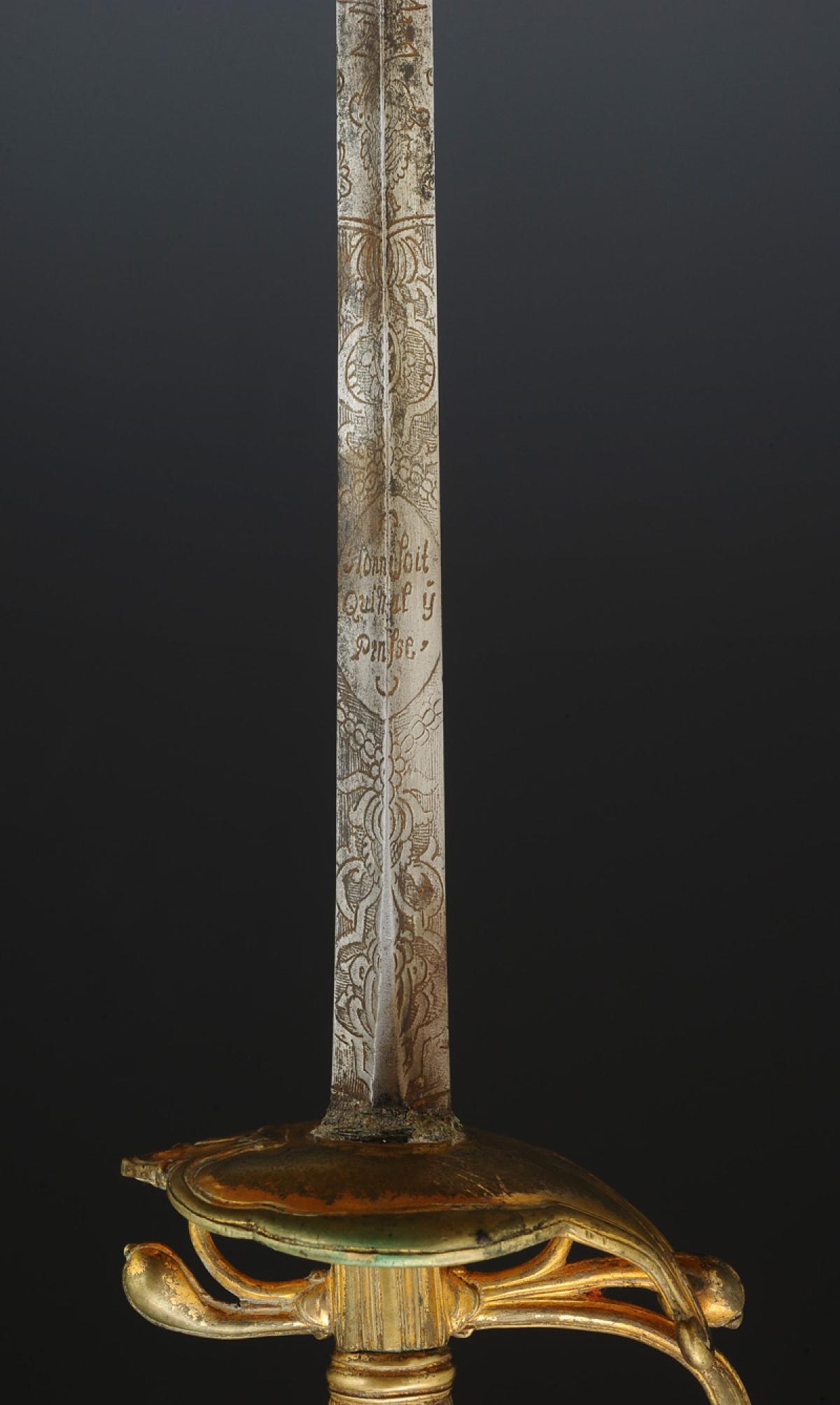 Monture en laiton doré. Garde à une branche décorée aux traits. Pommeau, poignée et croisière décorés en relief de torsades. Clavier à annelets. Double quillon inversé. Clavier bivalve bordé d'une moulure en relief. Lame triangulaire blanche gravée sur ses deux-tiers de motifs floraux, de l'inscription « Honni soi / Qui mal ÿ / Pense », d'un guerrier antique en pied, ... Longueur de la lame 58,7 cm.