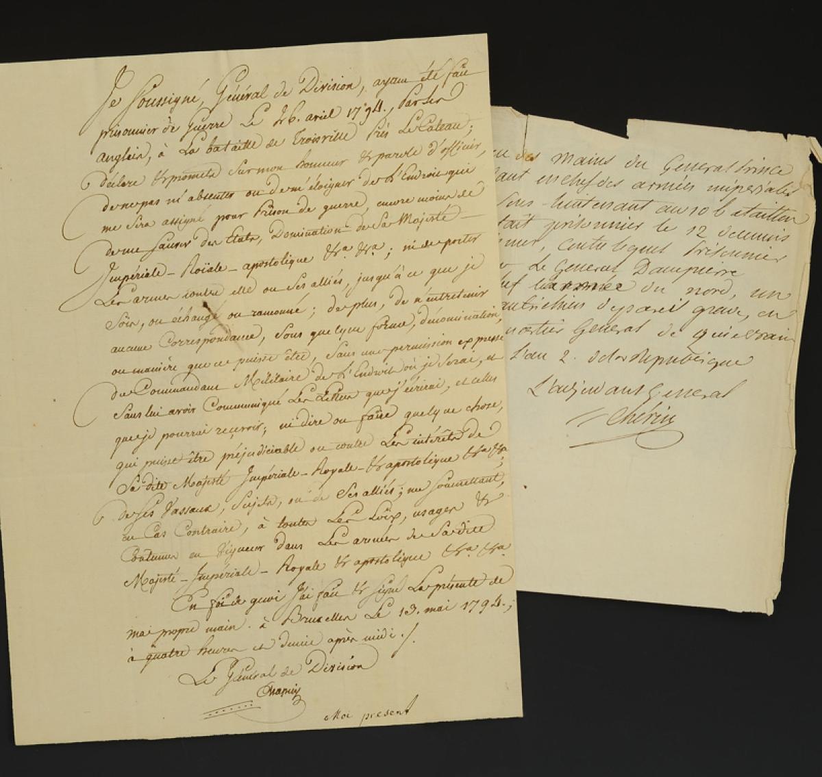 Prisonniers de guerre. Armée du Nord. DEUX ENGAGEMENTS AUTOGRAPHES SUR L'HONNEUR, L'UN SIGNÉ DU GÉNÉRAL DE DIVISION CHAPUY * (CHAPUIS) (1794), LE SECOND SIGNÉ DE L'ADJUDANT GÉNÉRAL CHÉRIN (1793). 18910-31