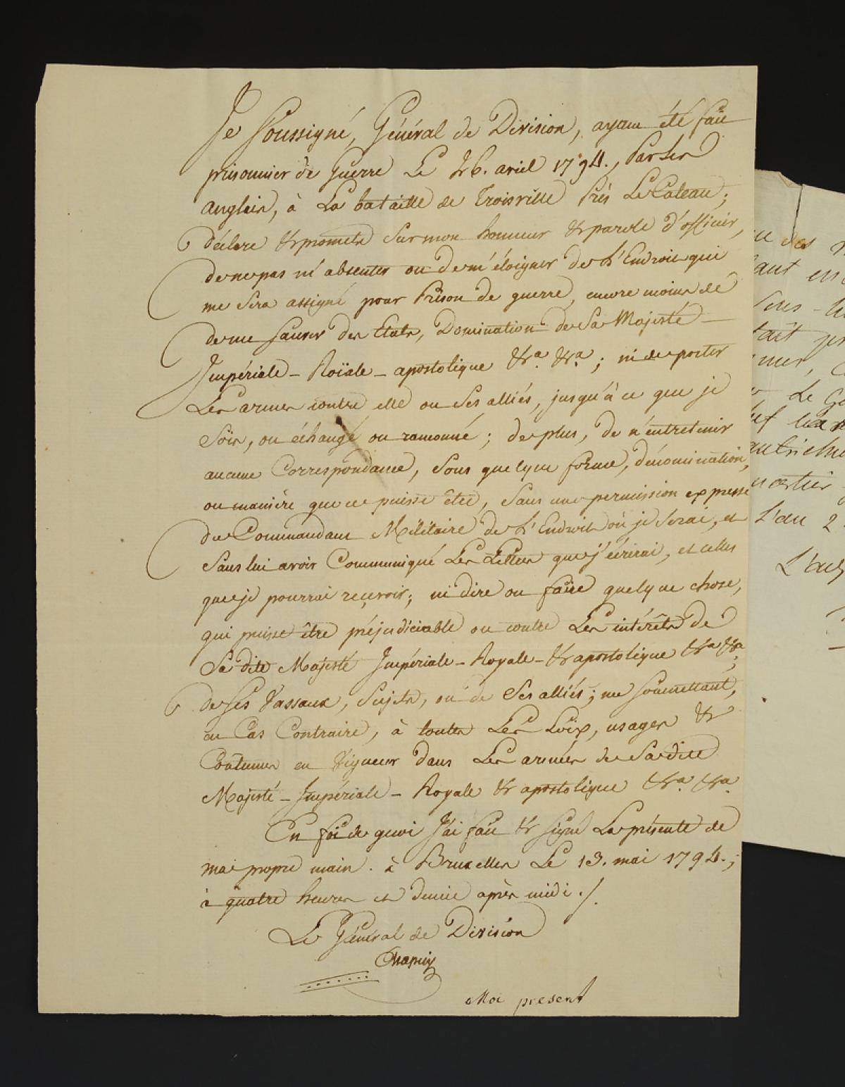 Il s'engage sur « l'honneur de parole d'officier, de ne pas m'absenter ou de m'éloigner de l'endroit qui me sera assigné pour prison de guerre, encore moins de me sauver des 2tats, domination de Sa Majesté Impériale, Roïale, apostolique [...] ni de porter l'arme contre elle [...]