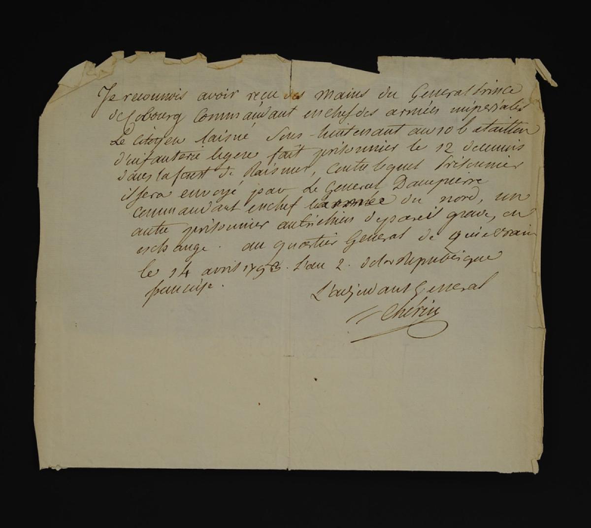- On y joint un autre engagement sur l'honneur signé le 14 avril 1793 par l'Adjudant général CHÉRIN, qui « reconnait avoir reçu des mains du général Prince de Cobourg, commandant en chef des armées impériales, le citoyen Laisné, sous-lieutenant au 10e bataillon d'infanterie légère, fait prisonnier le 12 de ce mois dans le port de Raismer, contre lequel prisonnier il sera envoyé par le général Dampierre, commandant en chef de l'Armée du Nord, un autre prisonnier autrichien de pareil grade, en échange.