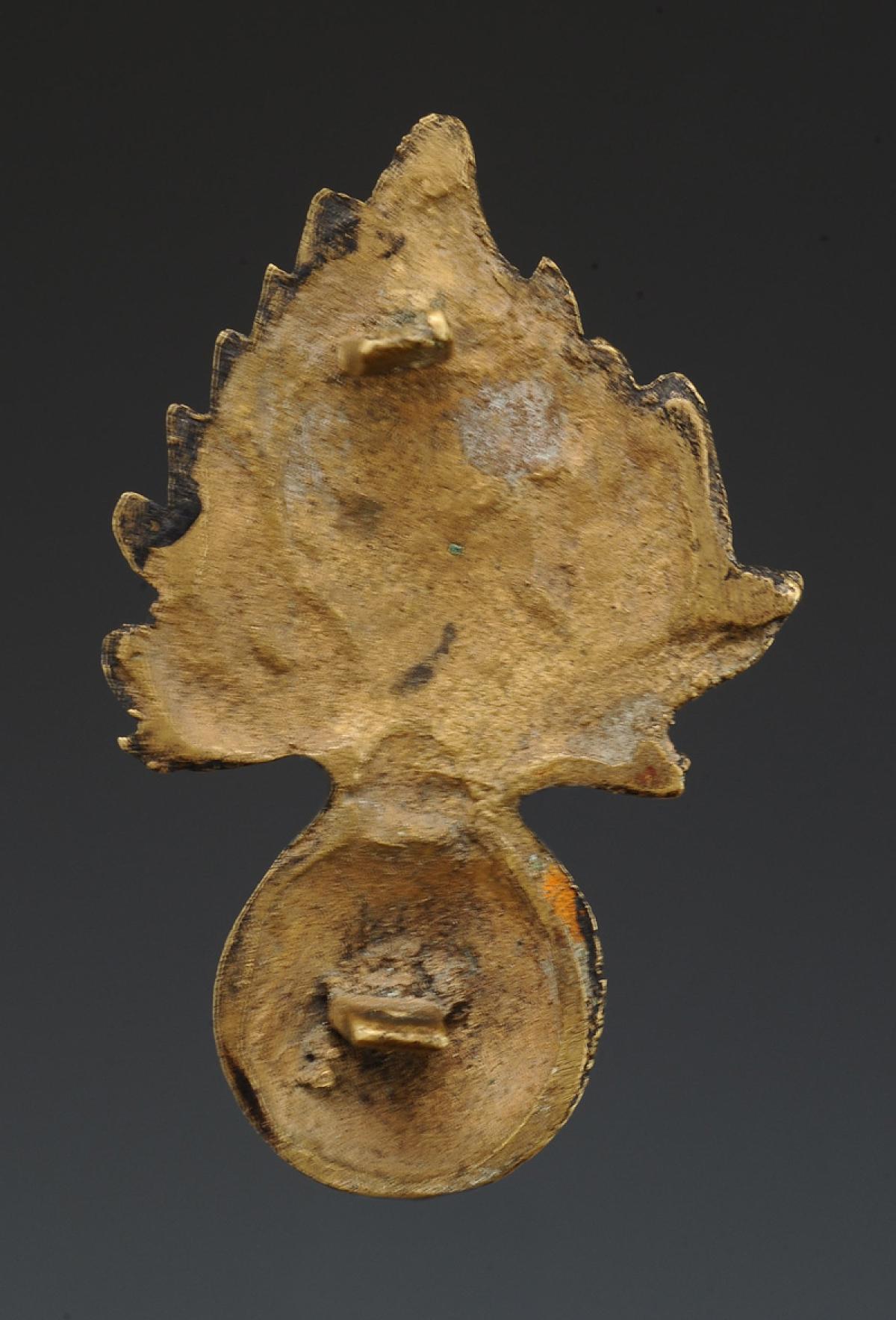 En laiton fondu, H 7,9 cm x 4,5 cm. Complète de ses deux pontets de fixation arrière.