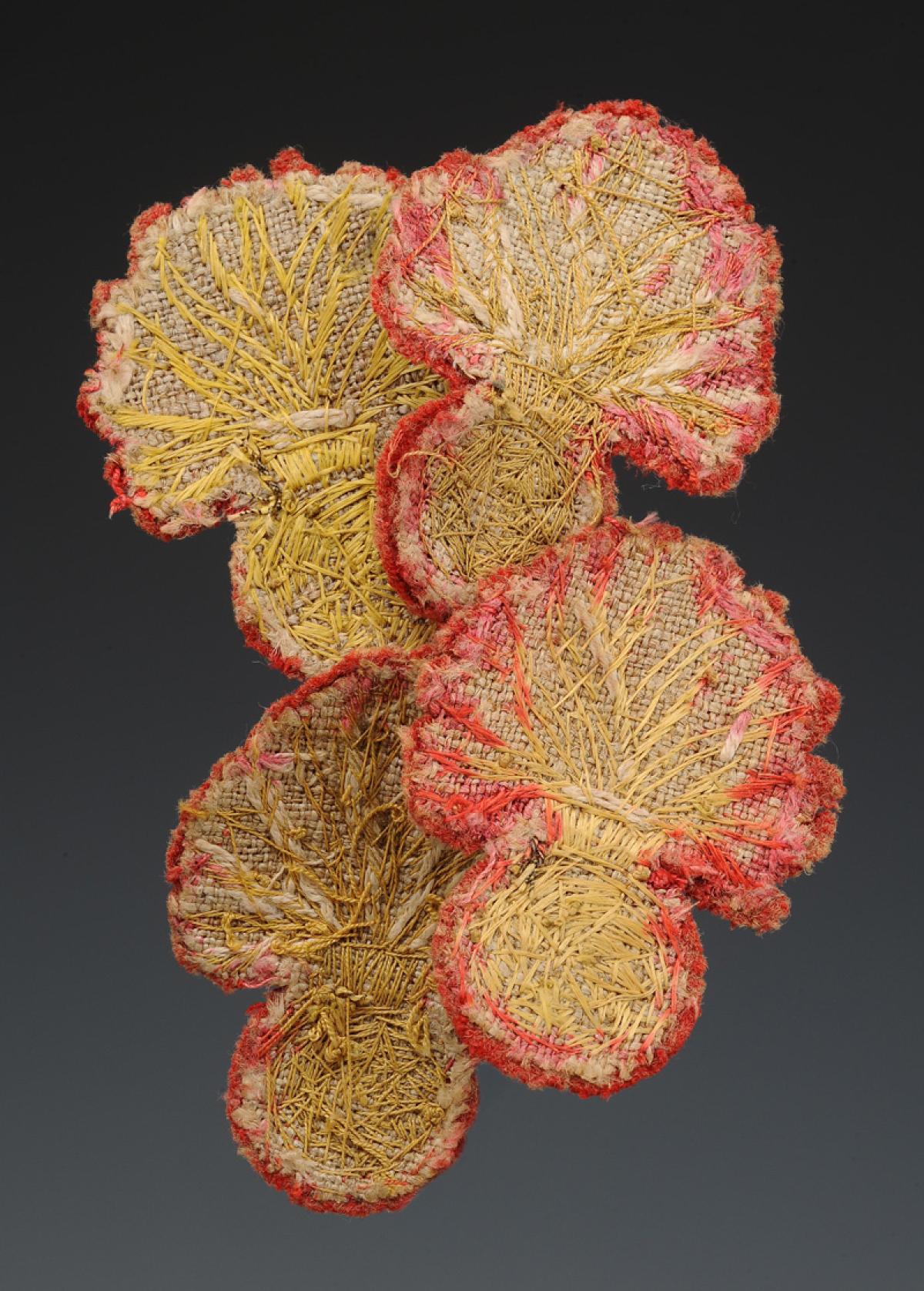 En cannetilles dorées, brodées sur fond de drap écarlate. H 6,5 cm x 4,5 cm.
