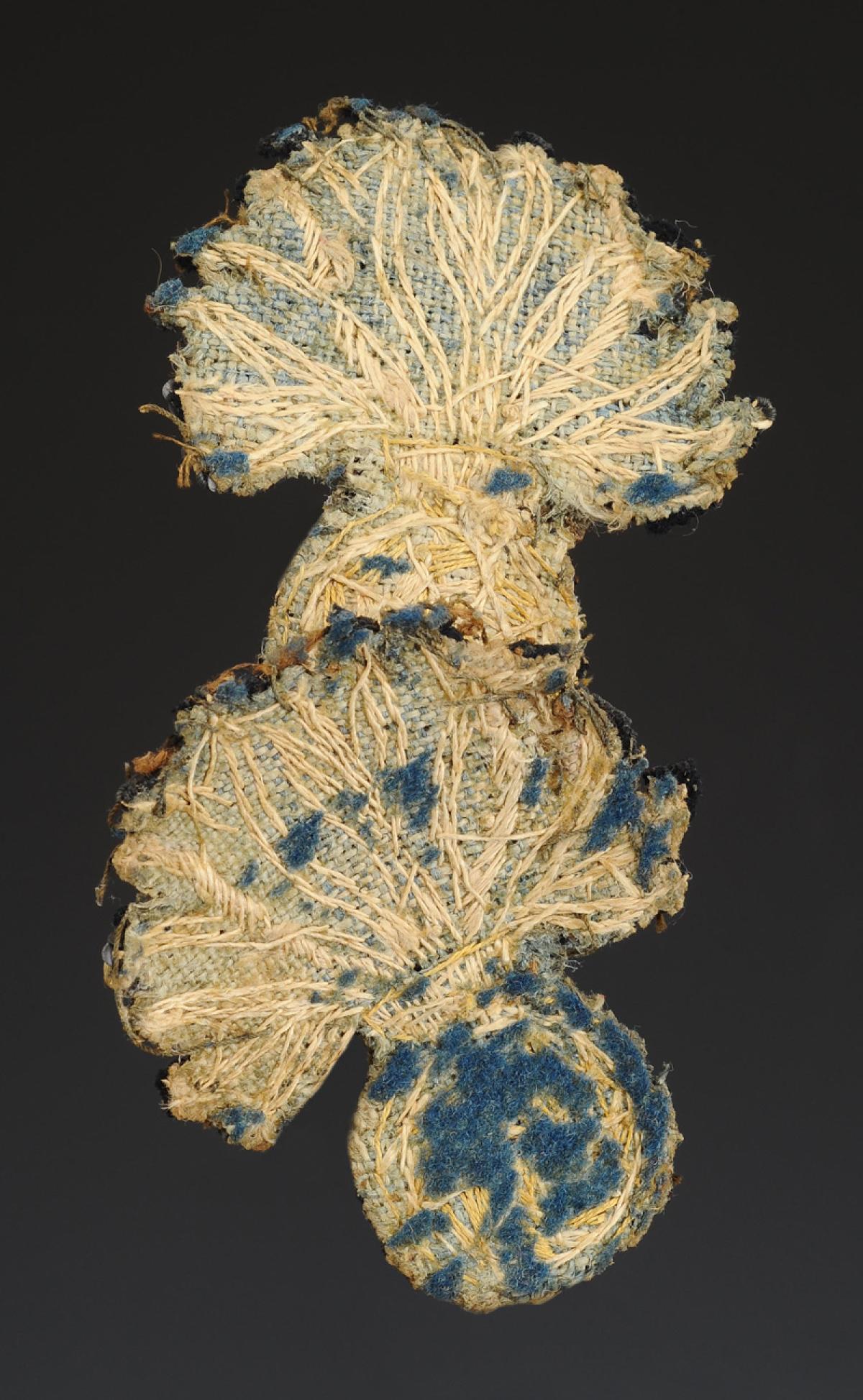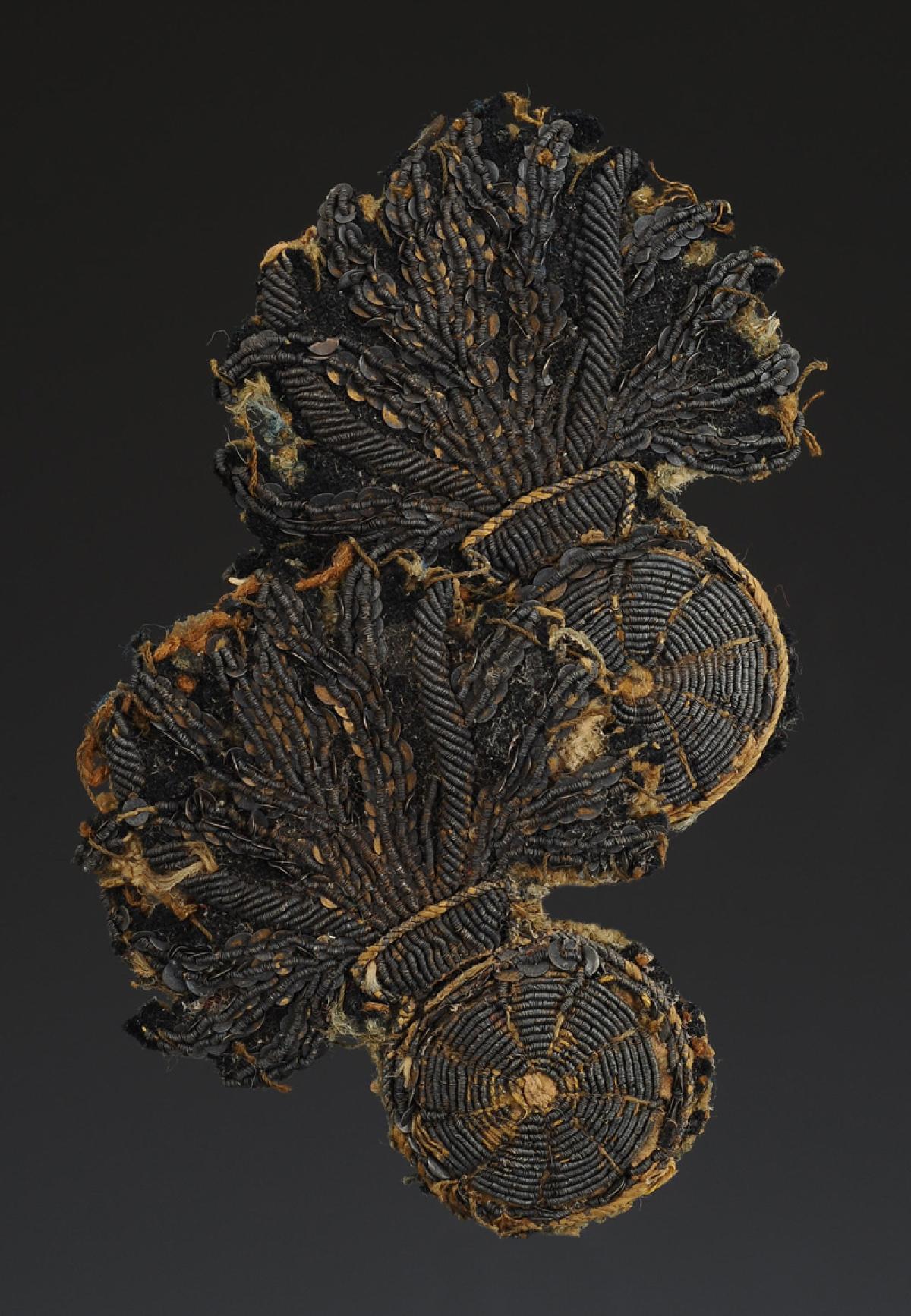Grenades brodées en fils d'argent sur fond de drap bleu foncé. H 6,5 cm x 5,5 cm.