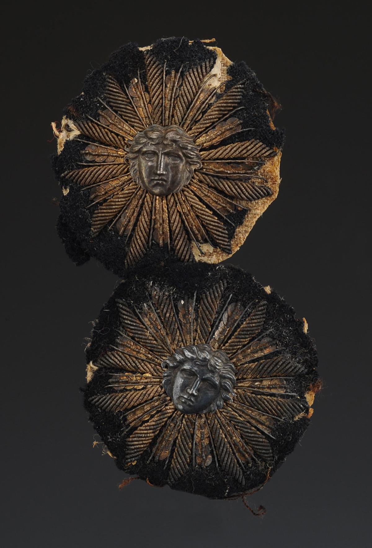 Soleil brodé en fils et sequins d'argent avec visage du soleil estampé en argent, monté sur drap bleu foncé. Ø 4,5 cm.