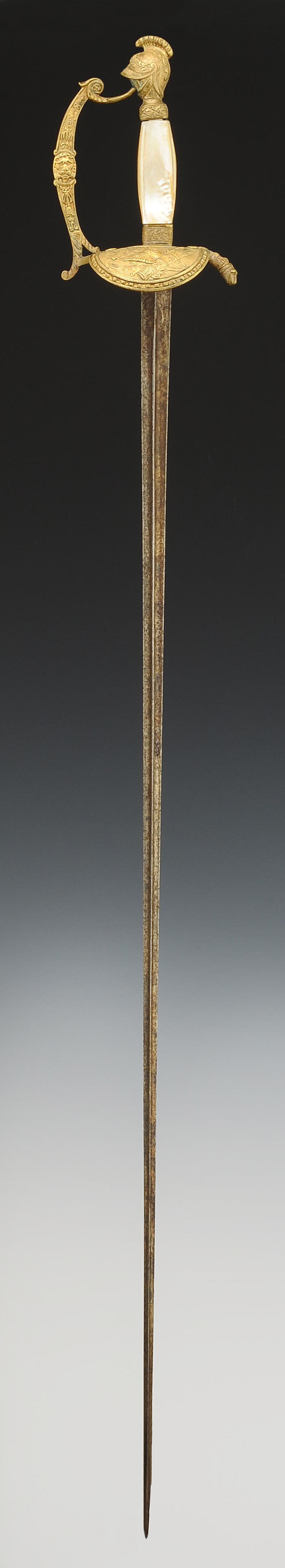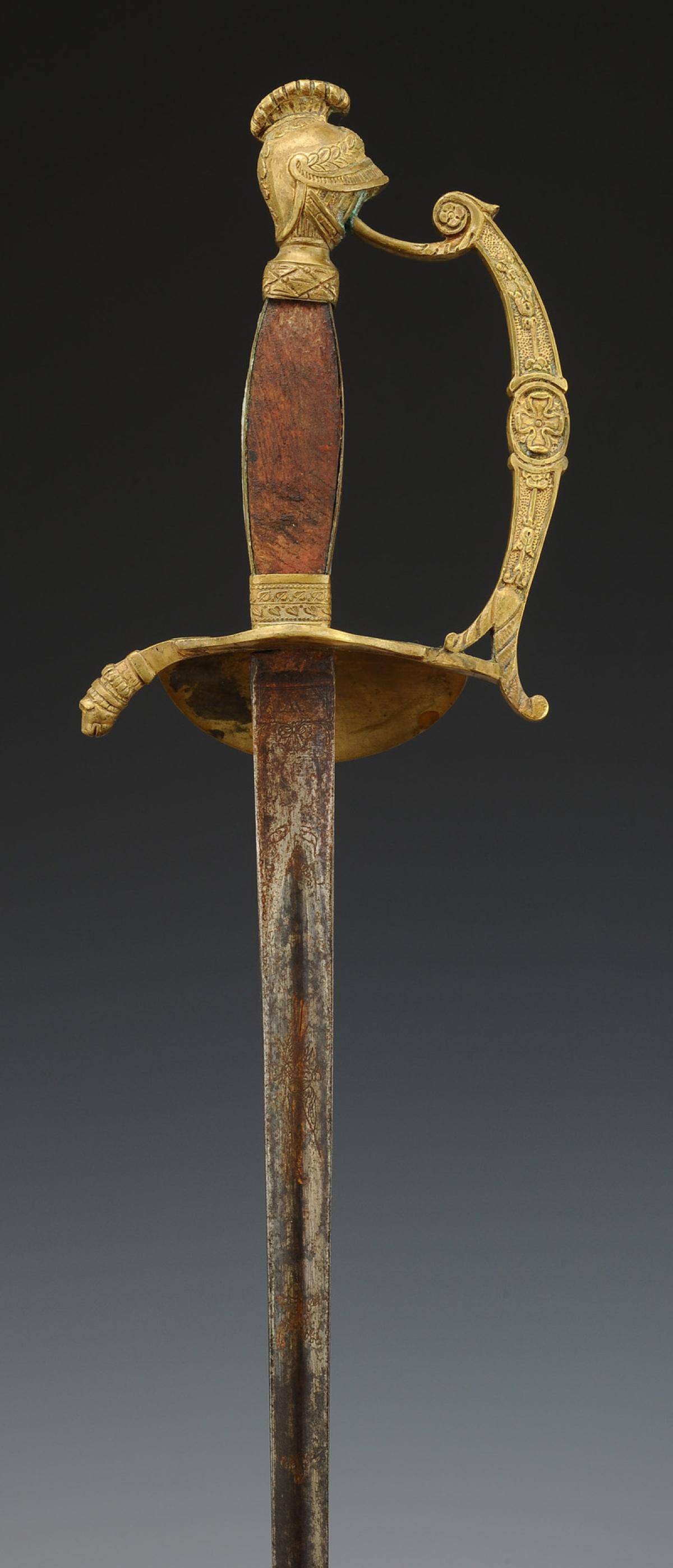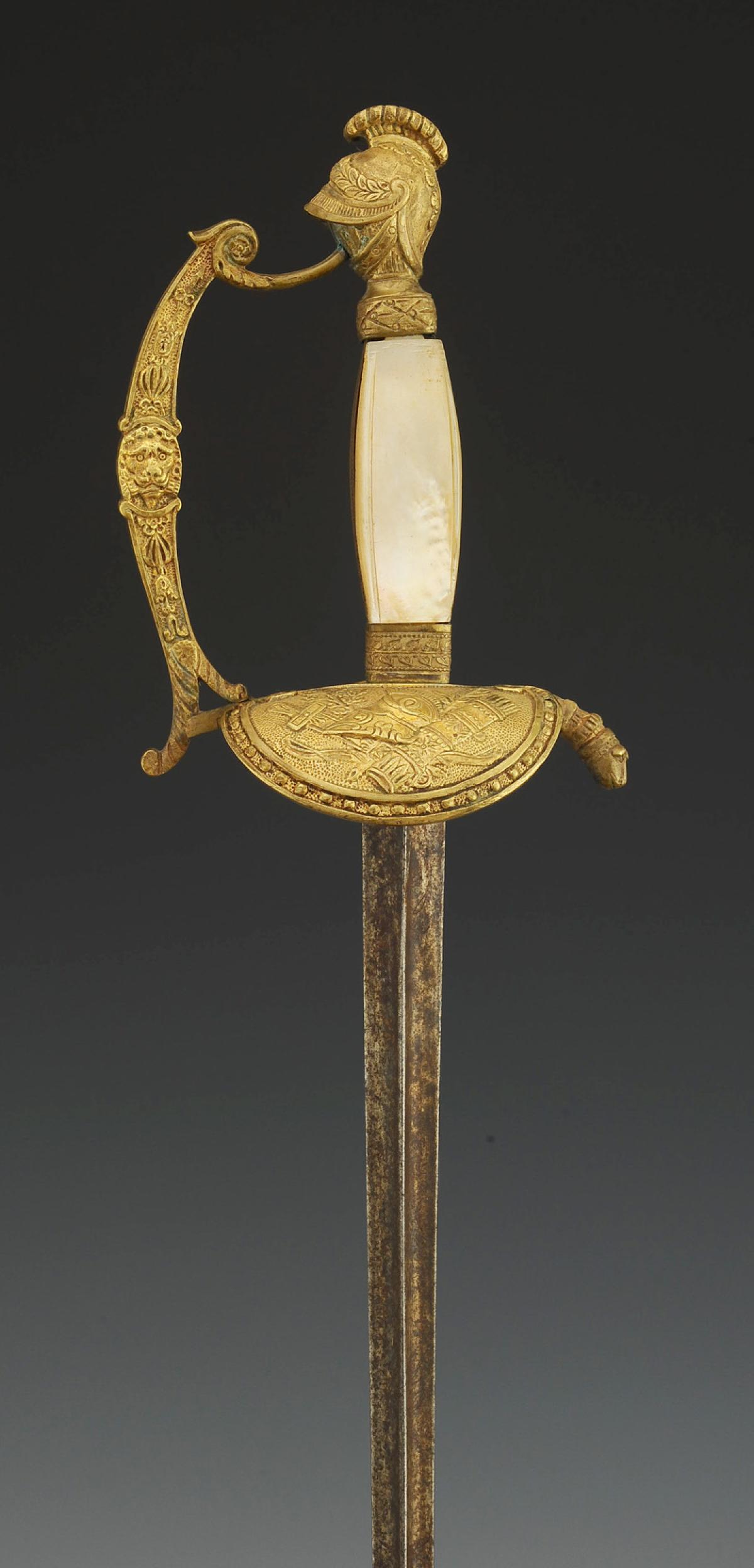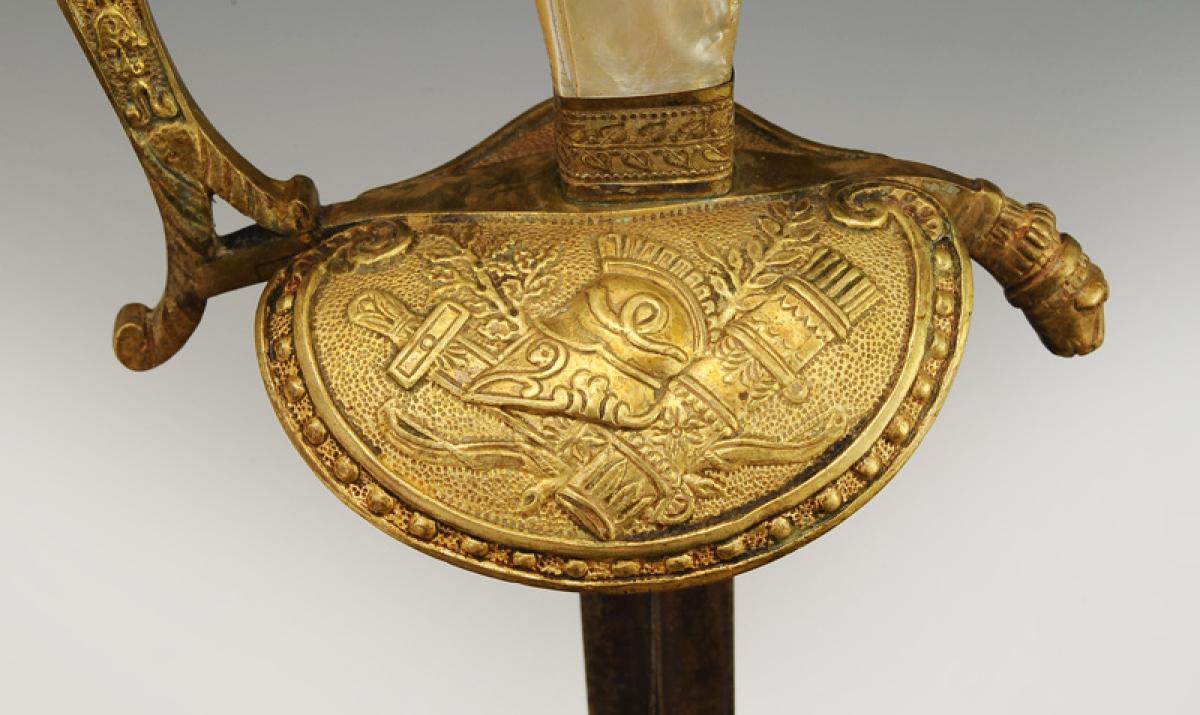 Monture en bronze doré. Garde à une branche décorée du lion de Némée sur sa face externe. Clavier en forme de bouclier à bordure perlée, moulé en son centre d'un casque empanaché posé sur un carquois, un arc et un glaive, symboles des aides de camp. Pommeau en forme de casque antique empanaché. Poignée en bois à plaquettes de nacre et baguettes latérales de laiton doré décorées d'une suite de fleurs. Viroles en laiton. Lame triangulaire, longueur 79 cm.