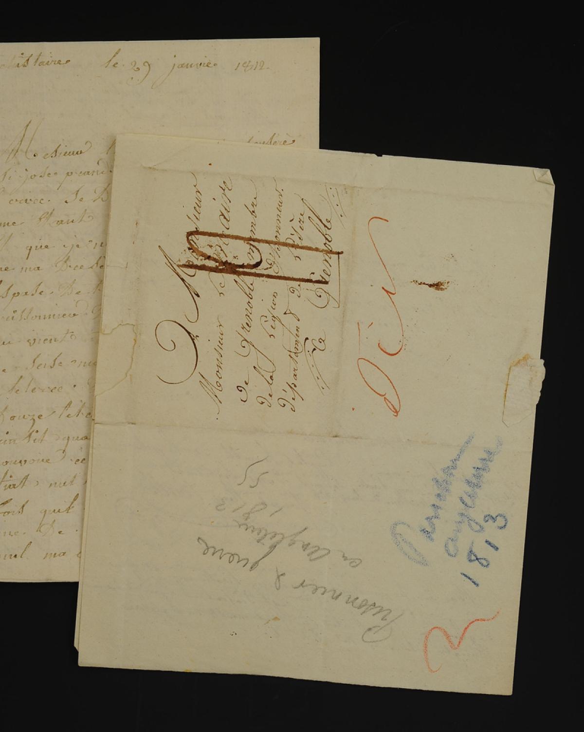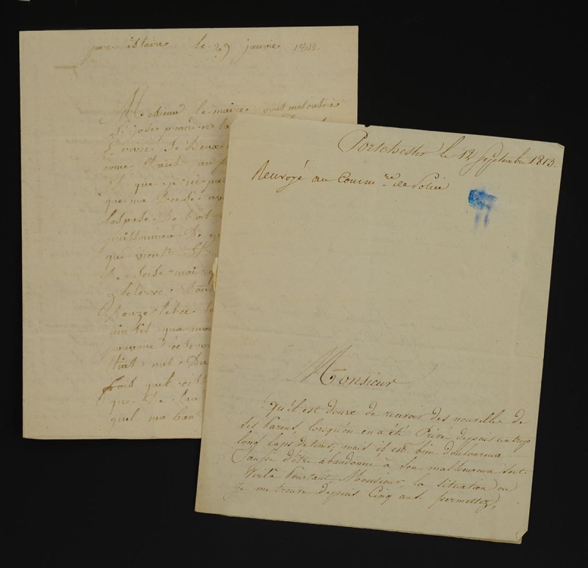 Prisonnier de guerre en Angleterre. LOT DE DEUX LETTRES DU SOLDAT JOSEPH REY PIROLLE, PRISONNIER À PORCHESTER, ADRESSÉES AU MAIRE DE GRENOBLE POUR OBTENIR DES NOUVELLES DE SES PARENTS, 29 janvier 1812 et 12 septembre 1813. 18910-34