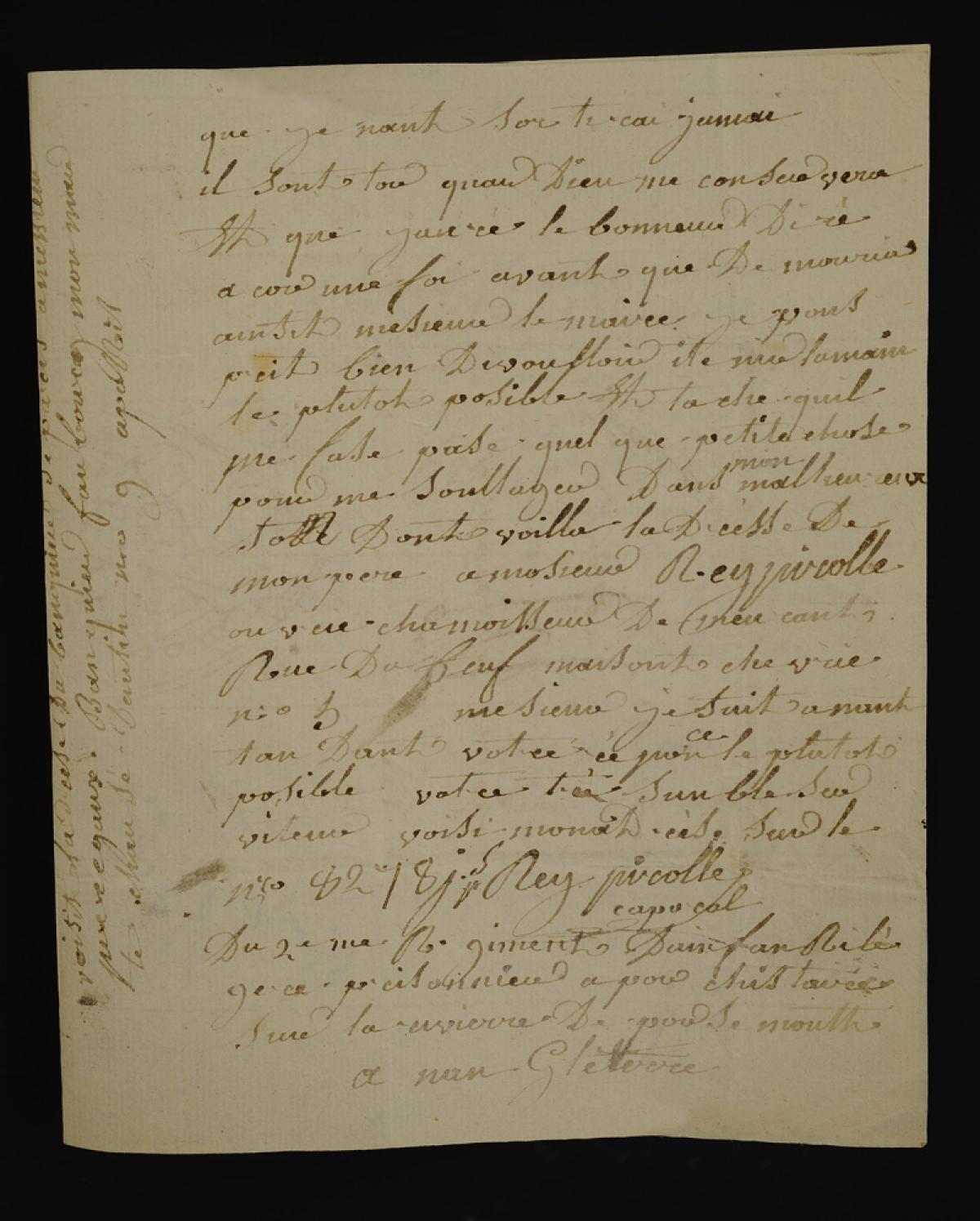 Je n'ai point reçu de nouvelles de mes parents depuis très longtemps quoique leur ayant écrit continuellement craignant qu'ils n'aient payé le tribut à la nature car je ne puis m'imaginer d'où provient un si grand retard, j'ose vous prier de vouloir bien me tirer de l'inquiétude où je suis en me donnant de leur nouvelle. Ce service signalé que j'attends de vous m'imposera une reconnaissance qui ne finira qu'avec ma vie. Je suis Monsieur dans une heureuse attente.