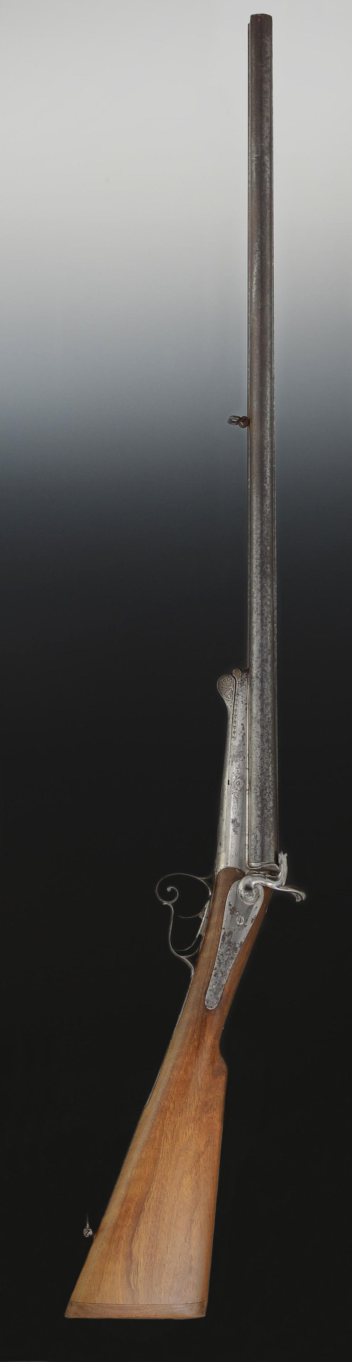 Double canon juxtaposé. Platine signée sur un côté « Meyer », et sur l'autre côté « A St Etienne ». Chien à broche. Crosse en noyer. Canons bleuis.