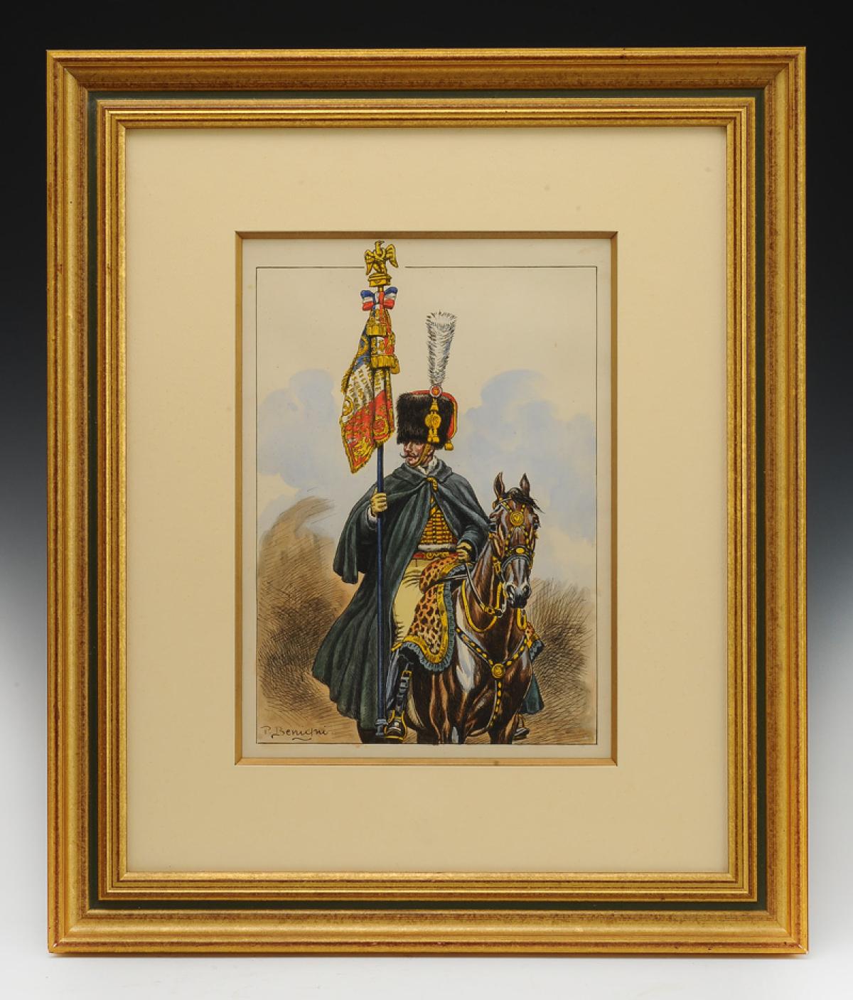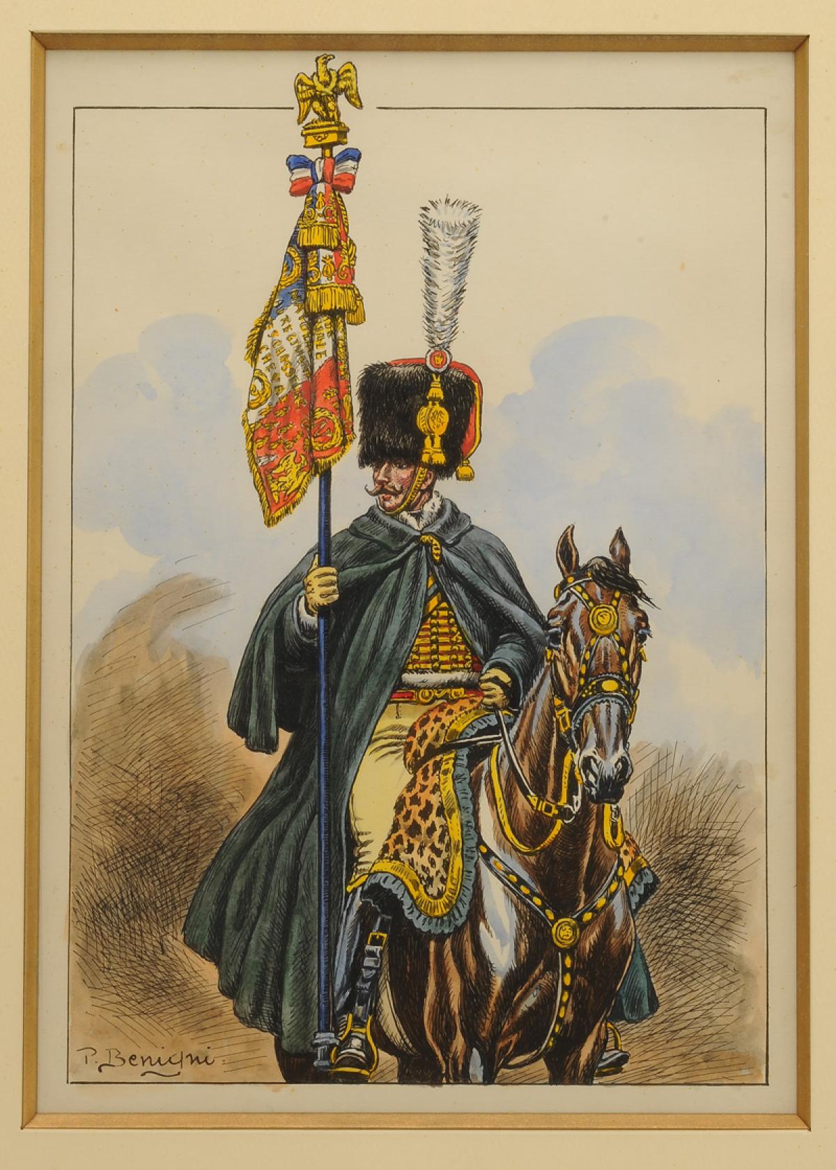 BEGNINI Pierre (1877-1956) – Lieutenant porte-étendard des chasseurs à cheval de la Garde Impériale, vers 1813, Premier Empire : aquarelle originale. 33373