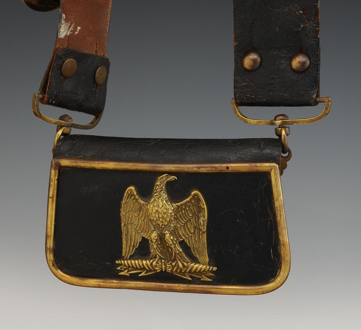 Pattelette en cuir verni noir bordé d’un jonc en laiton lisse, décorée en son centre d’une aigle en laiton non couronnée. H de la pattelette 9,5 cm x 16 cm.