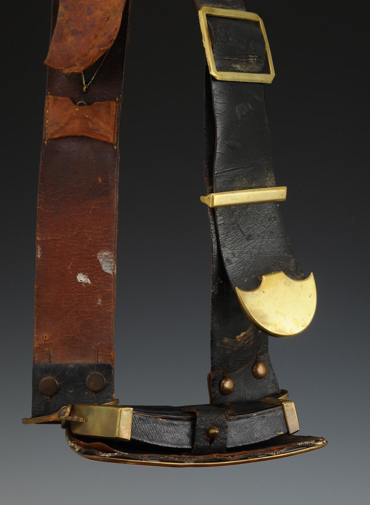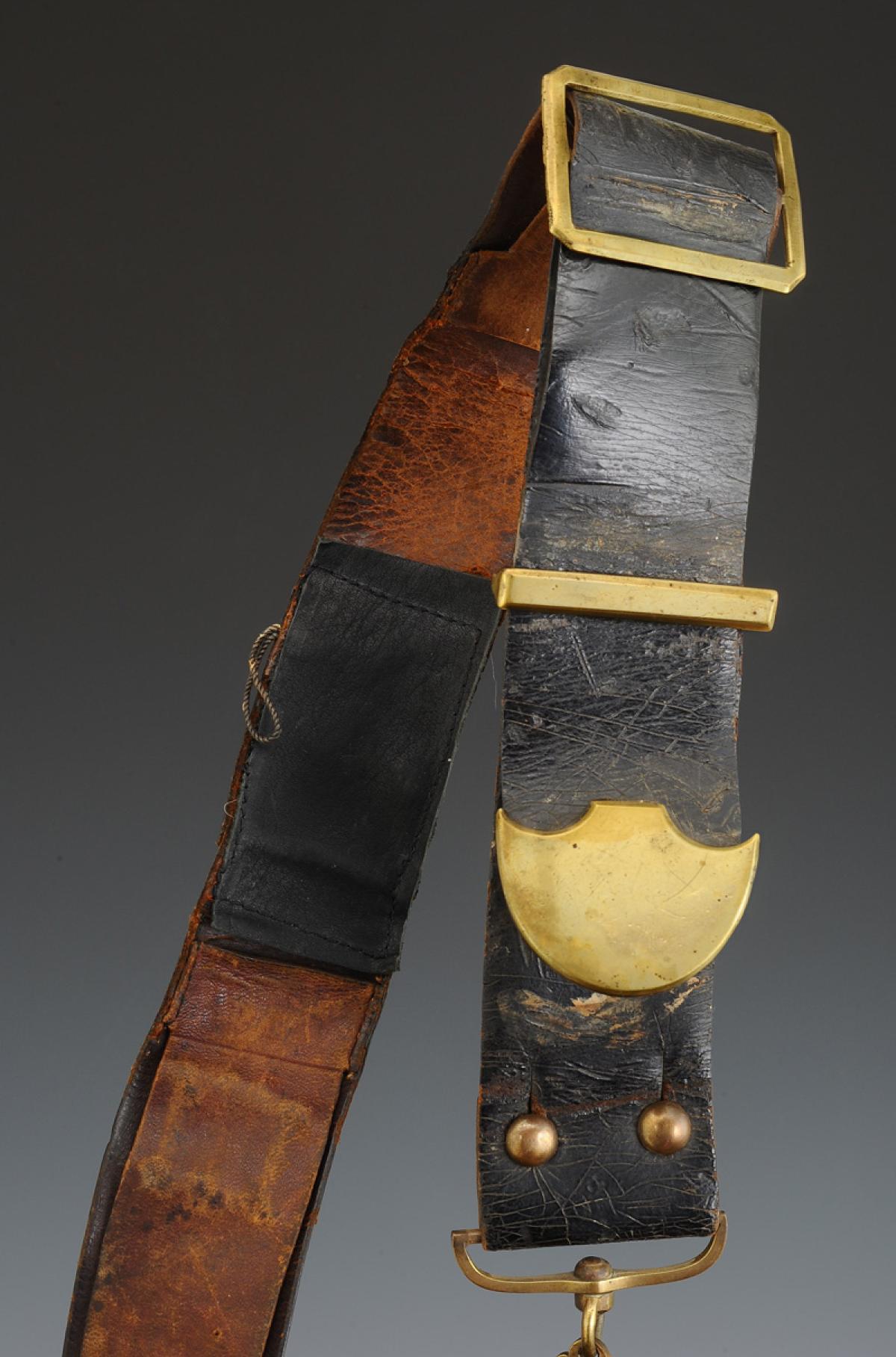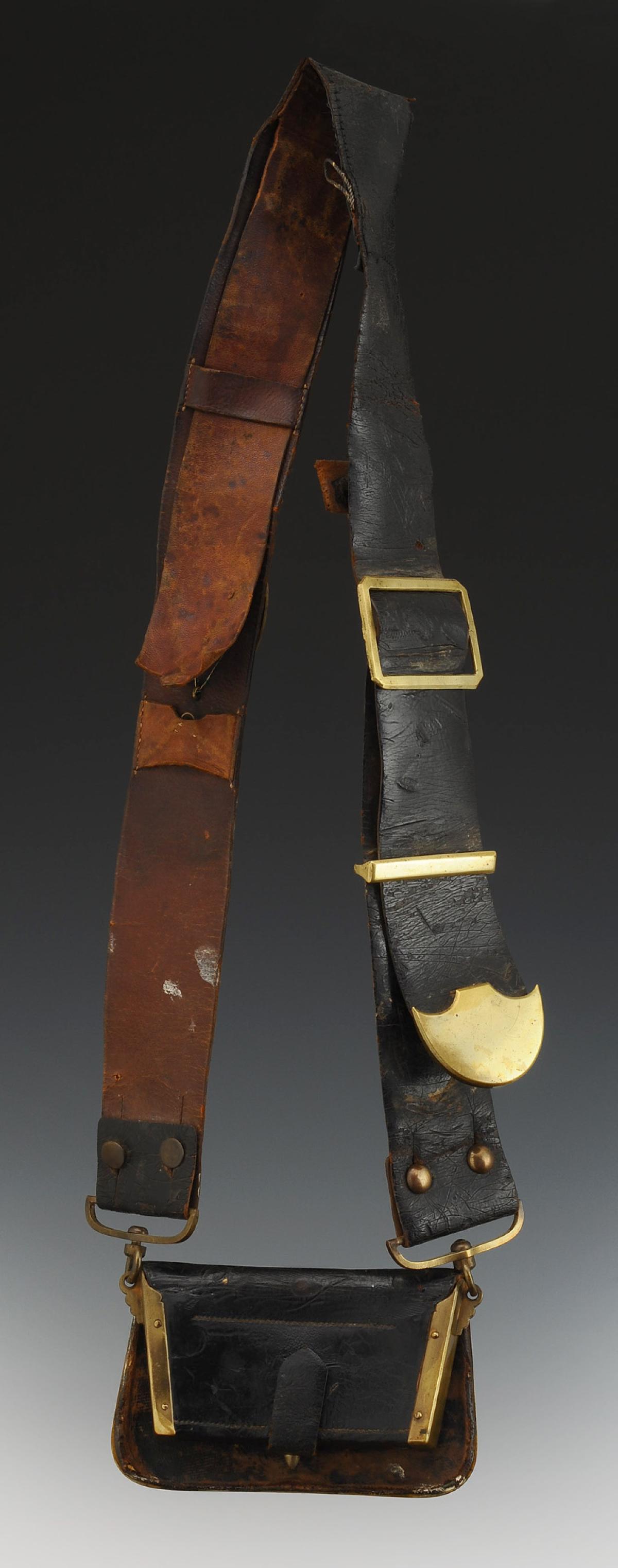 Banderole en cuir verni noir, largeur 5,5 cm, à garnitures en laiton avec écusson décoré d’une aigle surmonté d’une tête de lion, reliés entre eux par trois chaînettes gourmette.