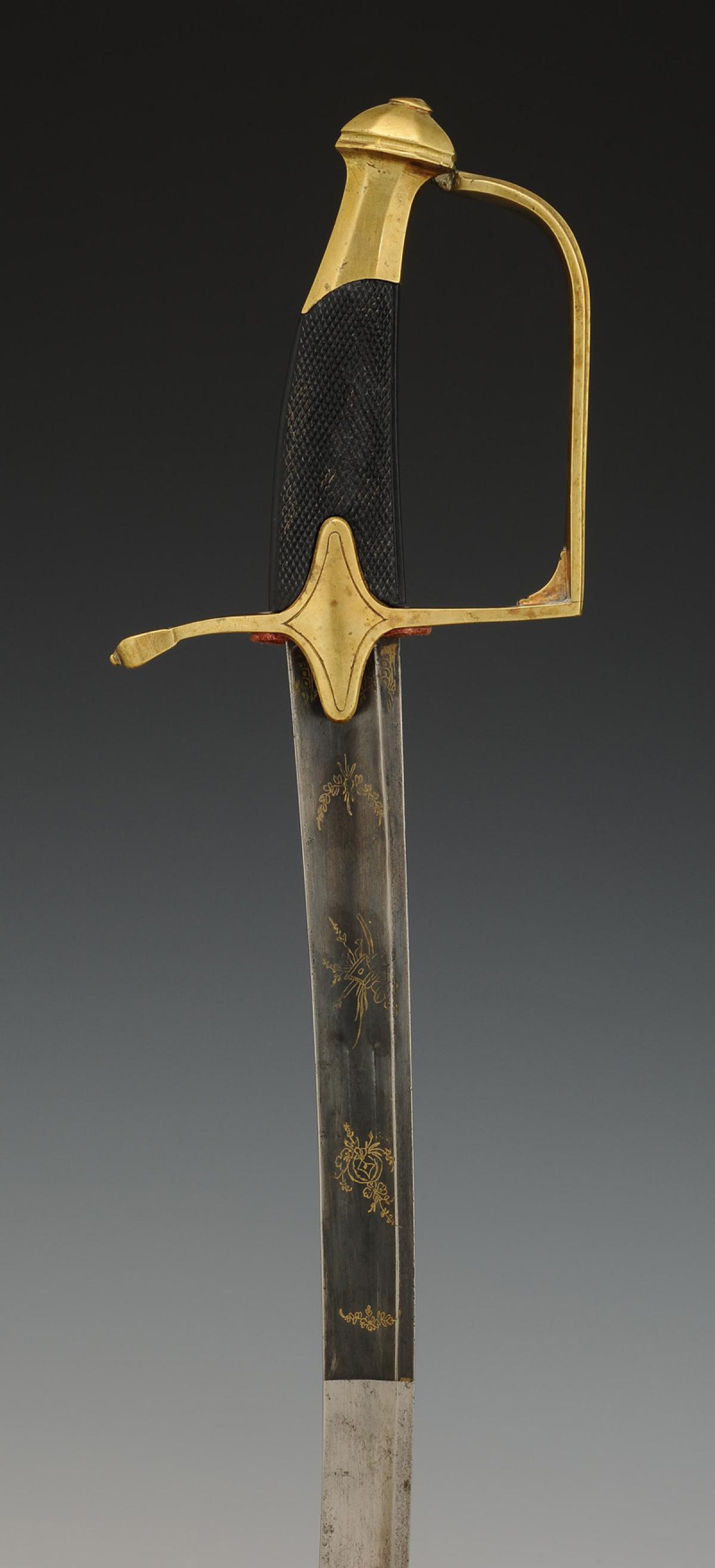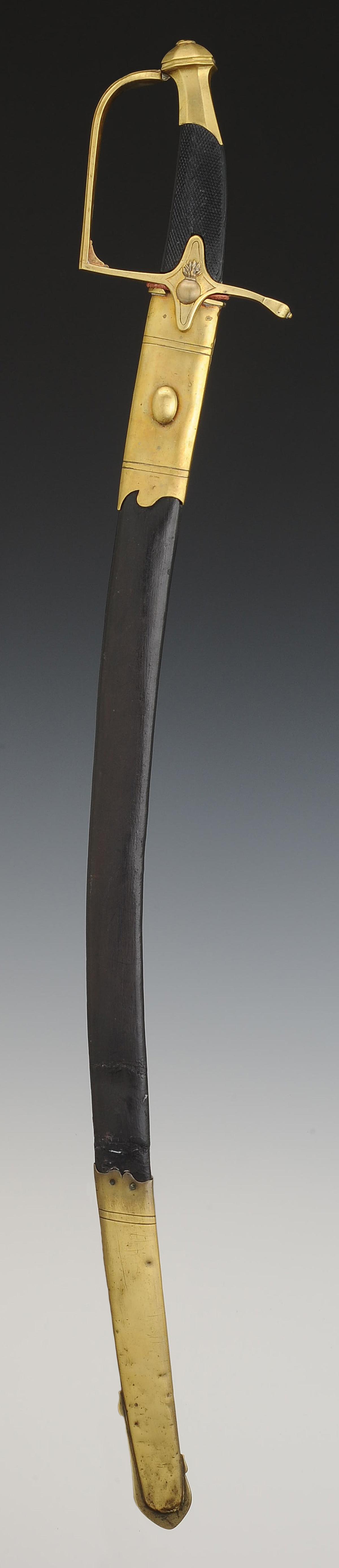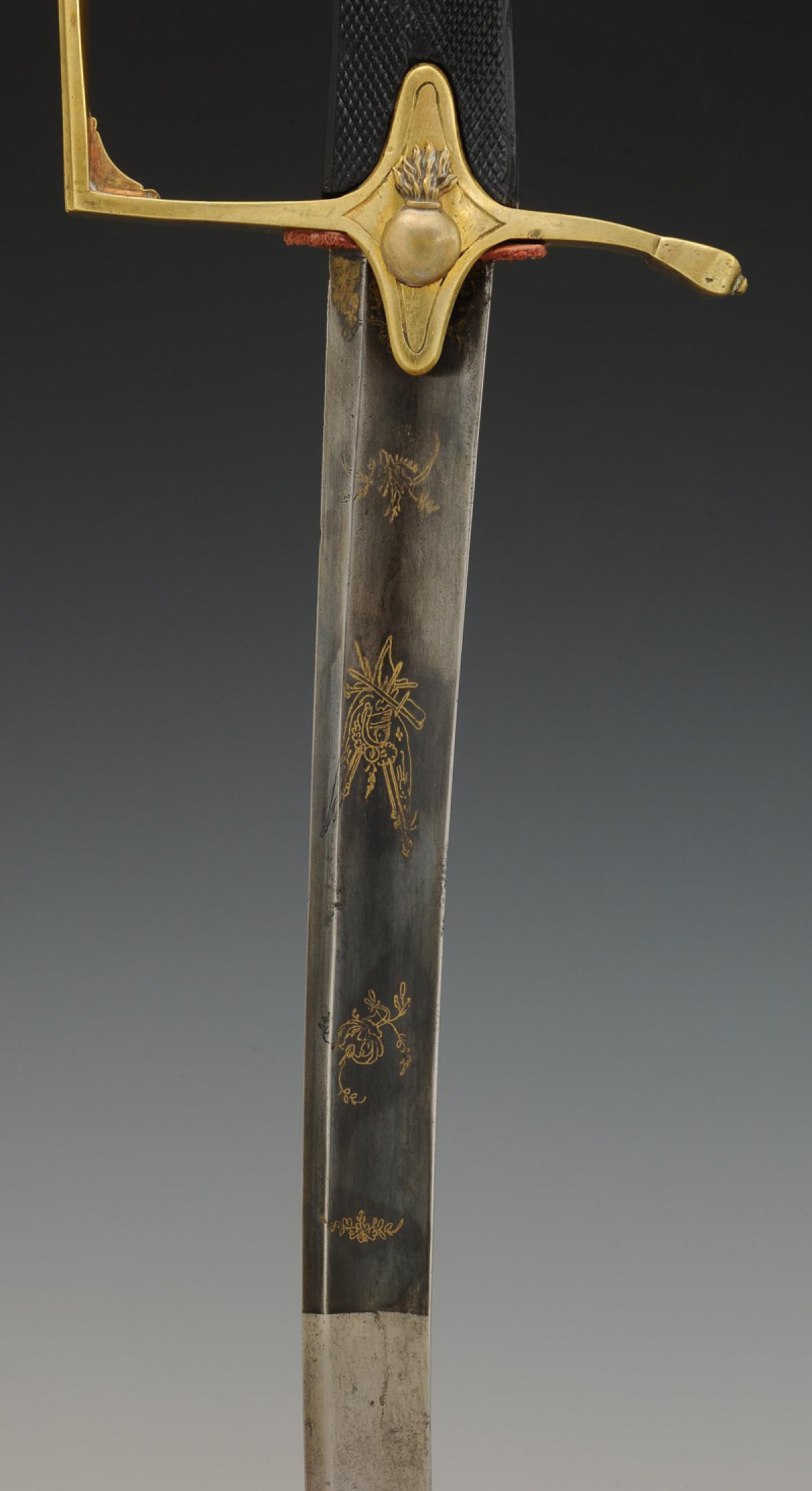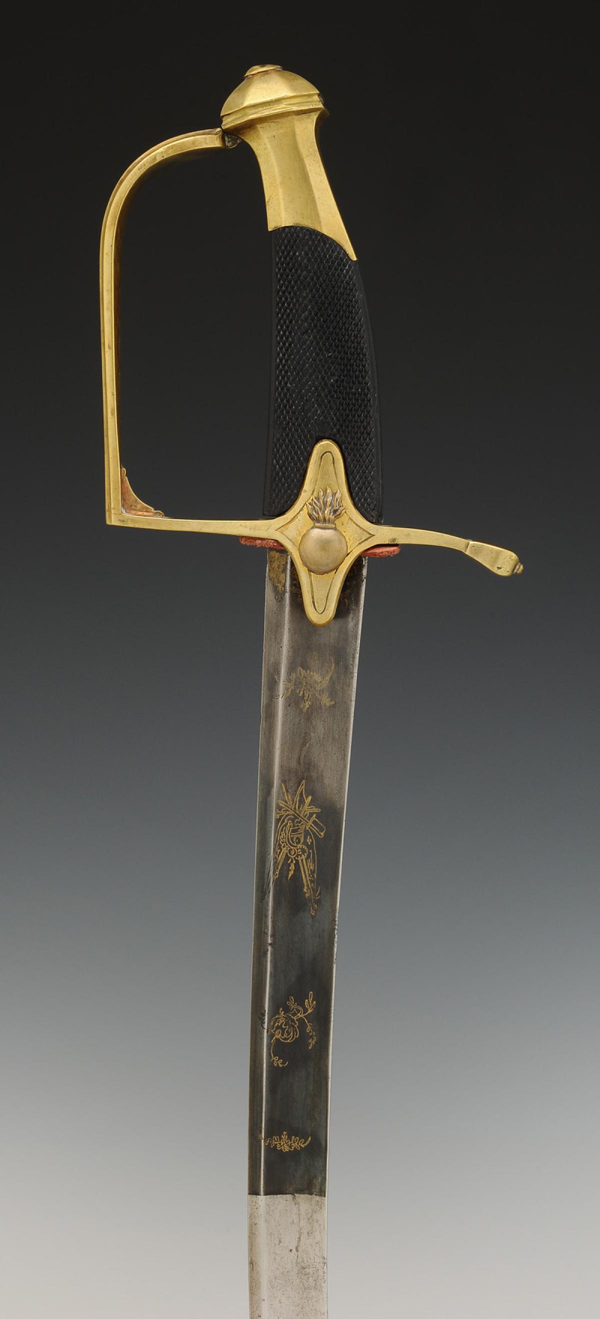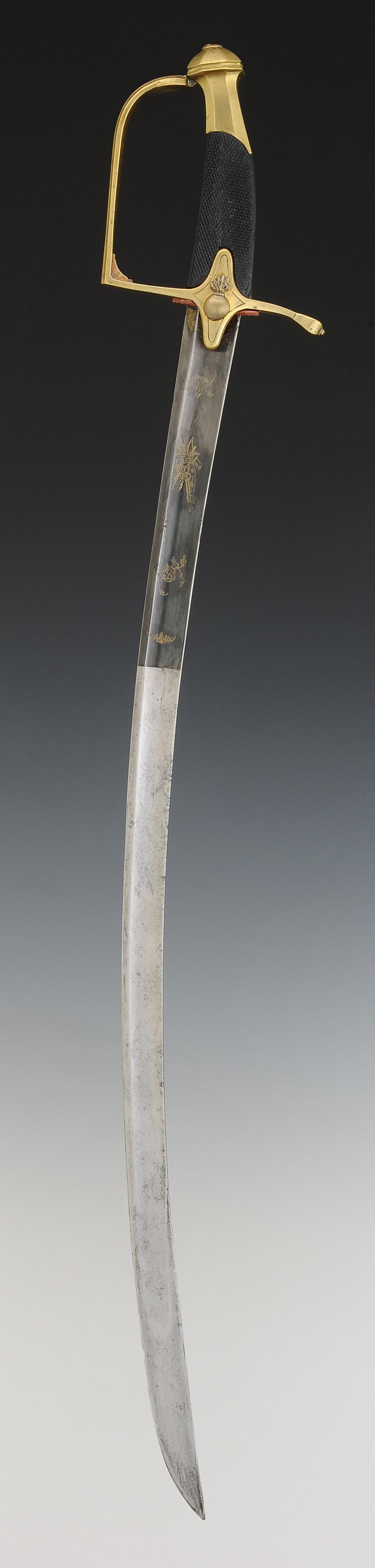 Monture en laiton. Garde à une branche à facettes et décor aux traits. Calotte à courte queue. Poignée d'ébène finement quadrillé. Croisière décorée d'une bombe enflammée en métal argenté. Lame courbe à pans creux, de 67,1 cm de longueur, gravée sur son premier tiers de trophées militaires et floraux dorés à fond bleui. Cravate en cuir. Fourreau en cuir verni noir à deux garnitures de laiton décorées aux traits aux bords festonnés, bout du fourreau avec dard en laiton découpé en forme de lyre.