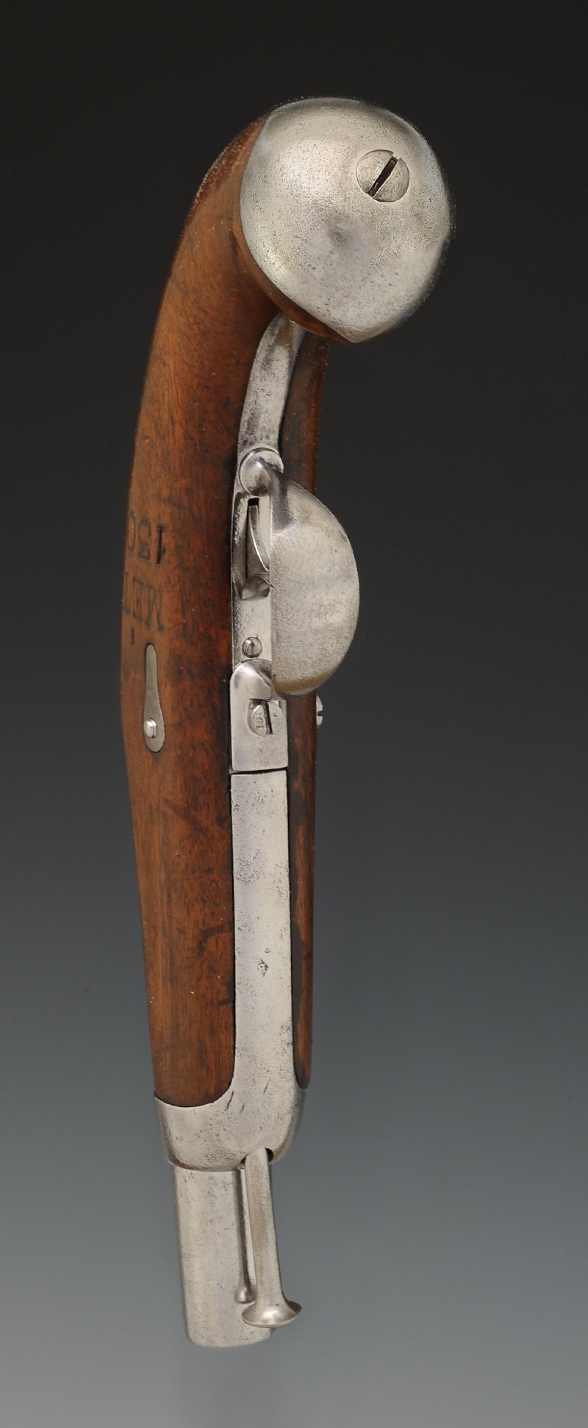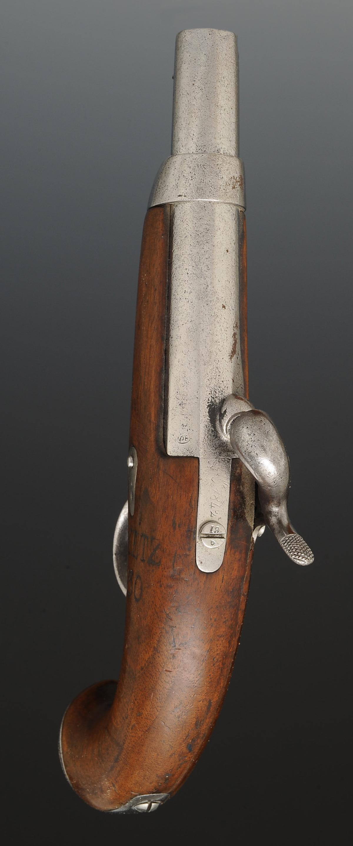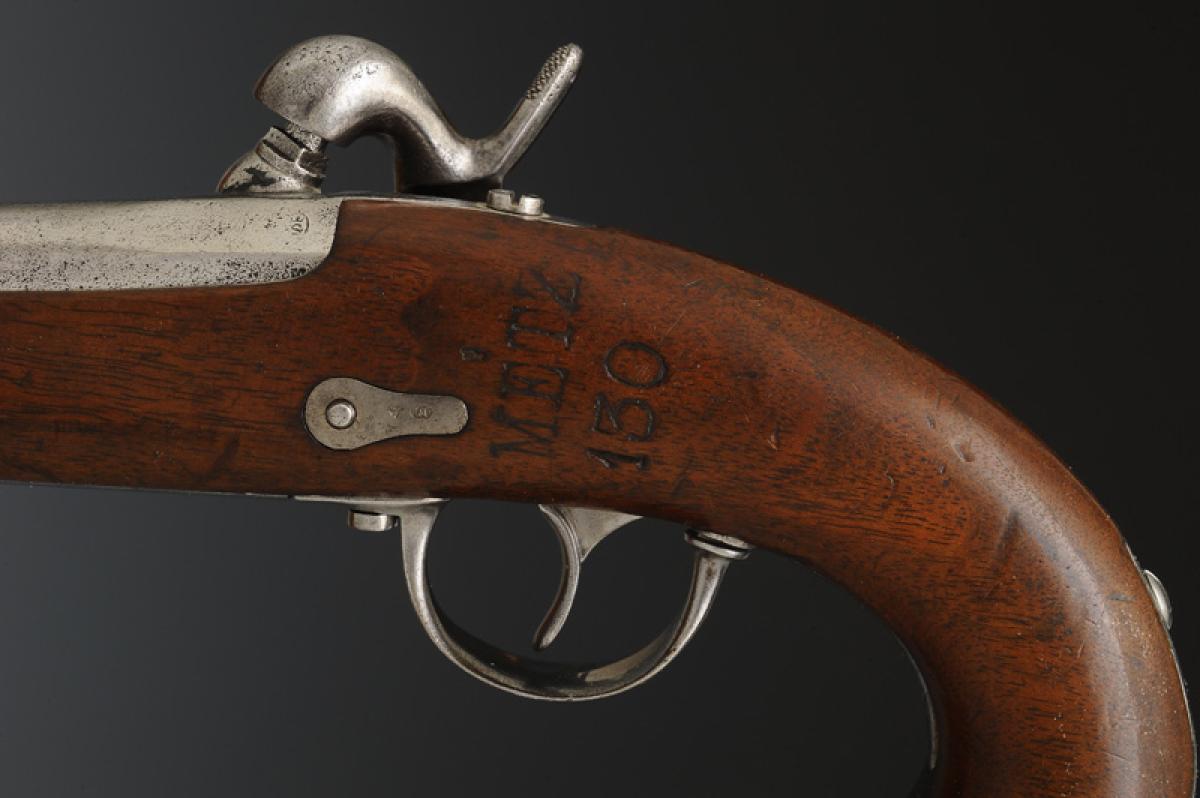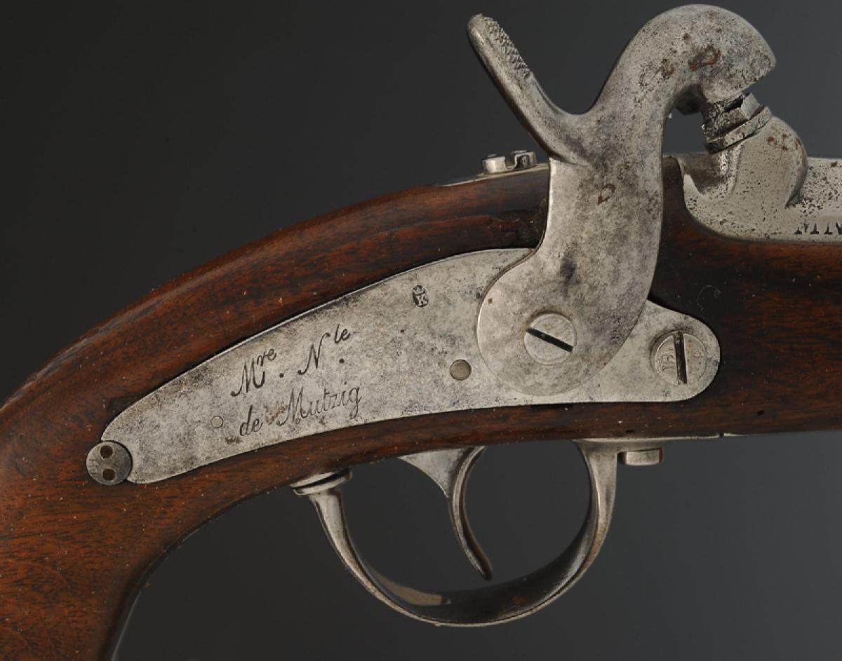Canon à cinq pans courts sans guidon ni hausse. Masselotte portant la grosse cheminée de guerre identique aux armes du système 42, marquée « MN » et poinçons difficilement lisibles. Longueur du canon 12,7 cm. Queue de culasse gravée « Mle 1842 », longueur avec la queue de culasse 16 cm. Calibre 15,2 mm. Platine modèle 1840 en arrière du chien signée « Mre Nle de Mutzig », poinçonnée du « K » sous couronne. Chien identique au pistolet modèle 1822T. Monture en noyer marquée « METZ / 130 », toutes garnitures en acier. Bride tenant la capucine en-dessous de la monture dans le prolongement de la sous-garde et du pontet, maintenue par la vis du pontet. Baguette du modèle 1822T.
